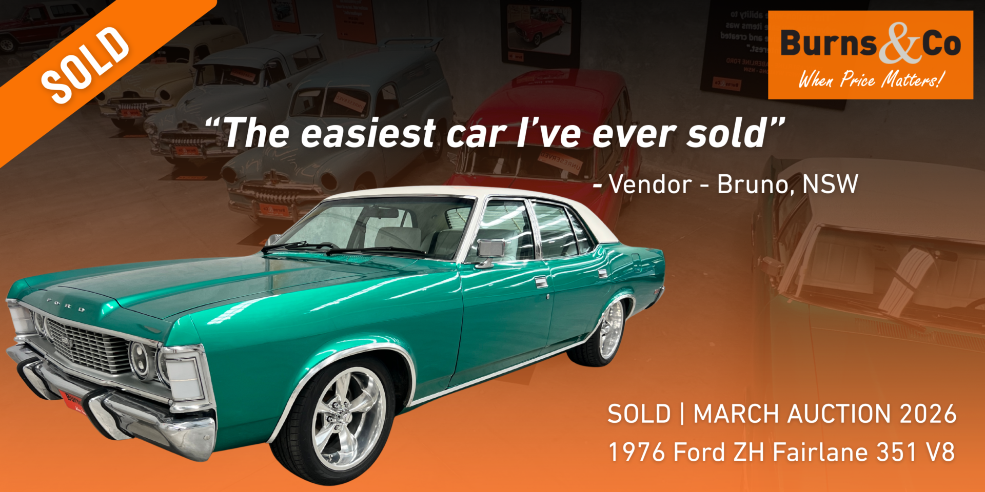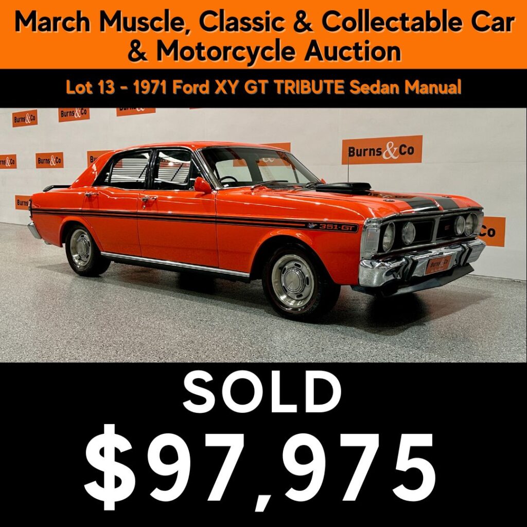 Selling in Night 1 of the March Classic & Collector Auction (16 March), Bruno’s Fairlane benefited from strong national exposure and competitive bidding.