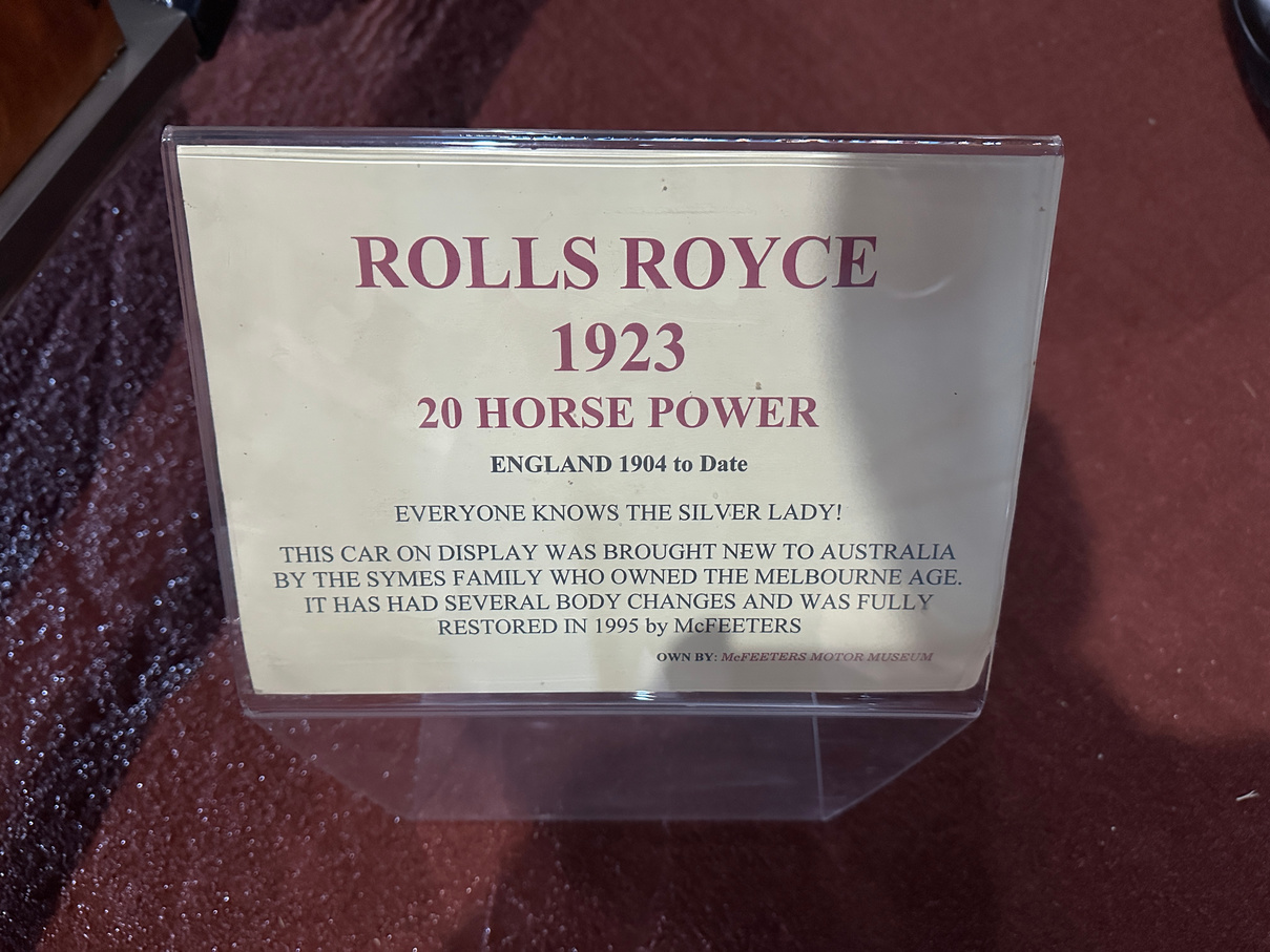 Part of the McFeeters Motor Museum since its opening, this 1923 Rolls Royce was purchased by the McFeeters in May 1994 from R J Hobson of Beecroft NSW. It was in need of a full restoration which they had carried out over a 3 year period. The museum advises that the car was originally imported new by the Syme family of Melbourne who owned The Age newspaper as their town car. It was subsequently sold by them in 1970. It presents immaculately and is widely admired and respected by Rolls Royce enthusiasts. A folder of photos, paperwork including restoration receipts and correspondence between previous owners is supplied with the vehicle. It partakes in the Anzac Day march each year and was last used in April 2025 for the event. No attempt to start. It measures 1750mm width, 4600mm length and 1750mm height.