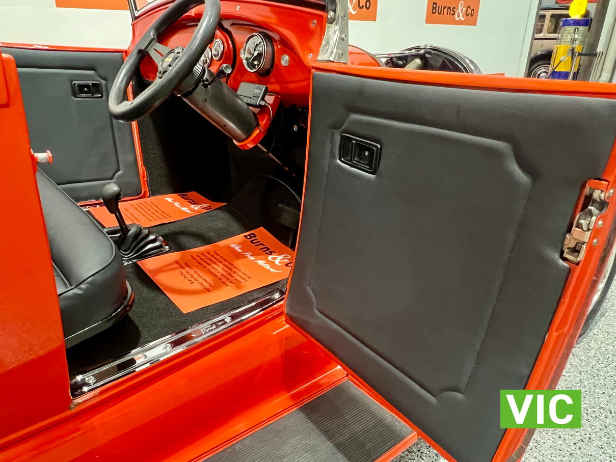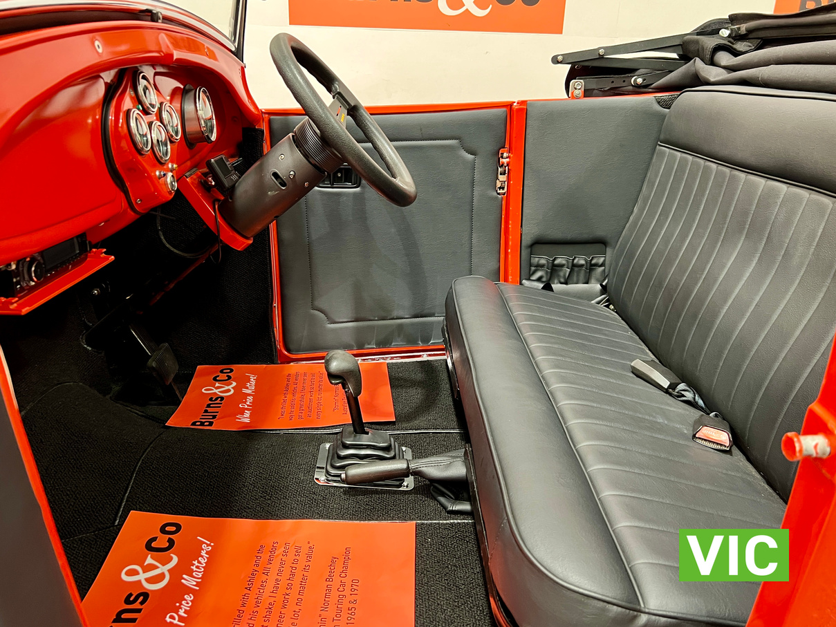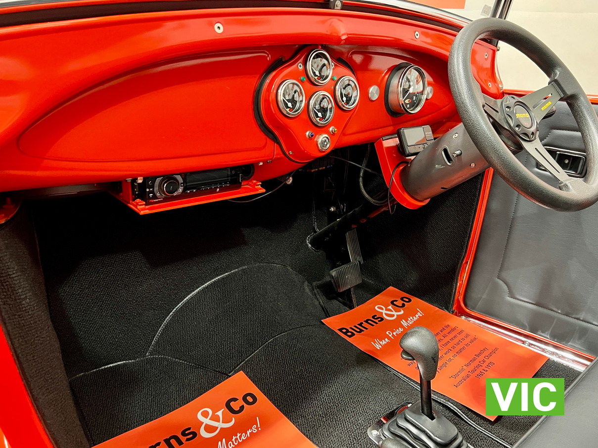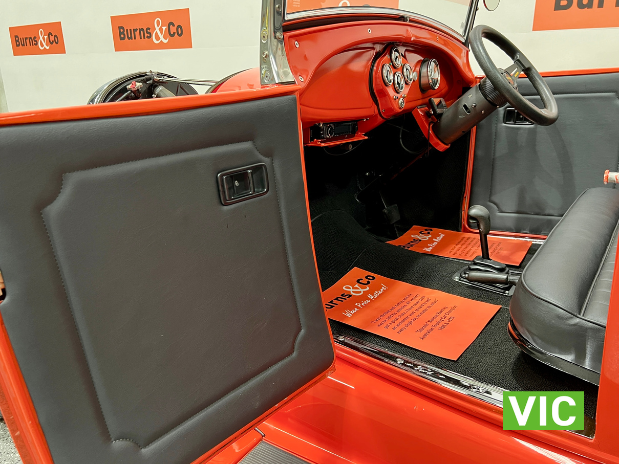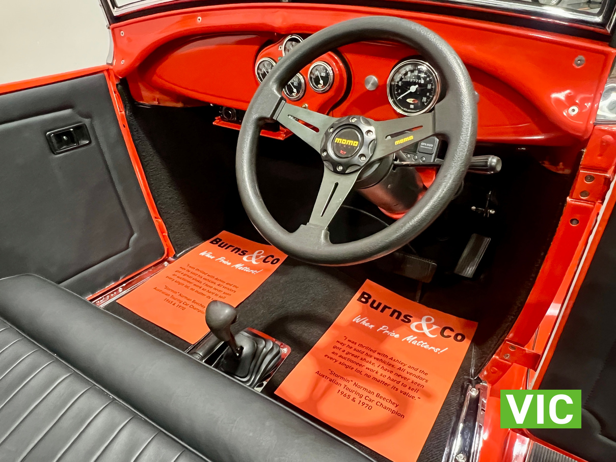 Interior was professionally reupholstered 12 months ago and is finished in supple black. Body presents well and is a perfect club car. All steel body with fibreglass guards. Vendor purchased the vehicle with a VASS certificate that was current at the time (10 years ago) and has made some minor modifications since, including indicators and seat belts. A customized caravan built specifically for this hot rod is the following lot in the catalogue. A great opportunity and an even better looking hot rod.