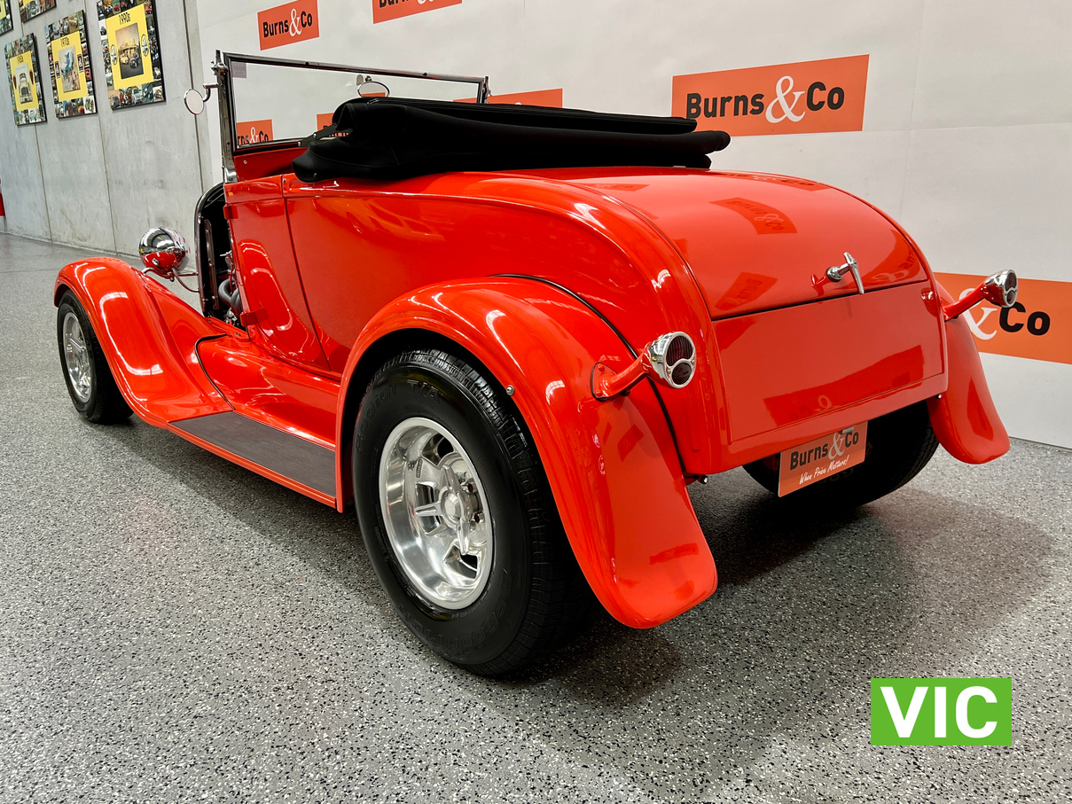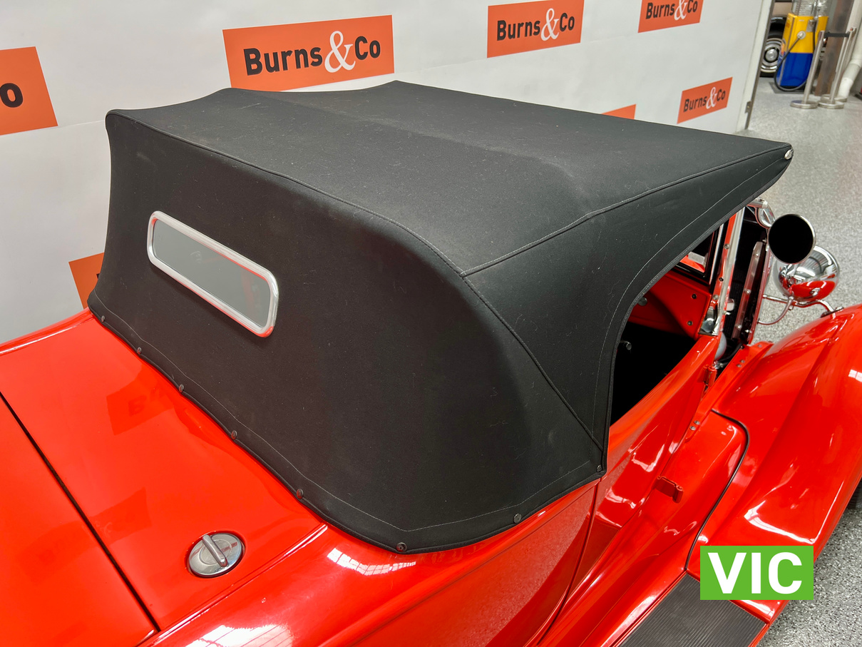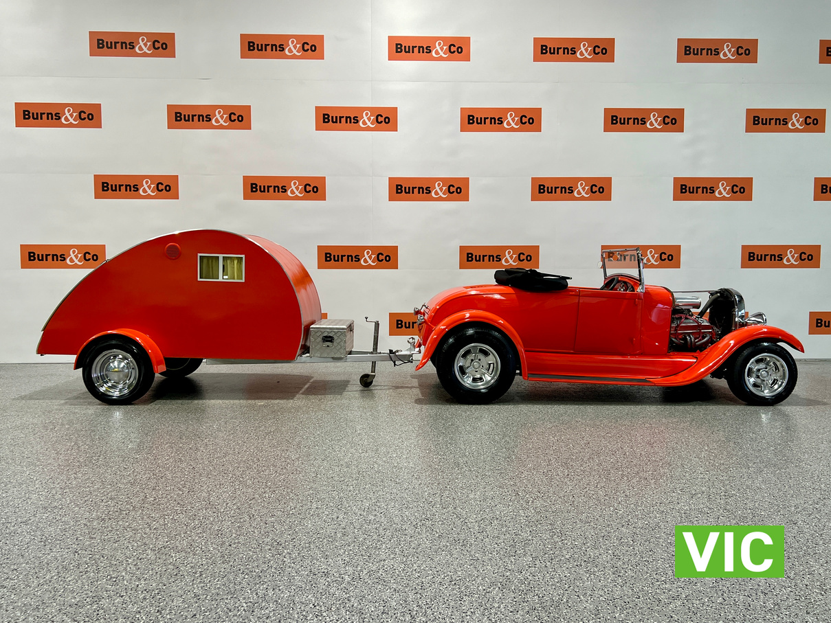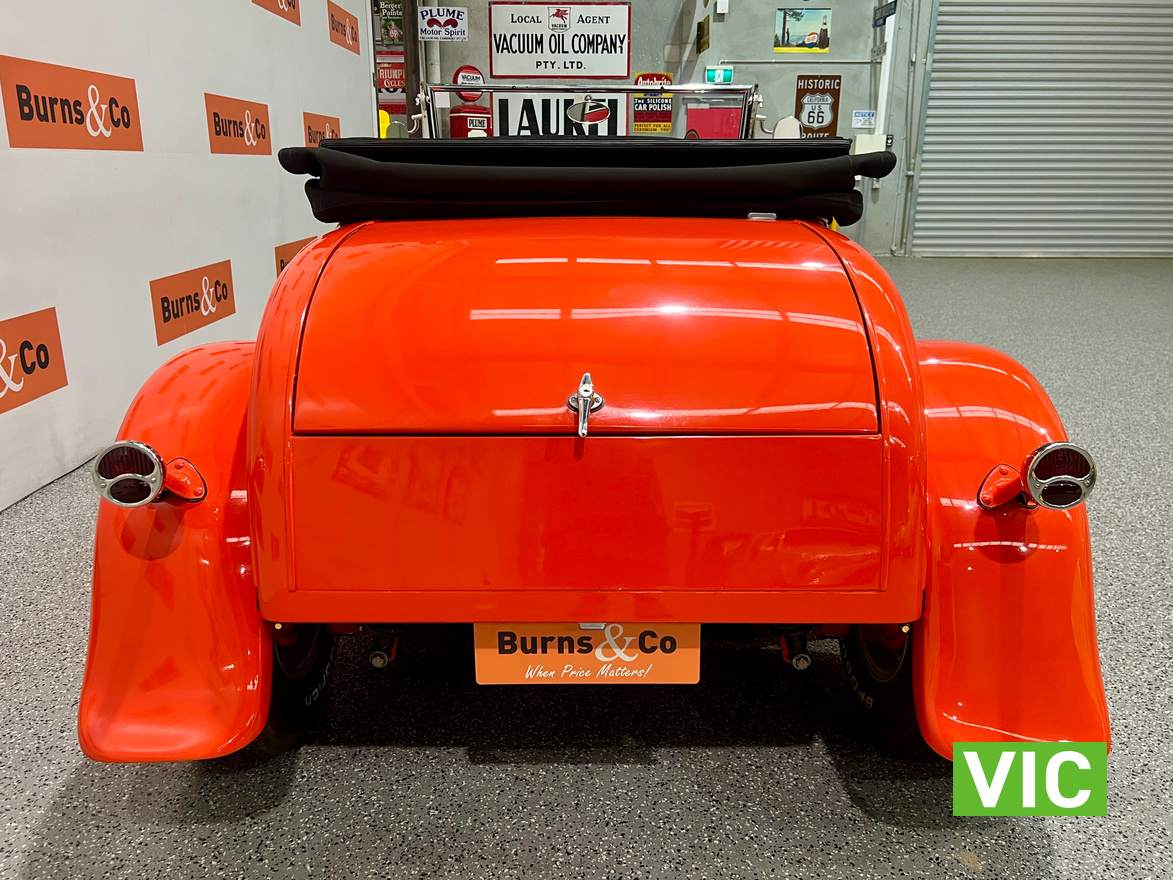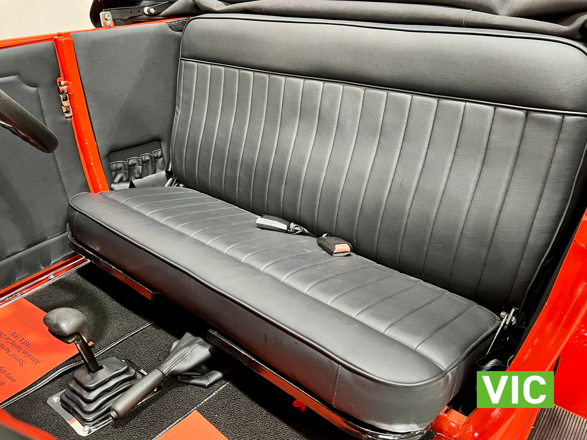 Interior was professionally reupholstered 12 months ago and is finished in supple black. Body presents well and is a perfect club car. All steel body with fibreglass guards. Vendor purchased the vehicle with a VASS certificate that was current at the time (10 years ago) and has made some minor modifications since, including indicators and seat belts. A customized caravan built specifically for this hot rod is the following lot in the catalogue. A great opportunity and an even better looking hot rod.
