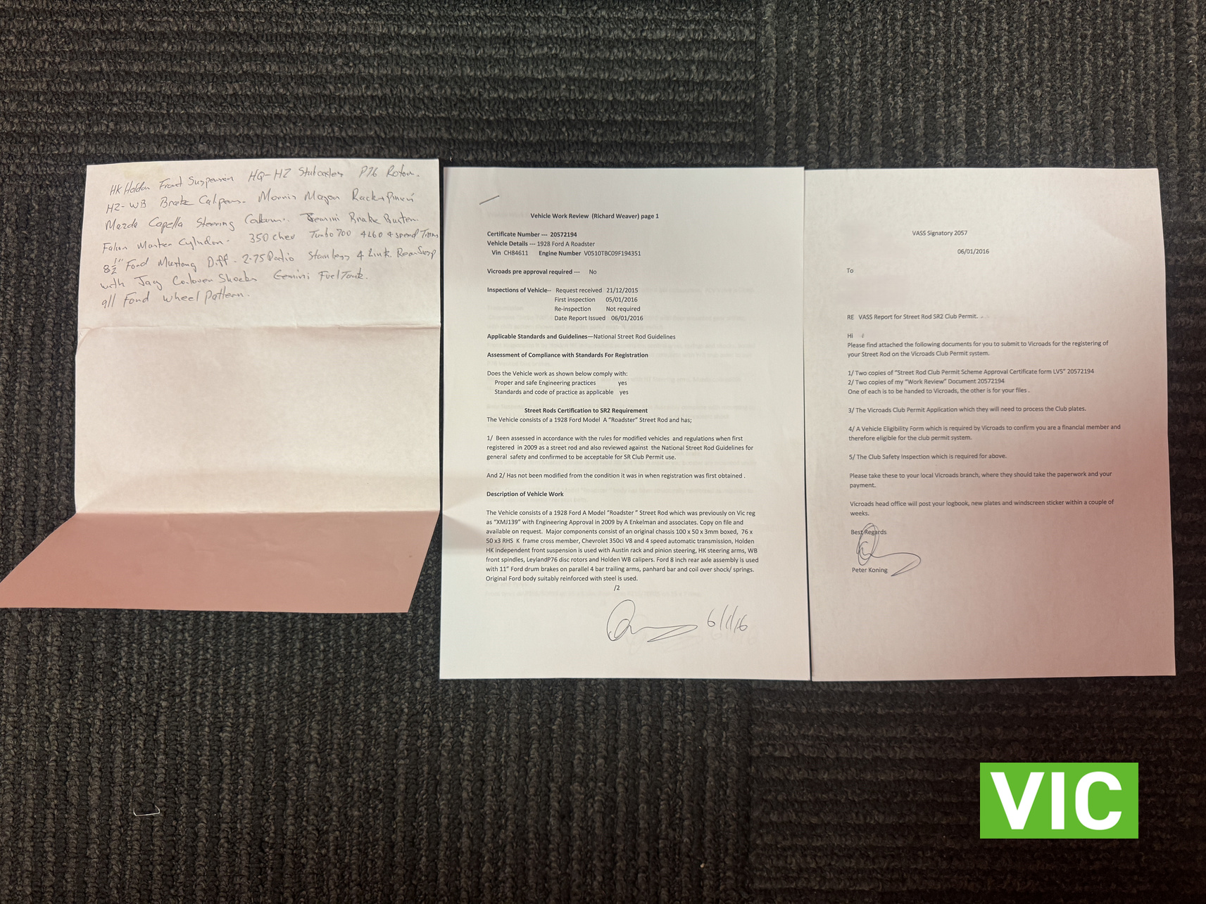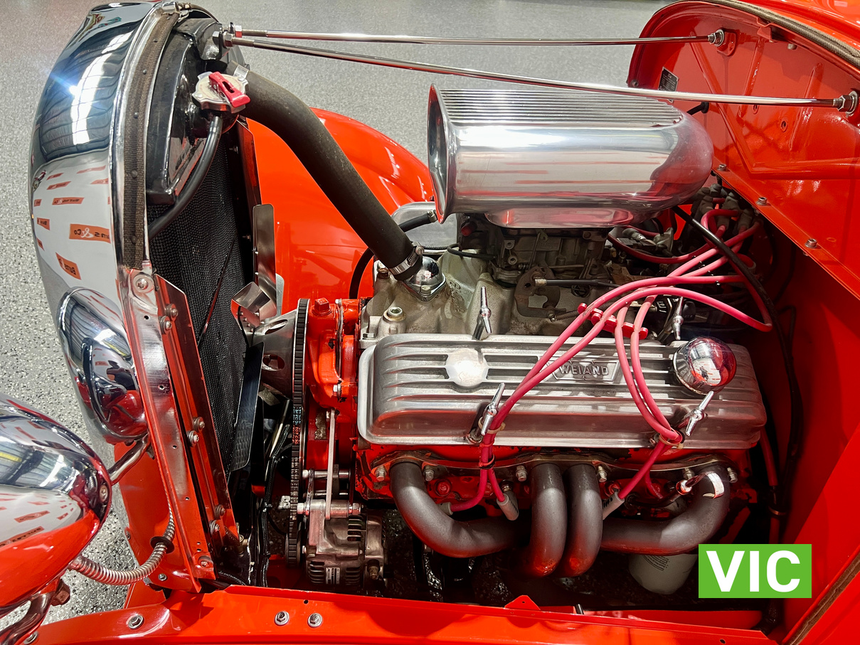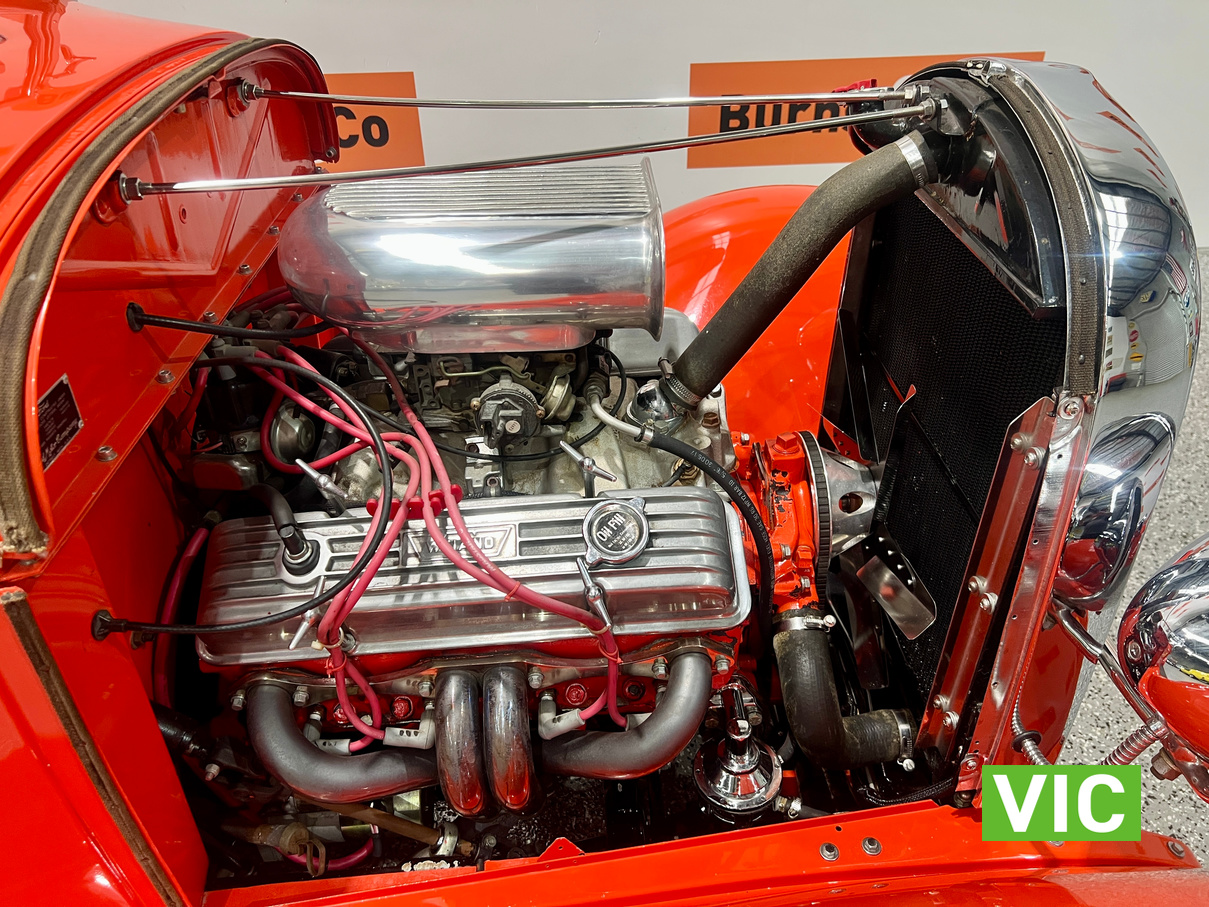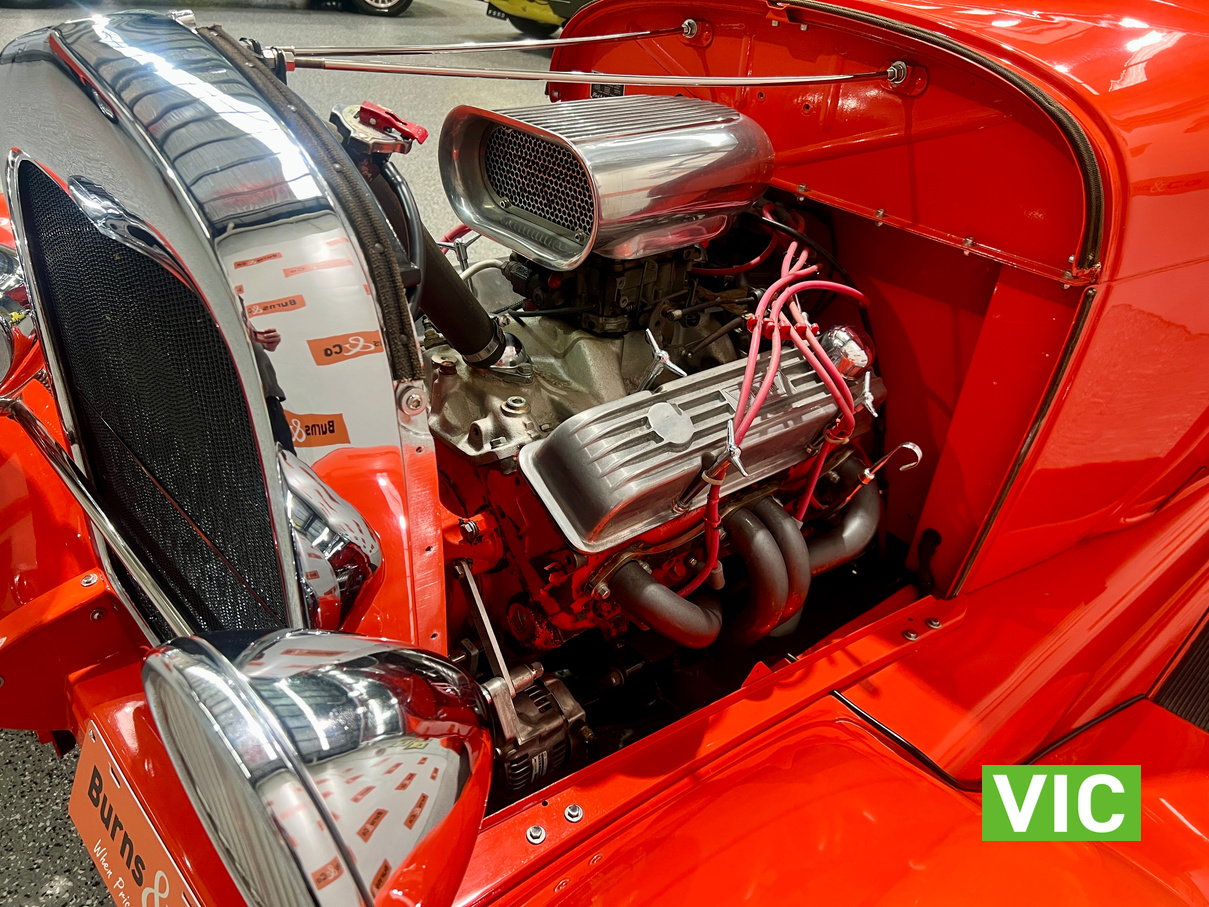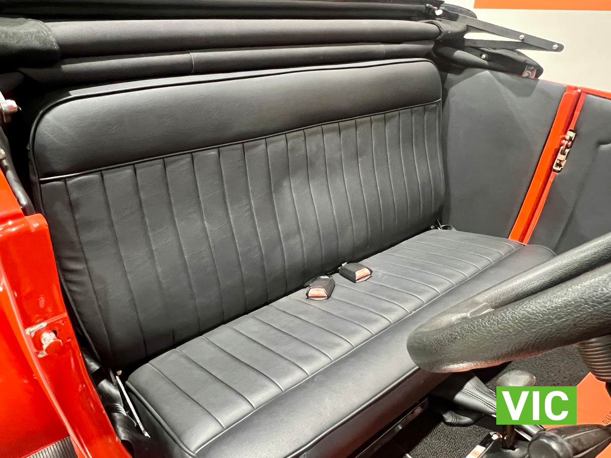 Interior was professionally reupholstered 12 months ago and is finished in supple black. Body presents well and is a perfect club car. All steel body with fibreglass guards. Vendor purchased the vehicle with a VASS certificate that was current at the time (10 years ago) and has made some minor modifications since, including indicators and seat belts. A customized caravan built specifically for this hot rod is the following lot in the catalogue. A great opportunity and an even better looking hot rod.