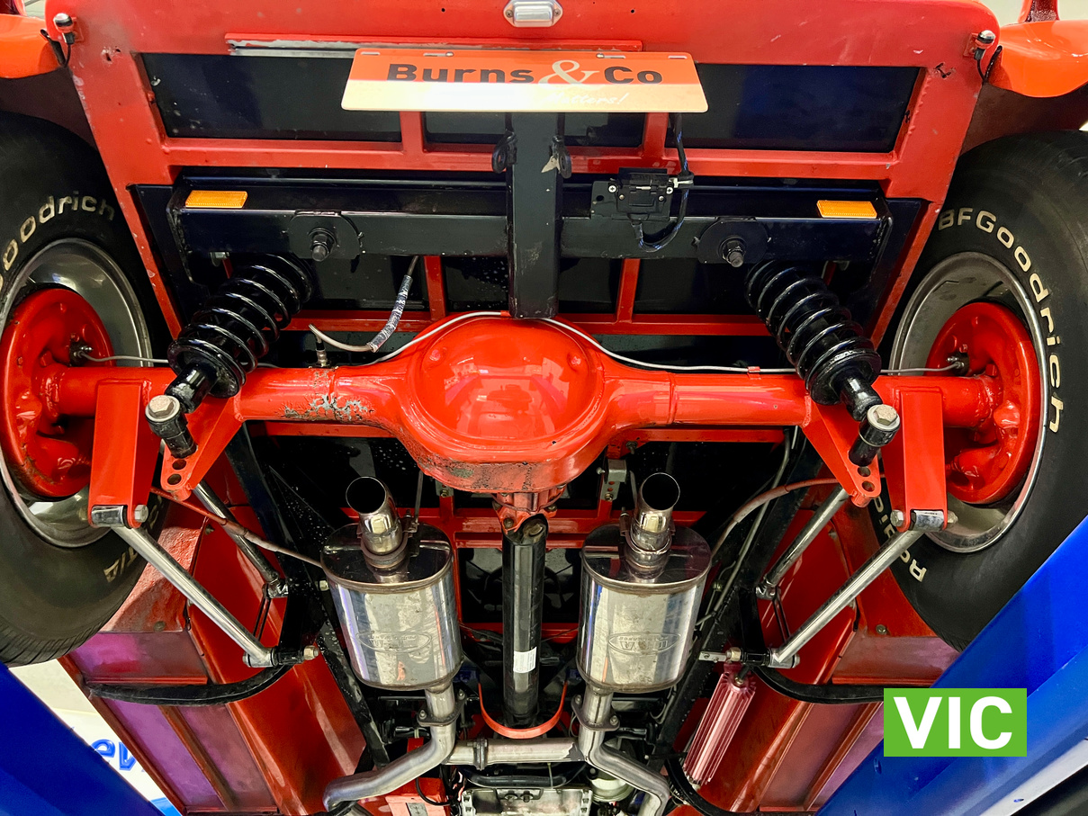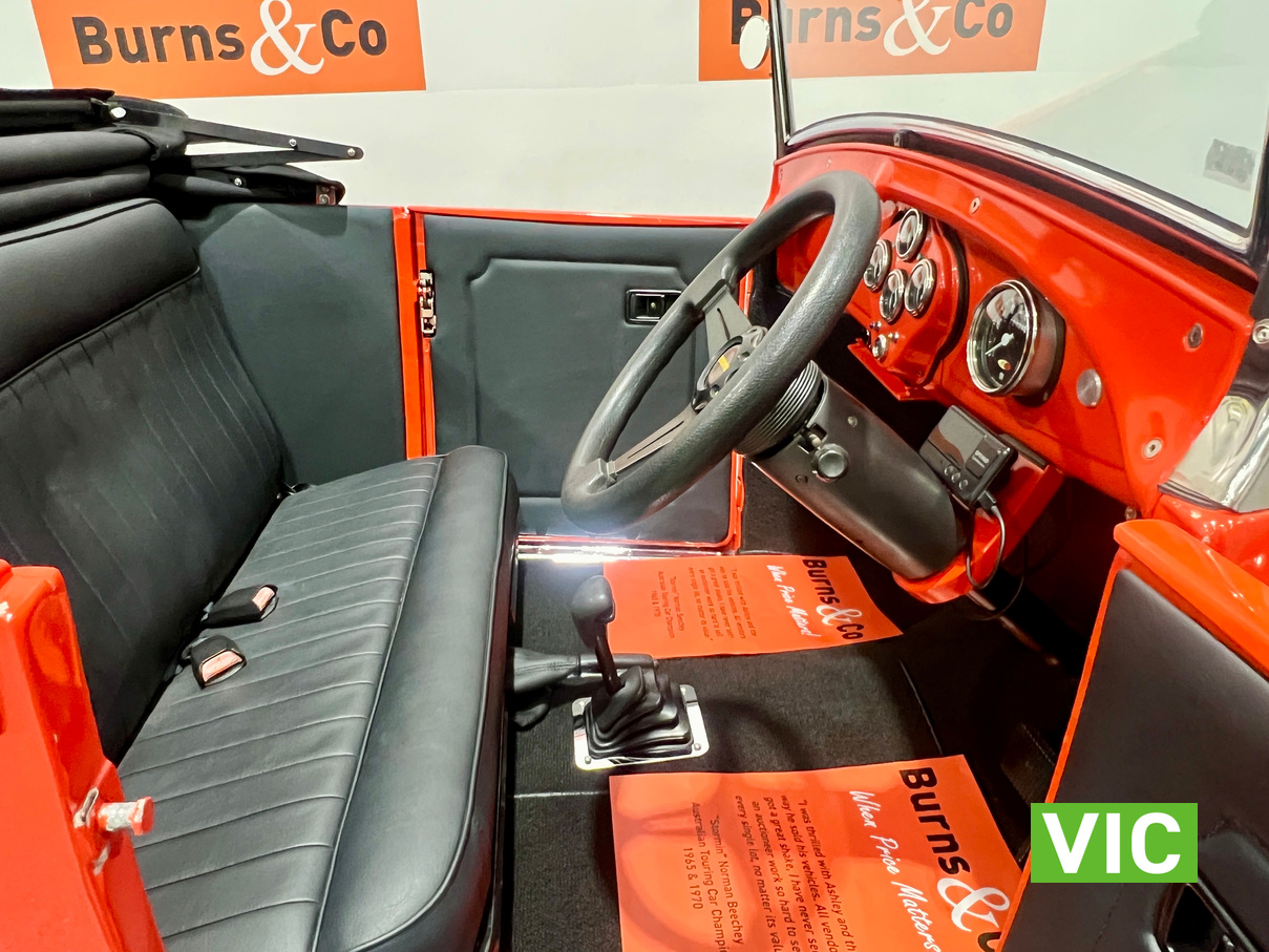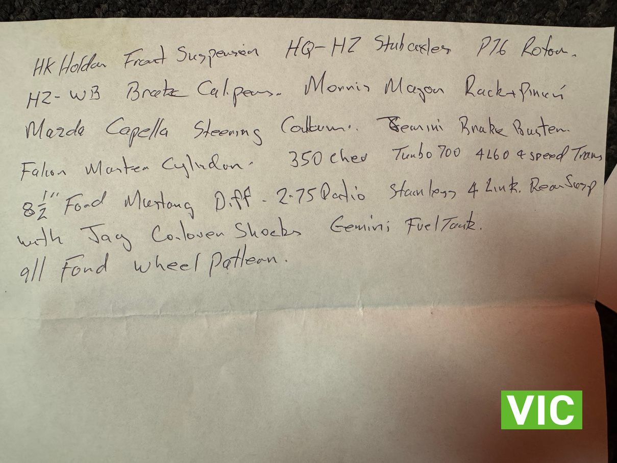 Driven into our Bayswater showroom on SR registration (sold unregistered). Fitted with a 350 Chevy V8 with gear drive, turbo 700 transmission, Mustang 8.5” diff, HK Holden front suspension, HQ front stub axles, P76 rotors, HZ brake callipers, Morris Major rack and pinion, Mazda Capella steering column, Gemini brake booster with Falcon master cylinder, genuine Halibrand wheels and electronic fuel pump booster.