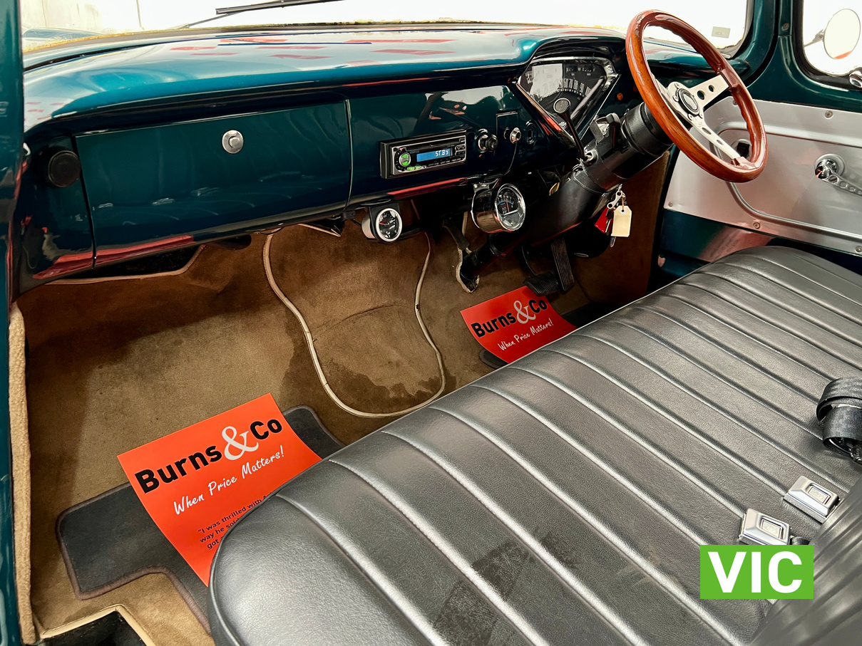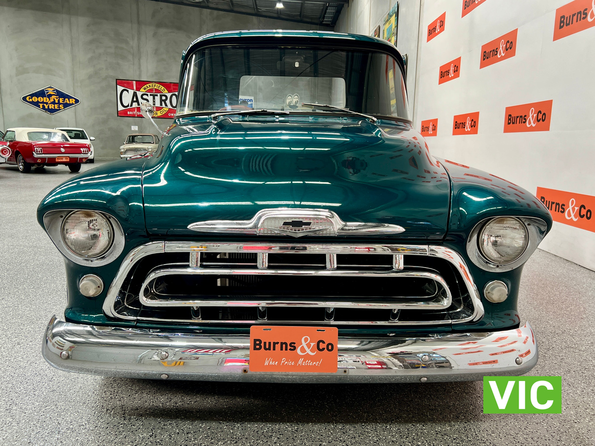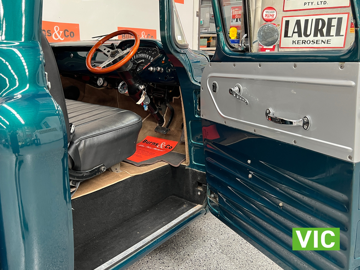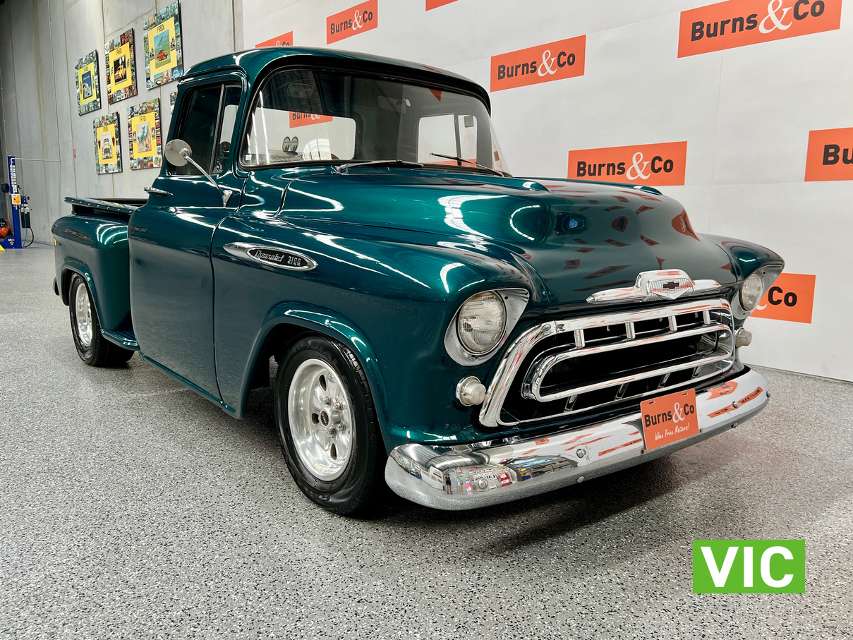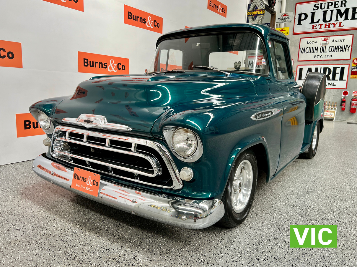 Being offered as part of a deceased estate. Very well presented 1957 Chevrolet 3100, fitted with the big 307 V8 coupled to an automatic transmission. Finished in a vibrant coat of metallic green with a bold black interior. Chrome-work is in great shape and gleams as is the body and general condition of the car. Has been on Victorian club registration (sold unregistered). Fantastic opportunity for a great weekend cruiser.