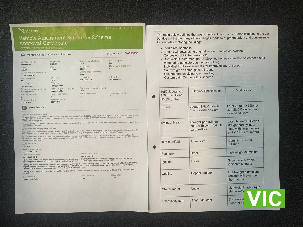 Having undergone a complete body off, nut and bolt restoration in 2012 incorporating numerous mechanical and other upgrades including inertia reel seatbelts, electric windows using original winder handles as switches, turbo 700 4 speed automatic with trans oil cooler, integrated air conditioning and a myriad of additional improvements to make this Jaguar a reliable and enjoyable drive. Vehicle is supplied with the VASS certificate that has been carried out in the past 12 months.