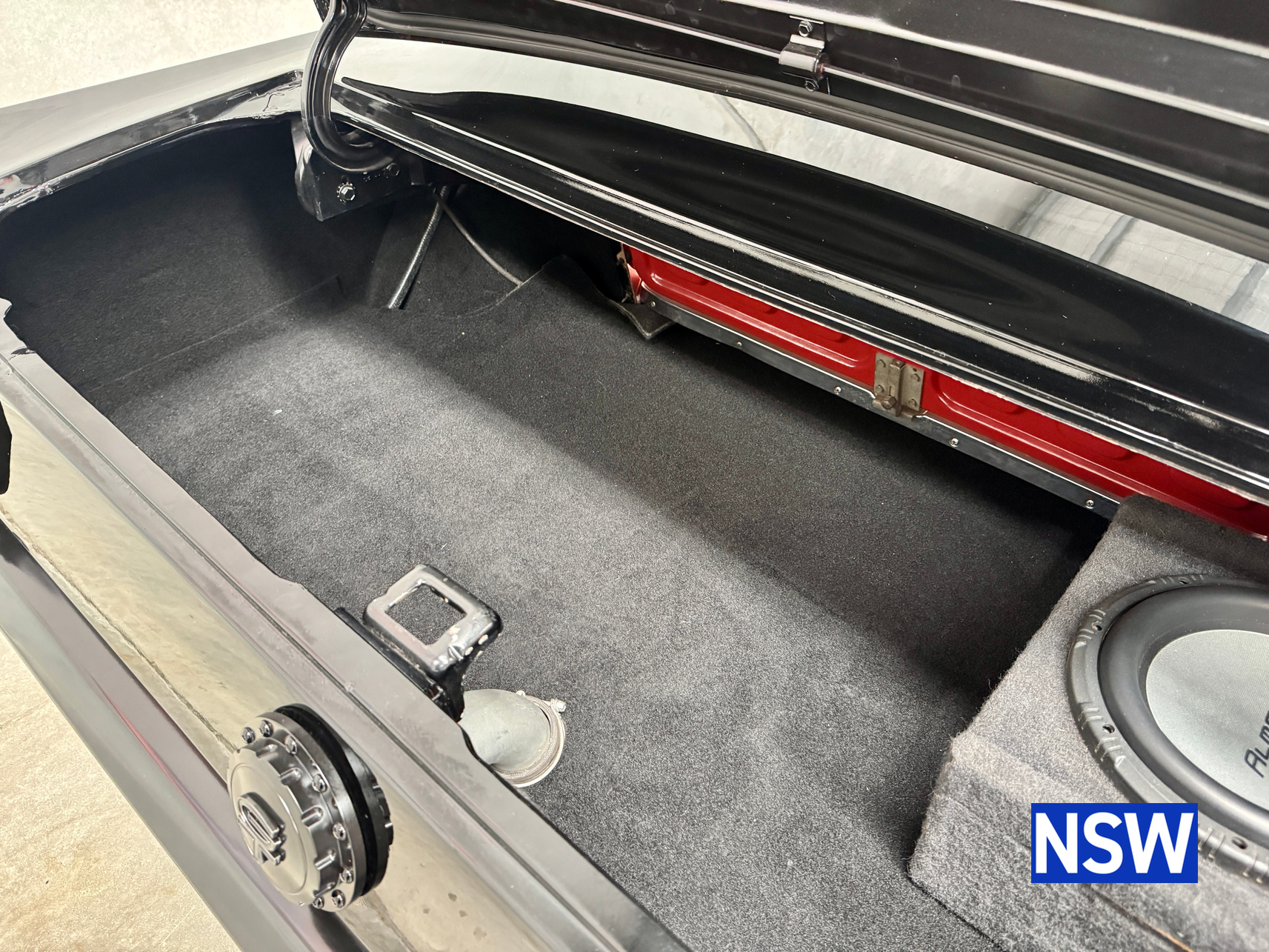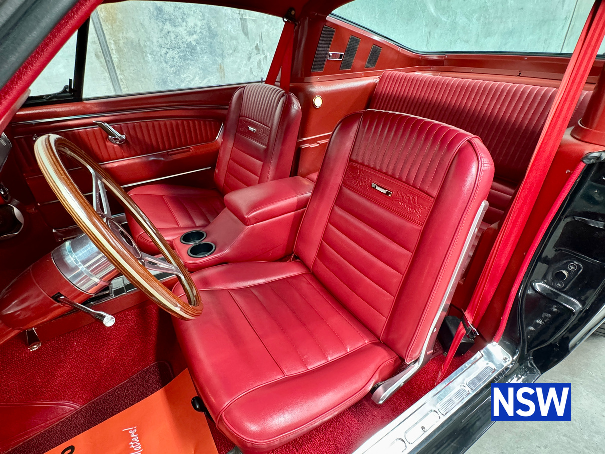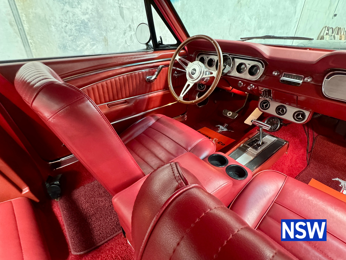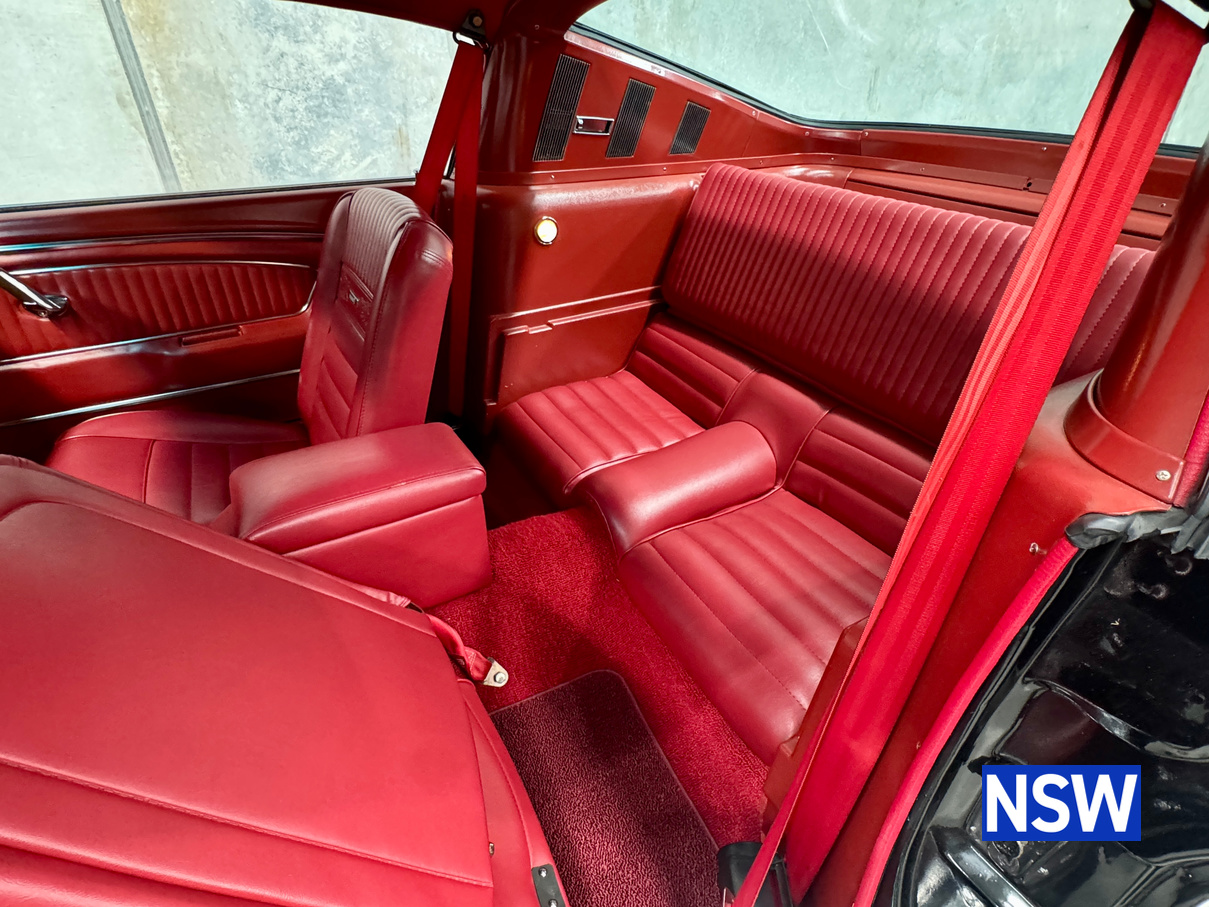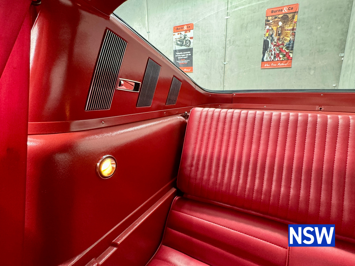 Inside the car has also been refinished but in a contrasting red. The front bucket seats received pony trim with fold down seat in the rear. There are colour match lap sash seat belts fitted for safety. The steering wheel is a wood rimmed LeCarra item and there is a T-bar automatic shifter mounted in the centre console. For comfort, an aftermarket air conditioning system is fitted with neatly integrated under dash vents, and hidden stereo.