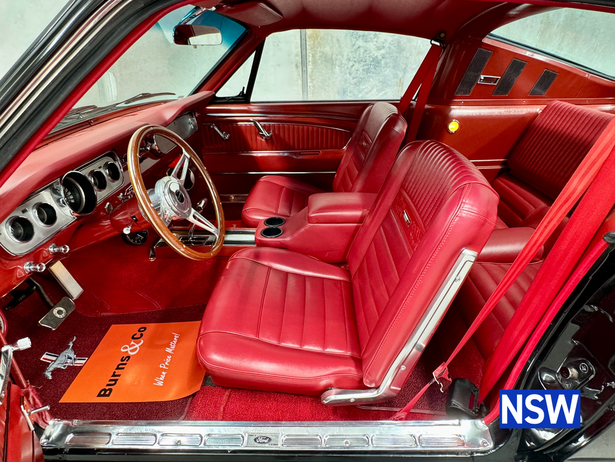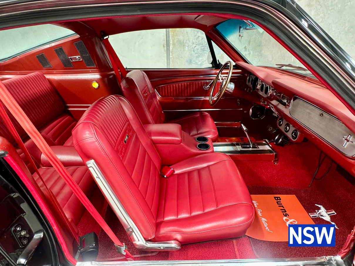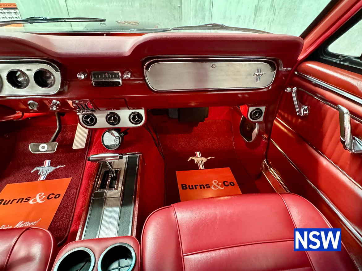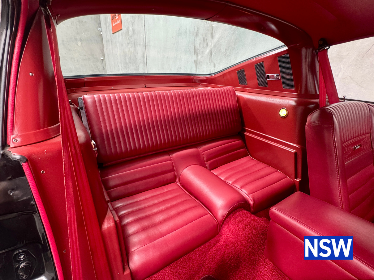 Inside the car has also been refinished but in a contrasting red. The front bucket seats received pony trim with fold down seat in the rear. There are colour match lap sash seat belts fitted for safety. The steering wheel is a wood rimmed LeCarra item and there is a T-bar automatic shifter mounted in the centre console. For comfort, an aftermarket air conditioning system is fitted with neatly integrated under dash vents, and hidden stereo.