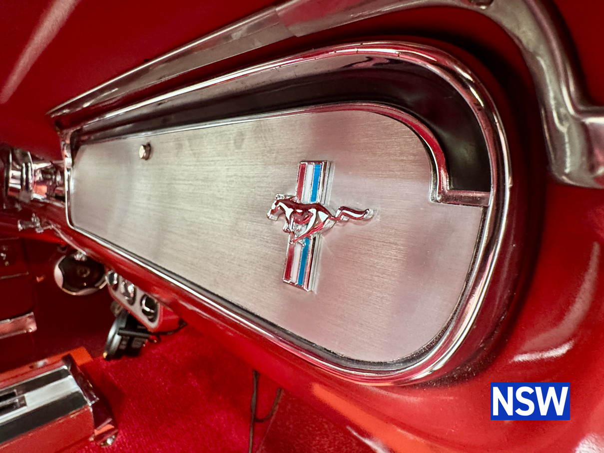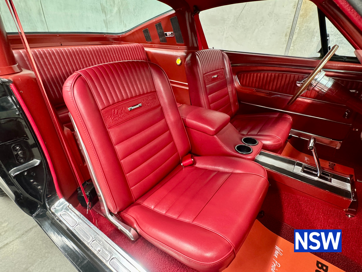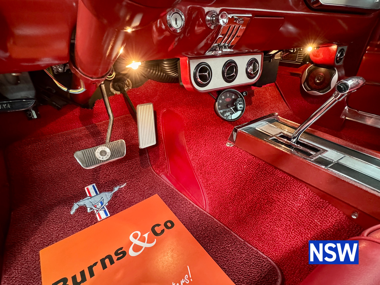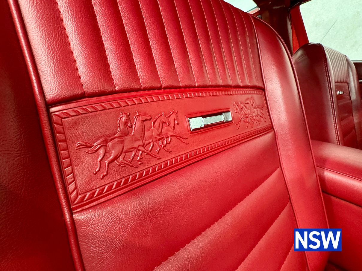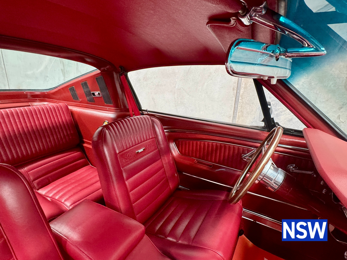 Inside the car has also been refinished but in a contrasting red. The front bucket seats received pony trim with fold down seat in the rear. There are colour match lap sash seat belts fitted for safety. The steering wheel is a wood rimmed LeCarra item and there is a T-bar automatic shifter mounted in the centre console. For comfort, an aftermarket air conditioning system is fitted with neatly integrated under dash vents, and hidden stereo.