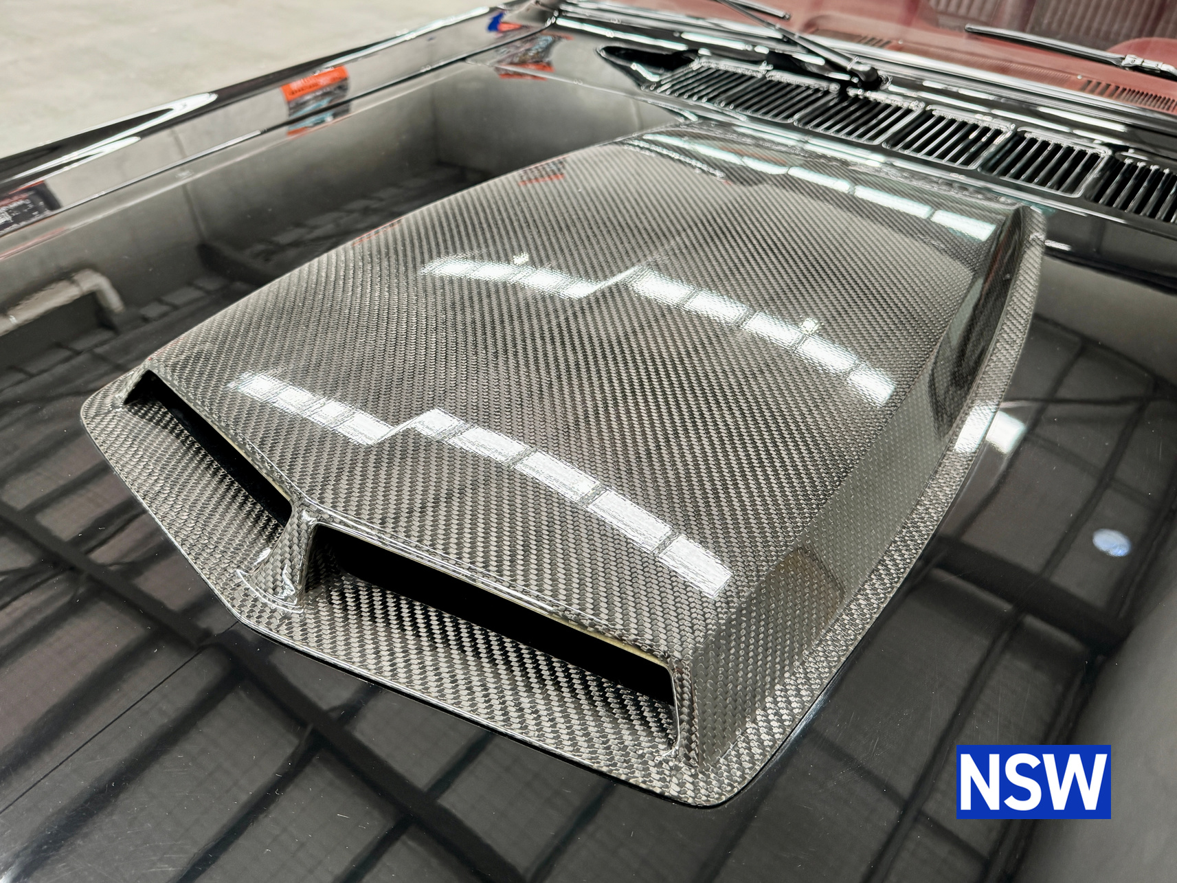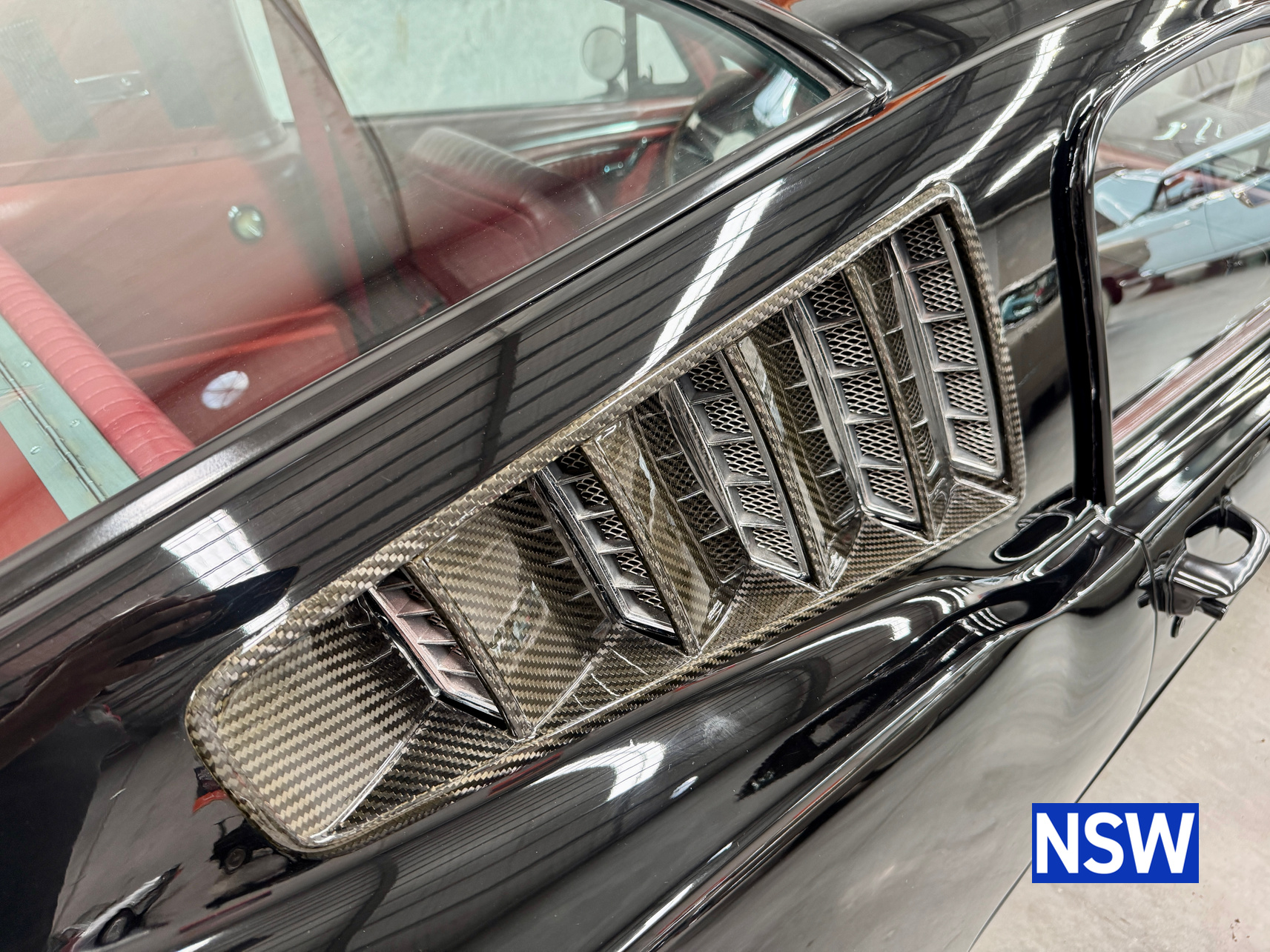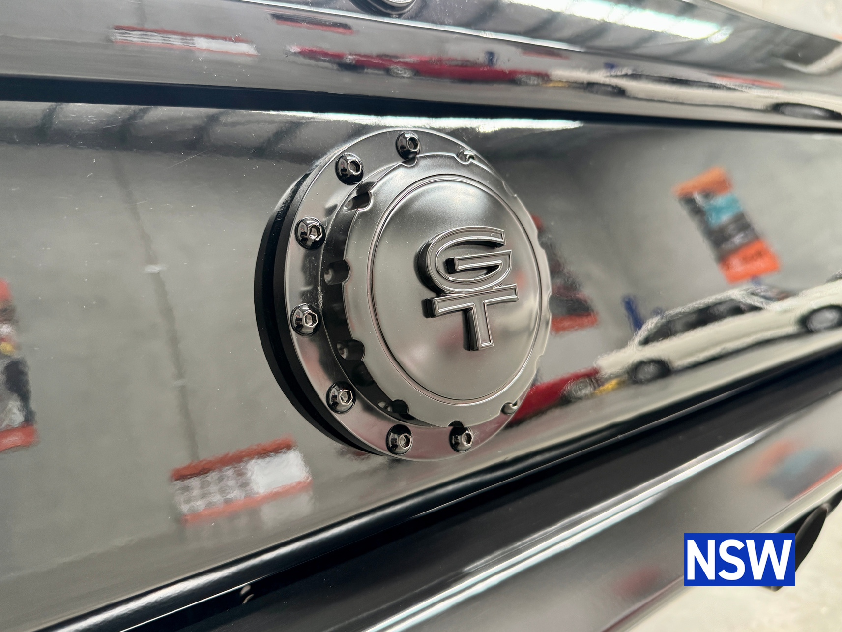 Starting with the body, the car was sent stripped and sent off to Brad at Hypershine for a full bare metal repaint in Gloss Black. In order to give it a sinister look, the decision was made to black out all of the chrome and brightwork including bumpers, light surrounds, window surrounds, wipers, fuel cap and door handles. The front grill was swapped out for a custom billet item . A Ring Brothers carbon fibre bonnet scoop and one off Anvill carbon fibre rear vents add a cool modern high performance touch.