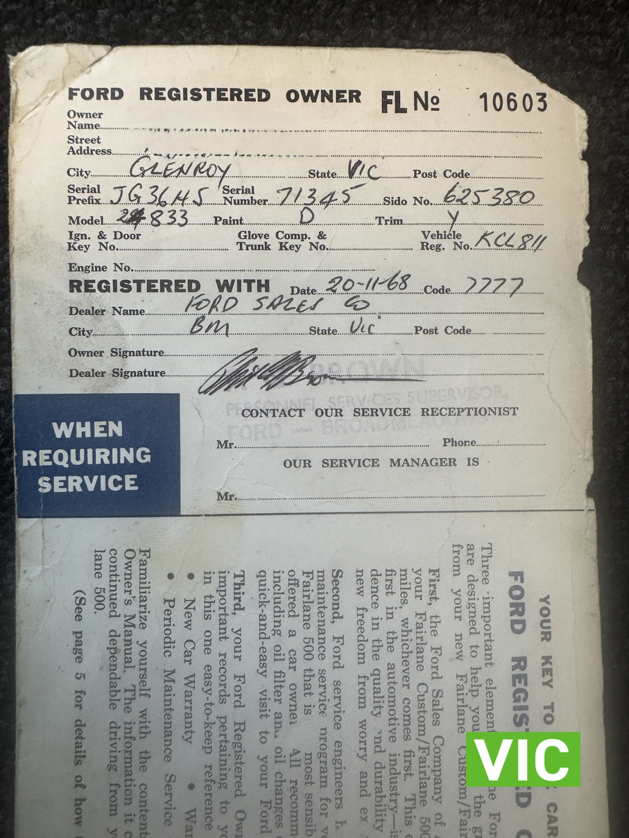Purchased new by Mr G Luppino directly from the Broadmeadows factory as he was a Ford employee. He followed the car throughout the production line witnessing the complete assembly of his new car. Driven by him until he was no longer able to drive. After 58 years of ownership, it has finally come time for this survivor Fairlane to begin its next chapter. Supplied with the vehicle is the original owner’s manual and radio information sheet. A fantastic vehicle with an even better story to tell.