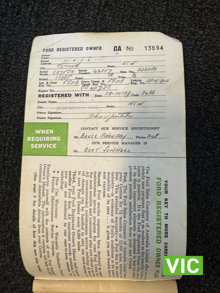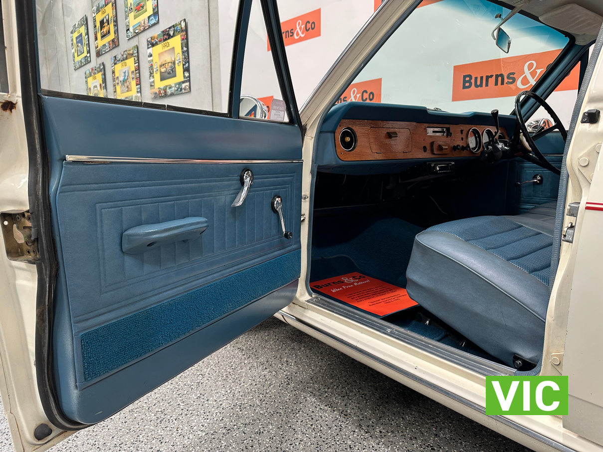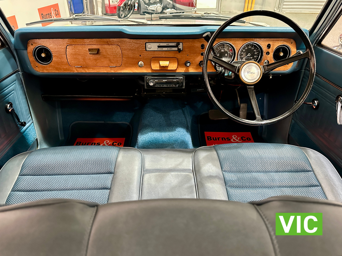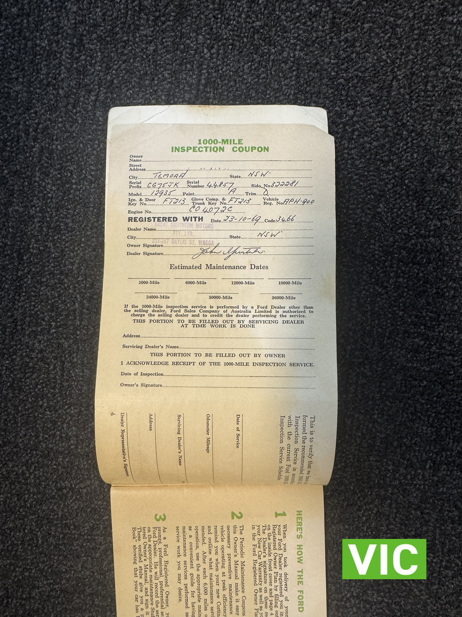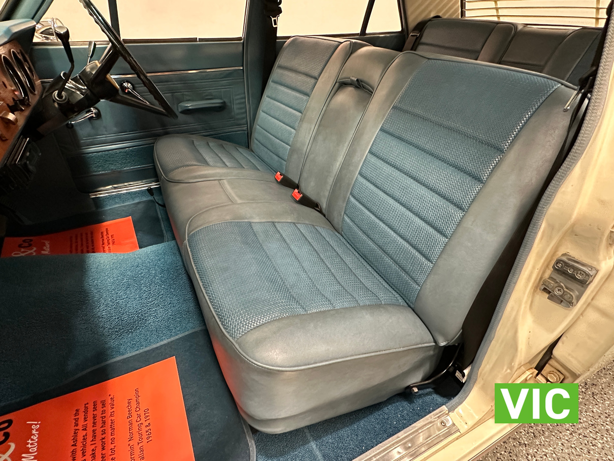 Sold new on the 23/10/1969 by Great Southern Motors Wagga Wagga, to Miss D M Hillard of Temora. Supplied with the vehicle is the original owner’s manual which includes details of the first 1000 Mile inspection. Recently it has had a new fuel tank, seats reupholstered as well as carpets and floor mats to original colour, new door trims, new side mirrors, new dash crash pad, MK2 original wood grain dash, new black seatbelts and seatbelts were installed in back seat, new front and rear brakes, new shocks, front and rear, front end total overhaul including struts, stabilizer, tyre rods and new front wheel bearings inner and outer.