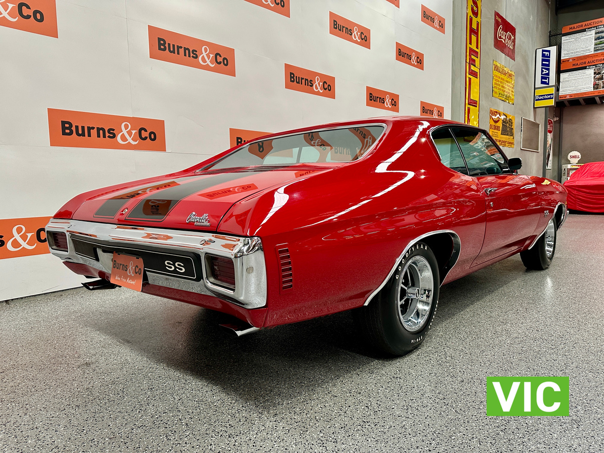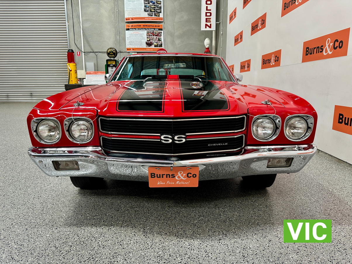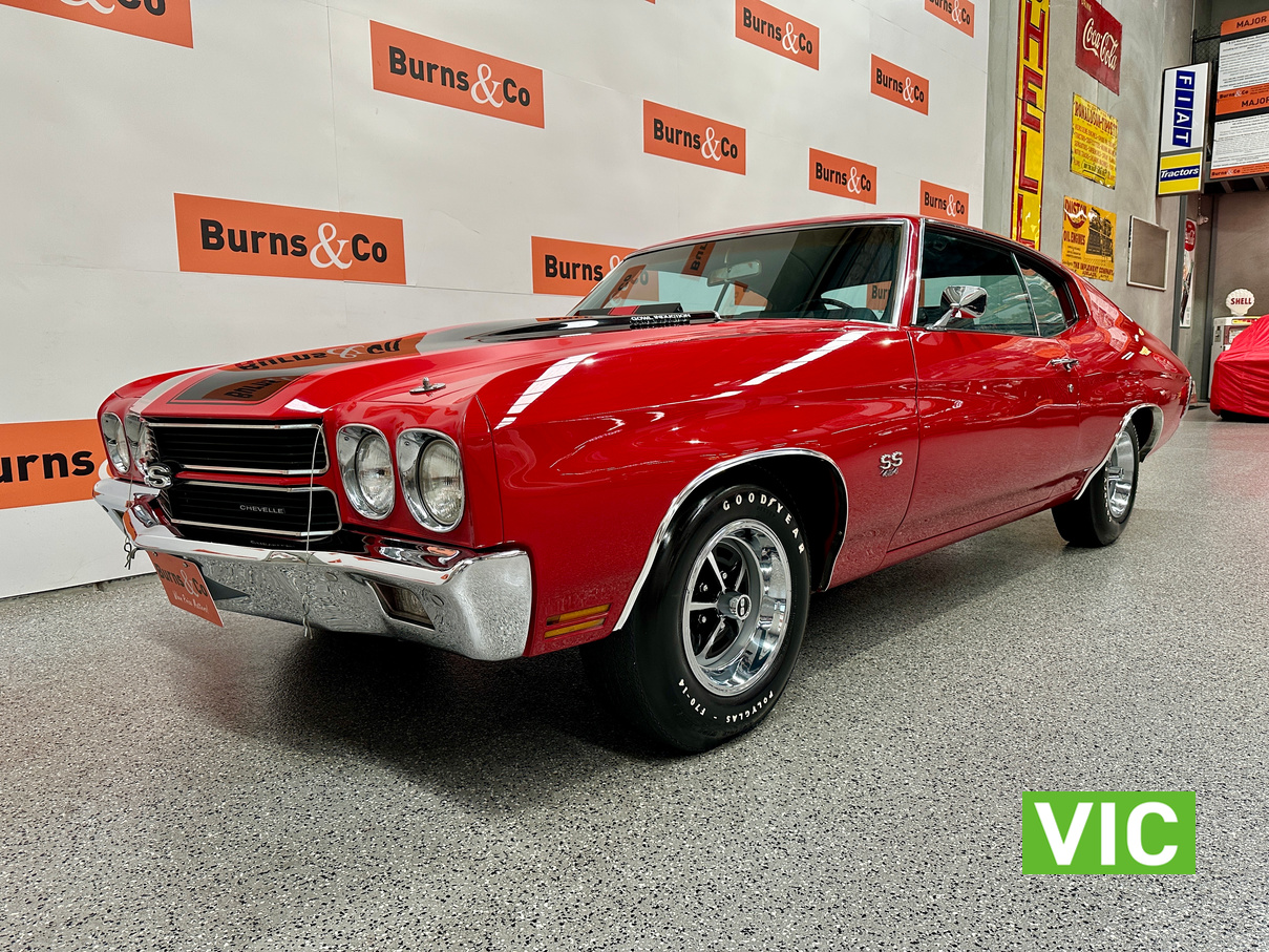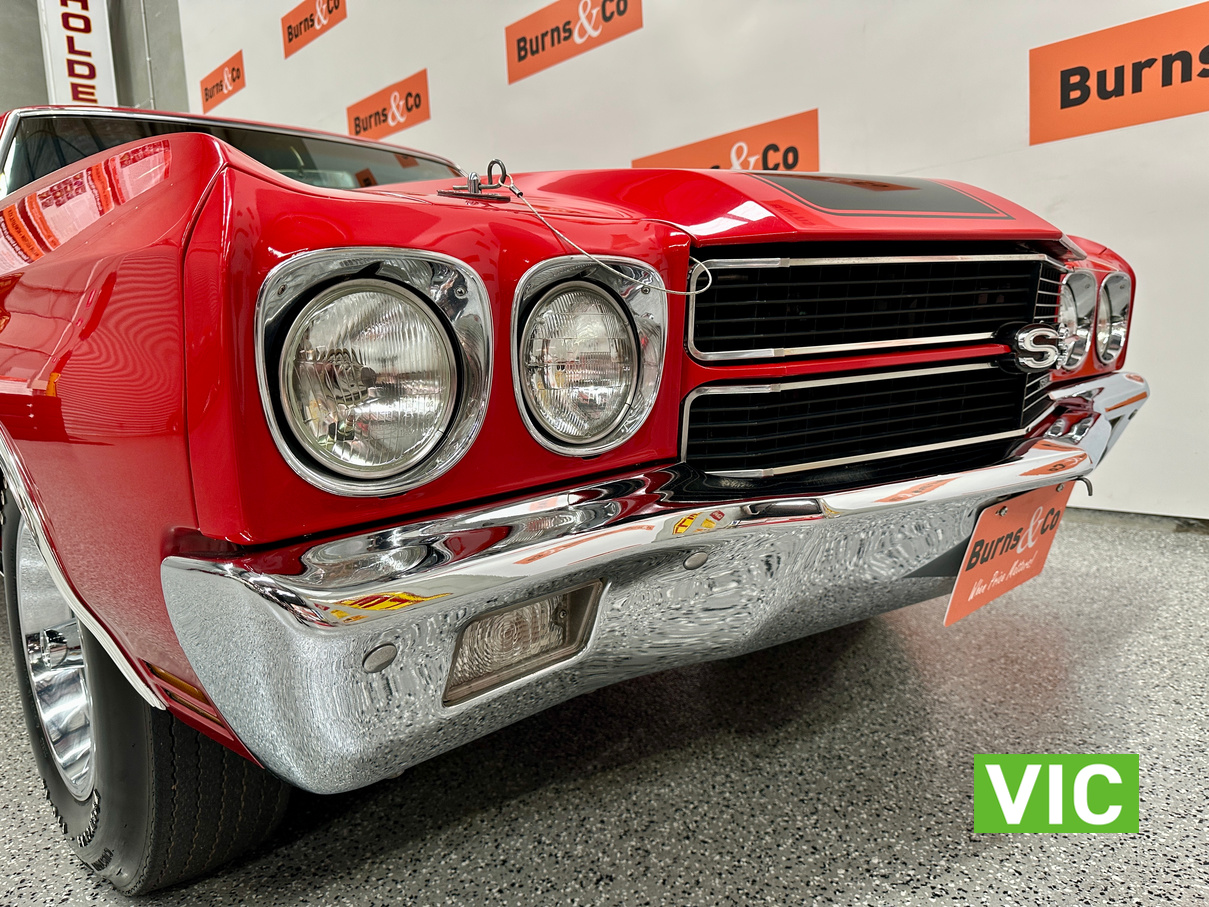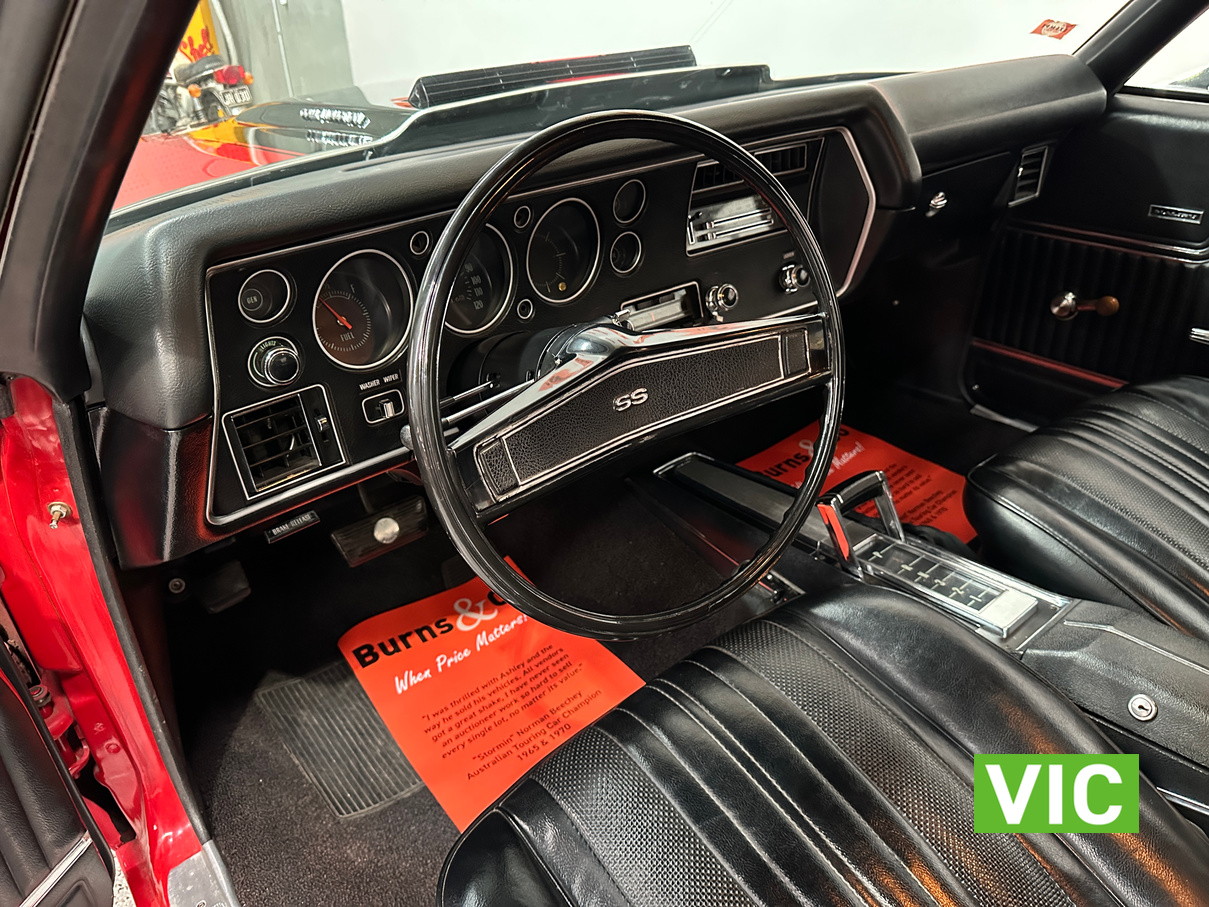 This genuine 1970 Chevelle SS 454 is in tip top condition. This one ticks all the boxes. Matching numbers, 454 LS5, 12 bolt rear with 3.31 code ratio, factory cranberry red paint and black interior, factory black hood and deck stripes, Z15 454 SS package, ZL2 special duct hood (cowl induction), F41 special performance suspension, power brakes with disc front end, Goodyear polyglas F70x14 tyres, windscreen antenna, Strato bucket seats, centre console, power steering, air-conditioning, push button radio and with 49xxx miles on the clock.
