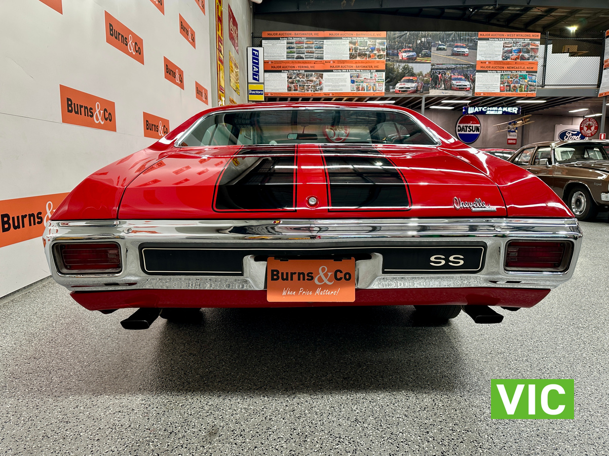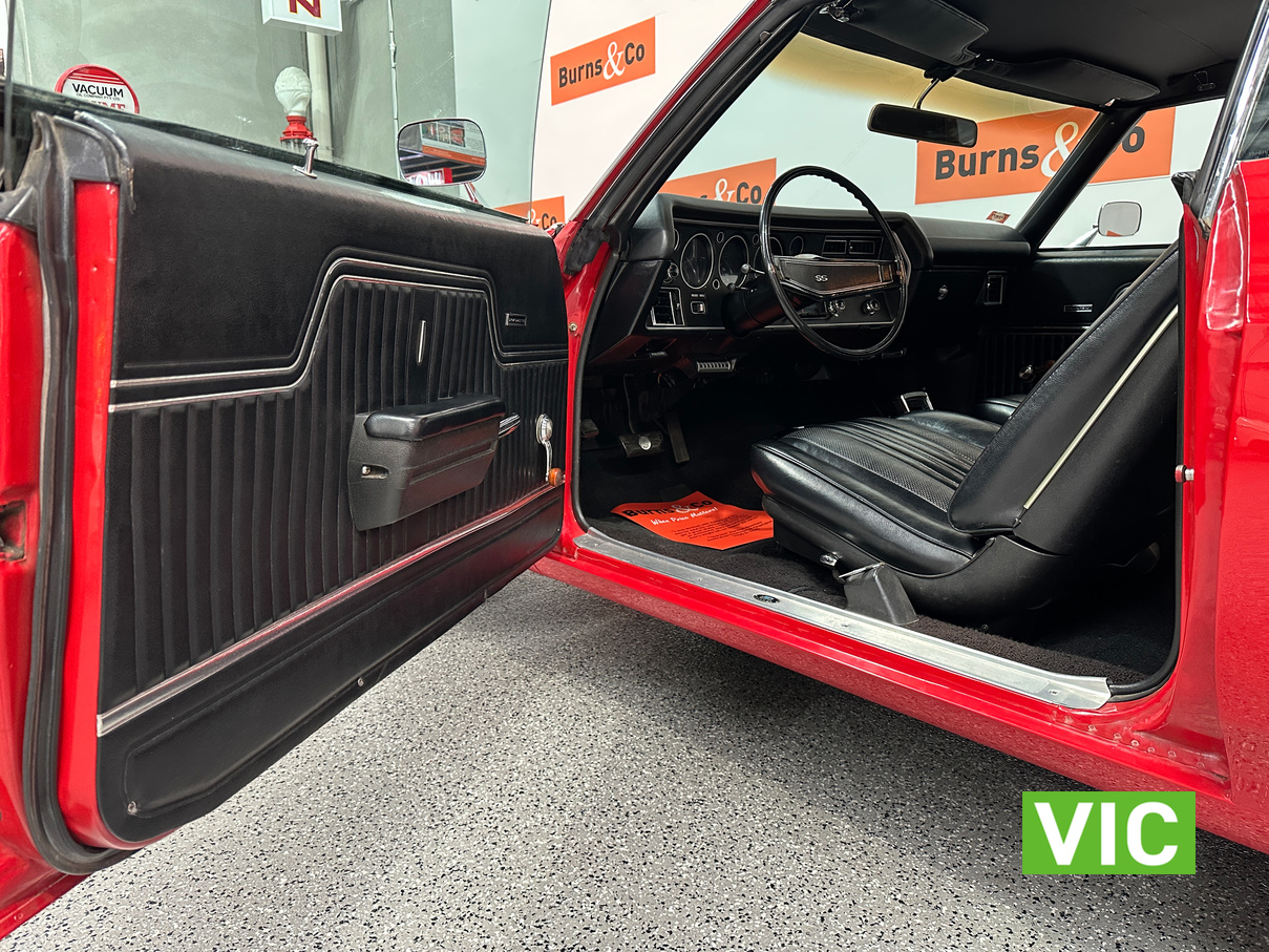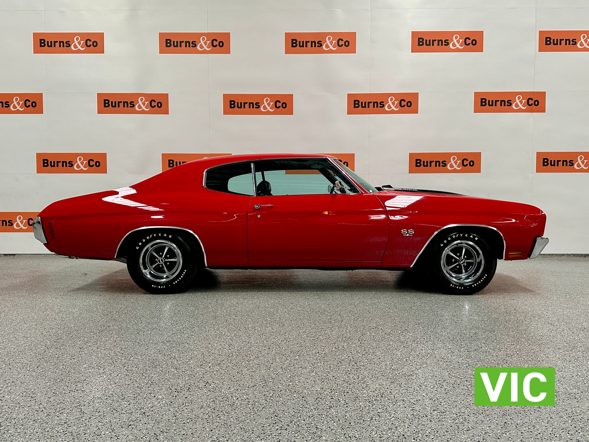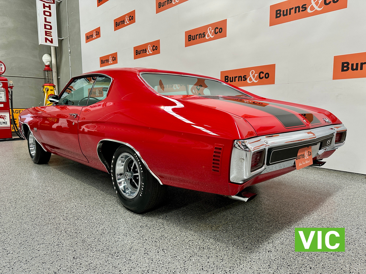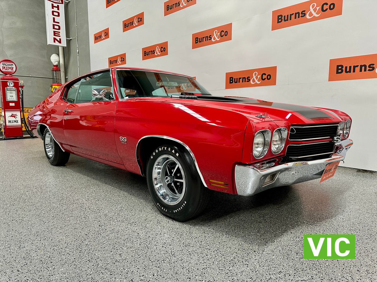 This genuine 1970 Chevelle SS 454 is in tip top condition. This one ticks all the boxes. Matching numbers, 454 LS5, 12 bolt rear with 3.31 code ratio, factory cranberry red paint and black interior, factory black hood and deck stripes, Z15 454 SS package, ZL2 special duct hood (cowl induction), F41 special performance suspension, power brakes with disc front end, Goodyear polyglas F70x14 tyres, windscreen antenna, Strato bucket seats, centre console, power steering, air-conditioning, push button radio and with 49xxx miles on the clock.