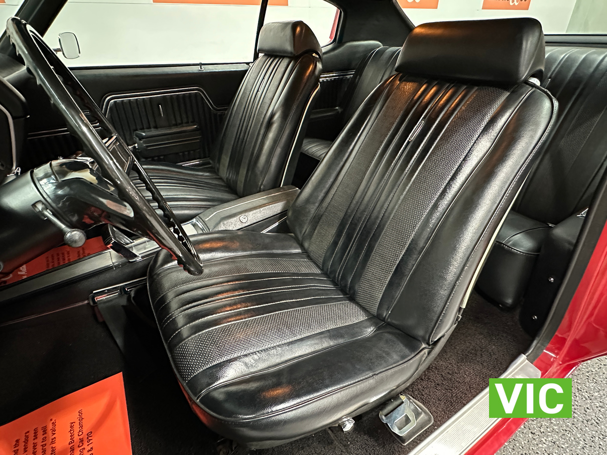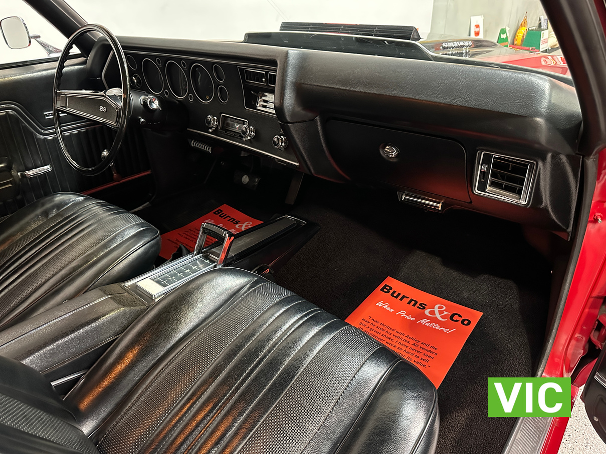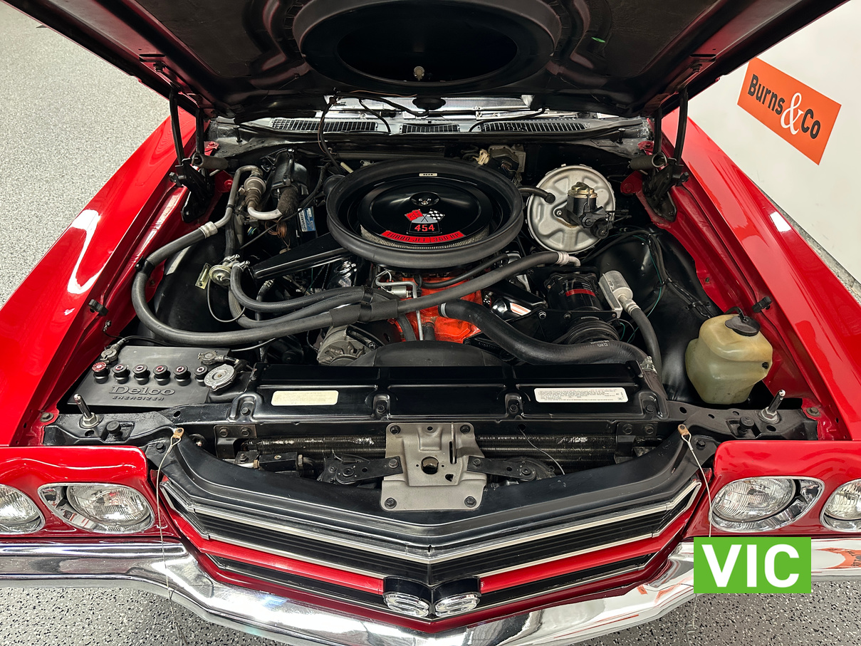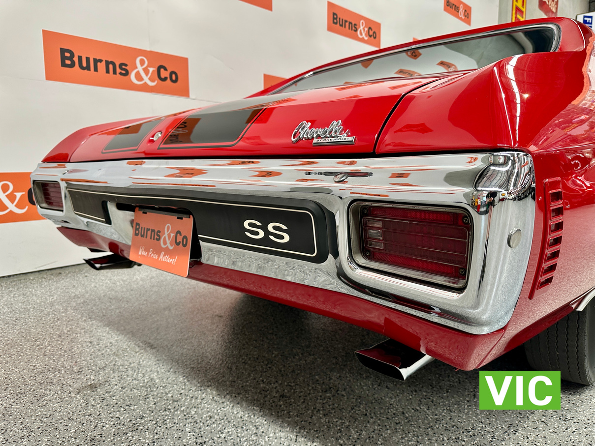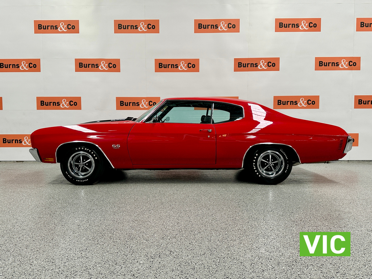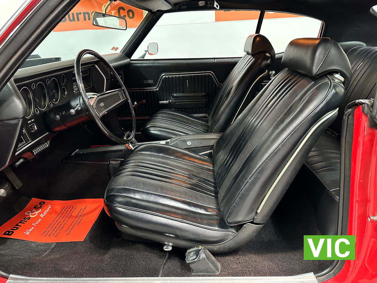 This genuine 1970 Chevelle SS 454 is in tip top condition. This one ticks all the boxes. Matching numbers, 454 LS5, 12 bolt rear with 3.31 code ratio, factory cranberry red paint and black interior, factory black hood and deck stripes, Z15 454 SS package, ZL2 special duct hood (cowl induction), F41 special performance suspension, power brakes with disc front end, Goodyear polyglas F70x14 tyres, windscreen antenna, Strato bucket seats, centre console, power steering, air-conditioning, push button radio and with 49xxx miles on the clock.