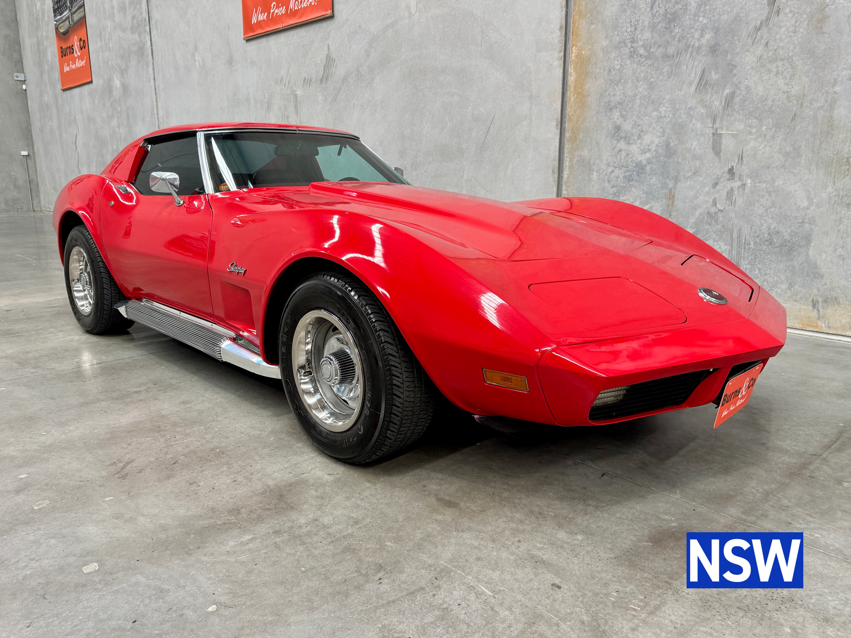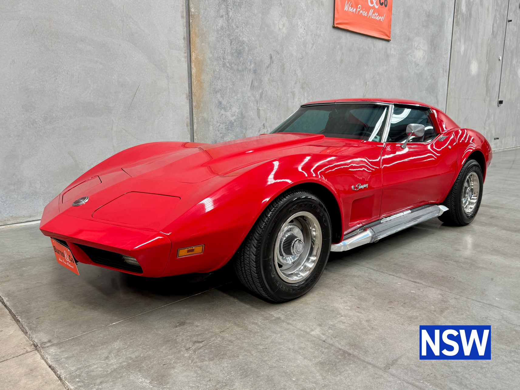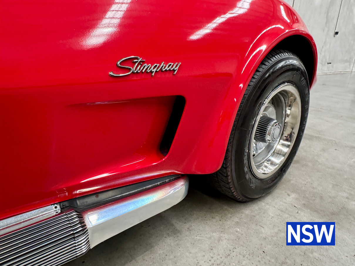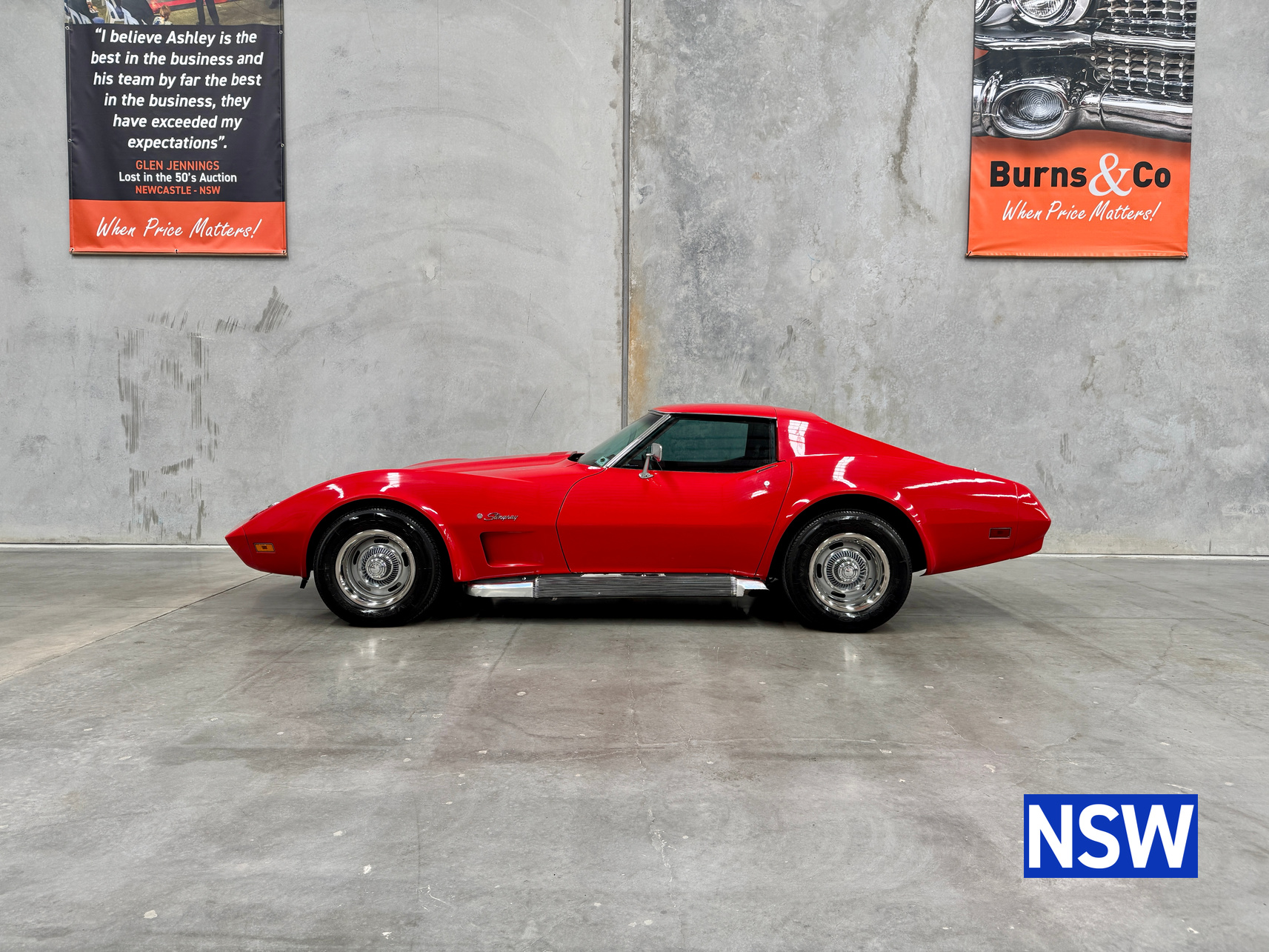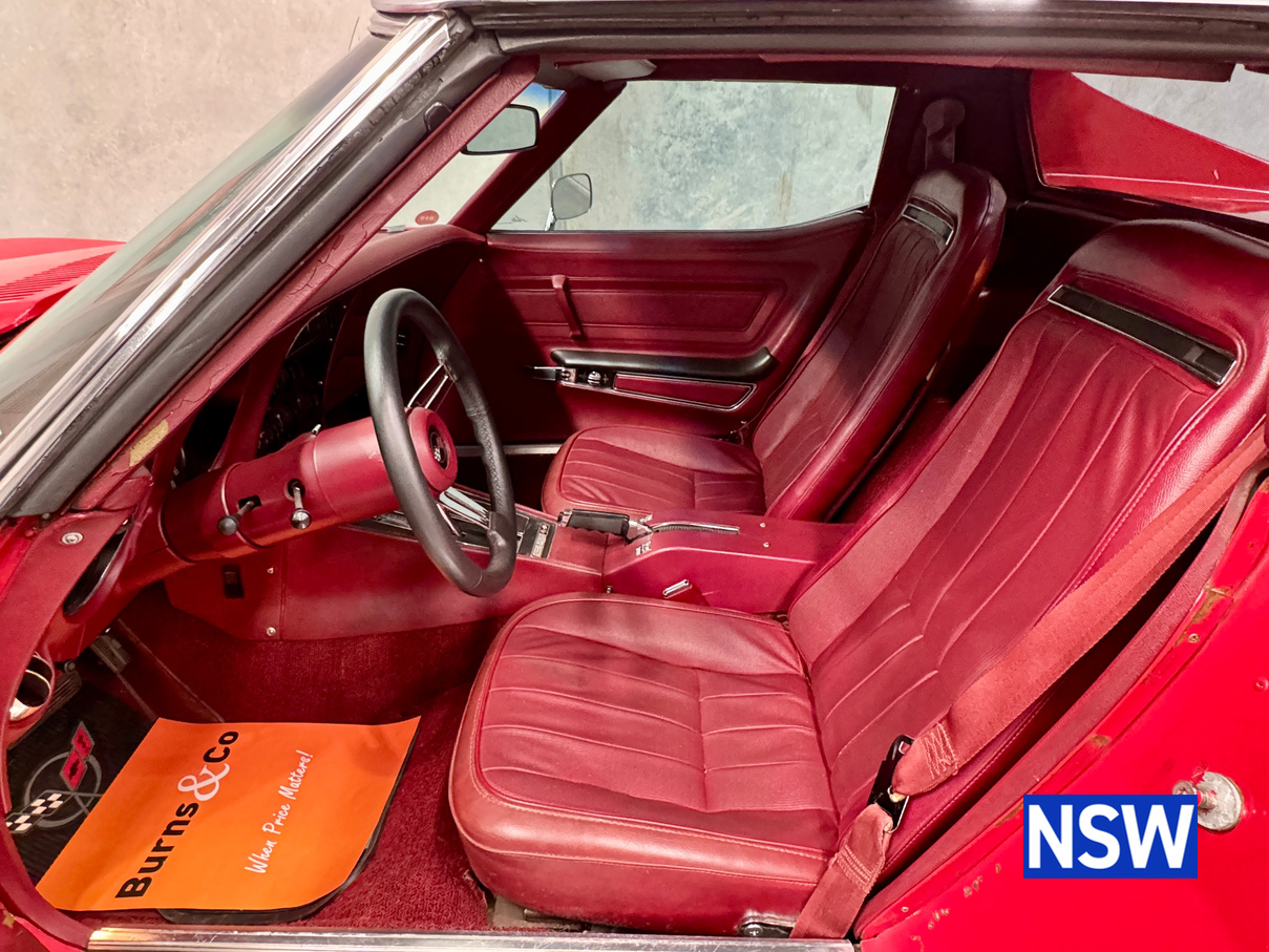 Striking red corvette with matching trim powered by 350 V8. Neat and tidy example with custom side exhaust, new front bushes, master cylinder replaced, transmission serviced, and matching factory engine.
