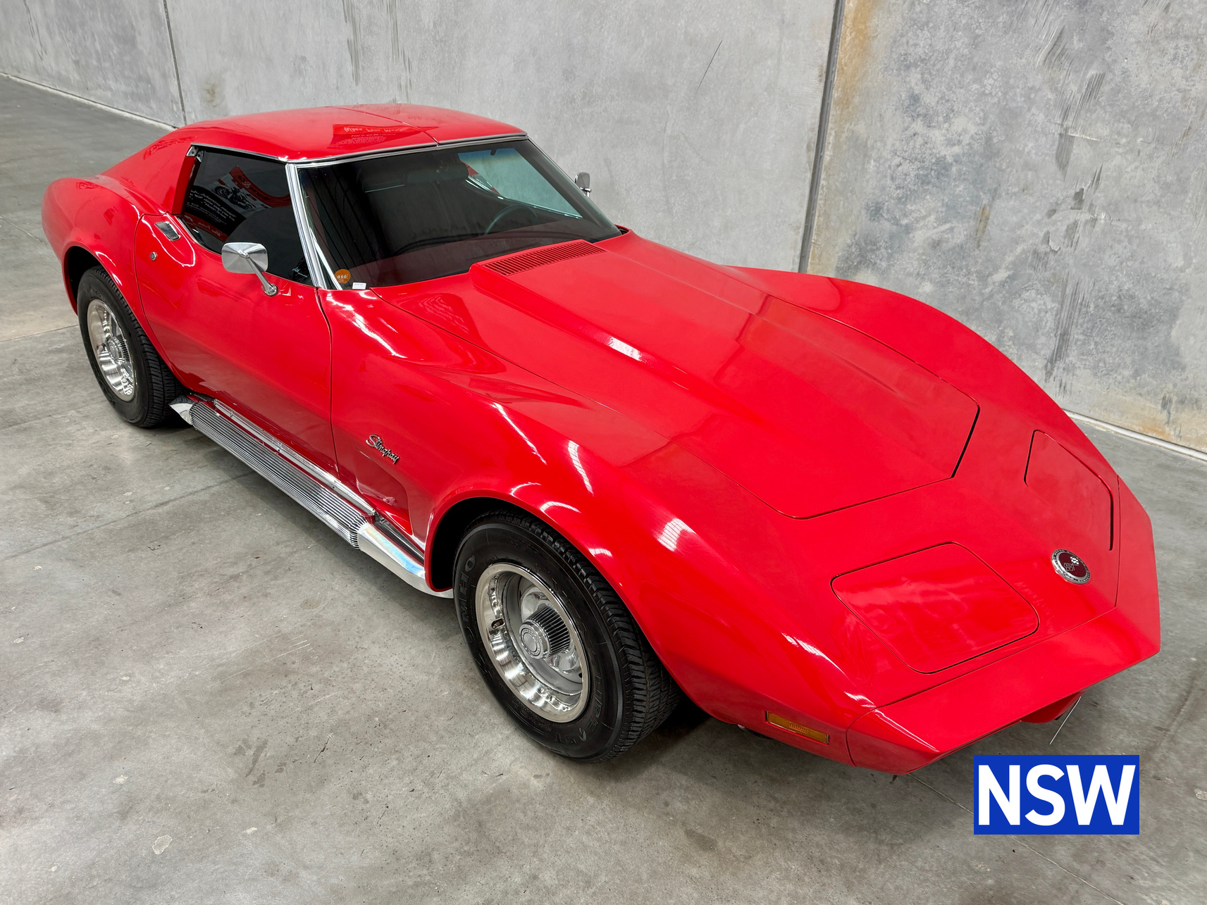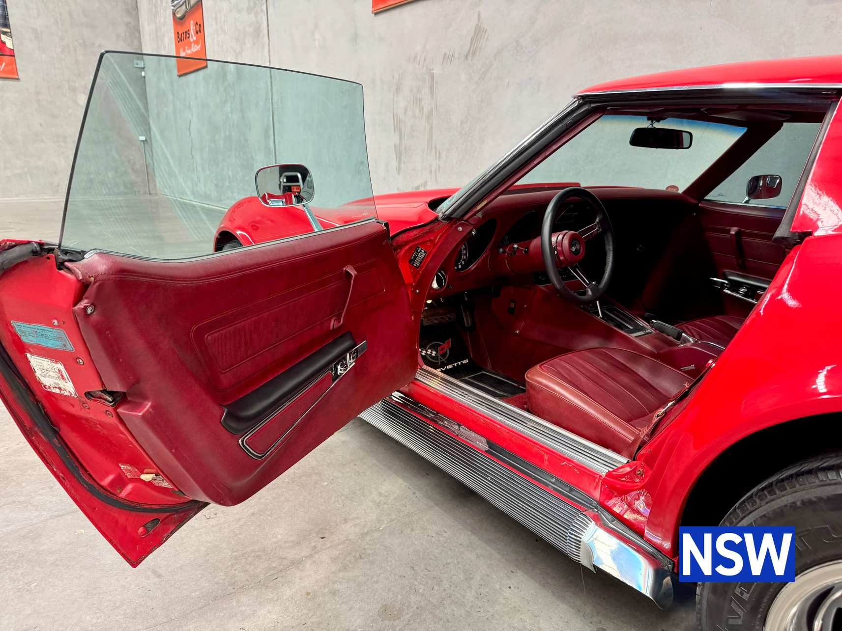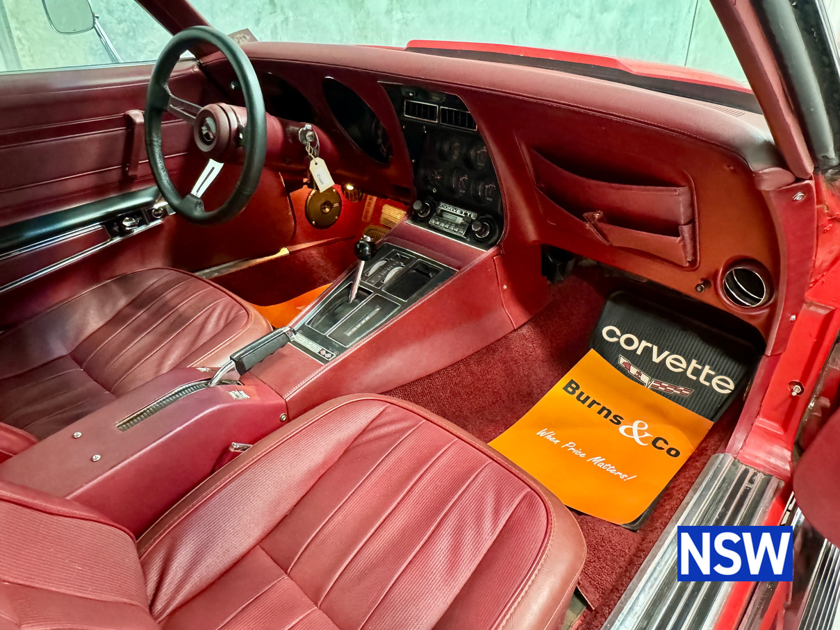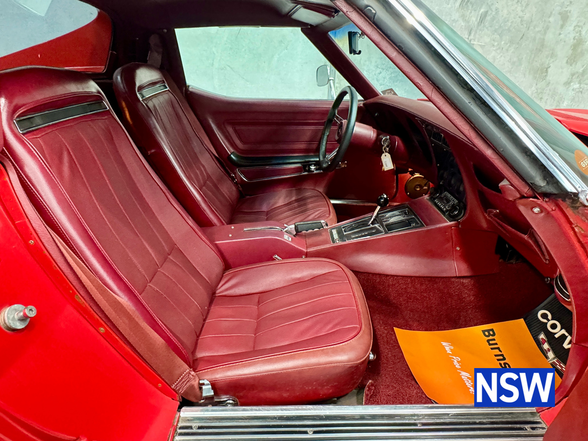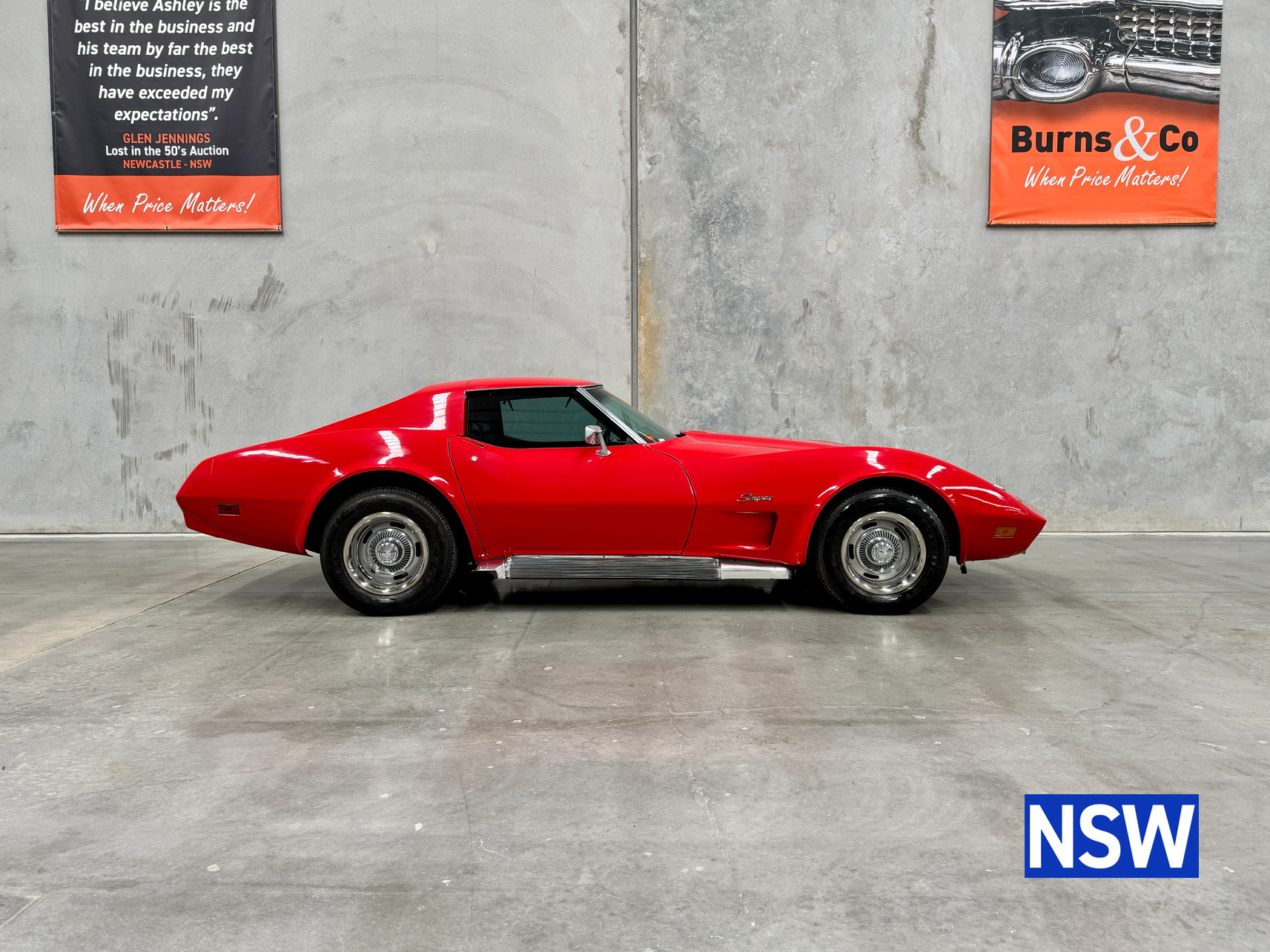 Striking red corvette with matching trim powered by 350 V8. Neat and tidy example with custom side exhaust, new front bushes, master cylinder replaced, transmission serviced, and matching factory engine.
