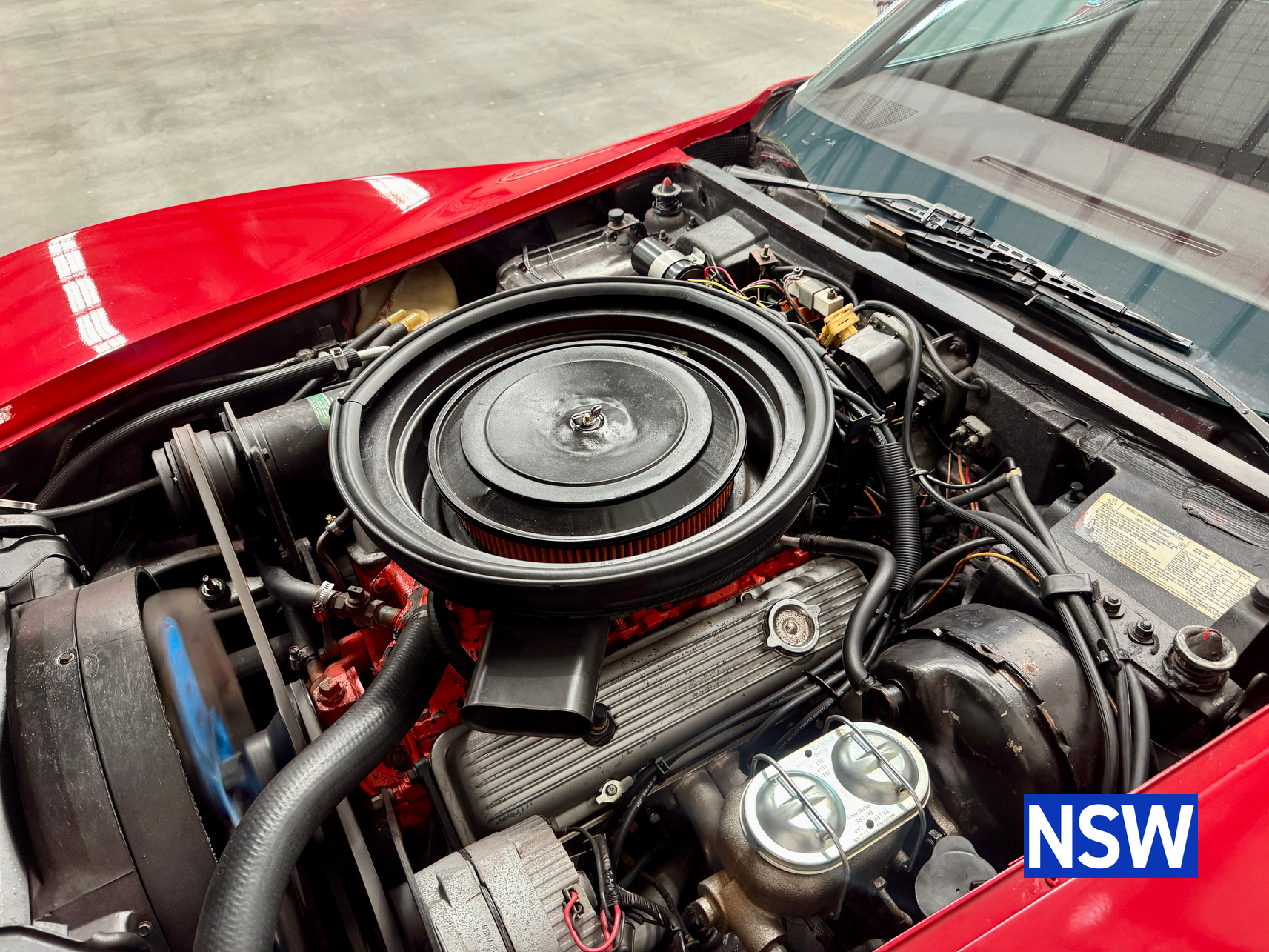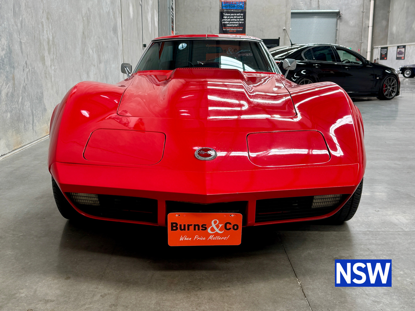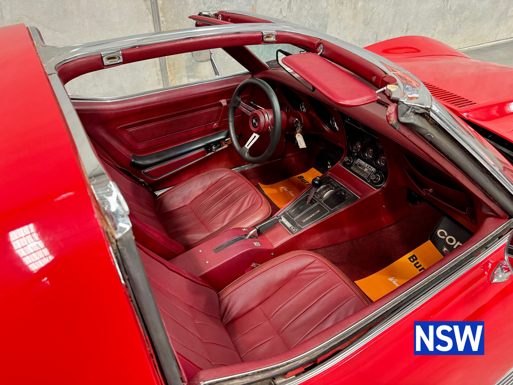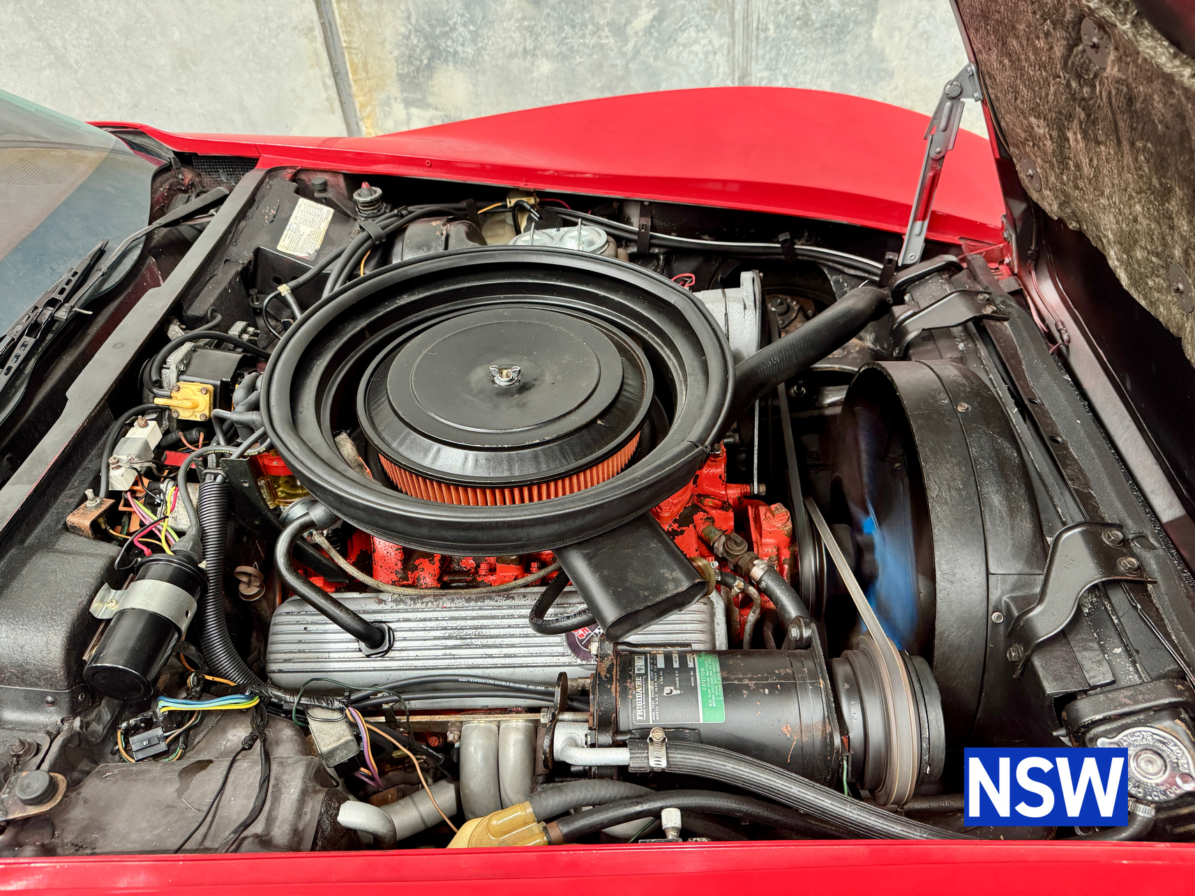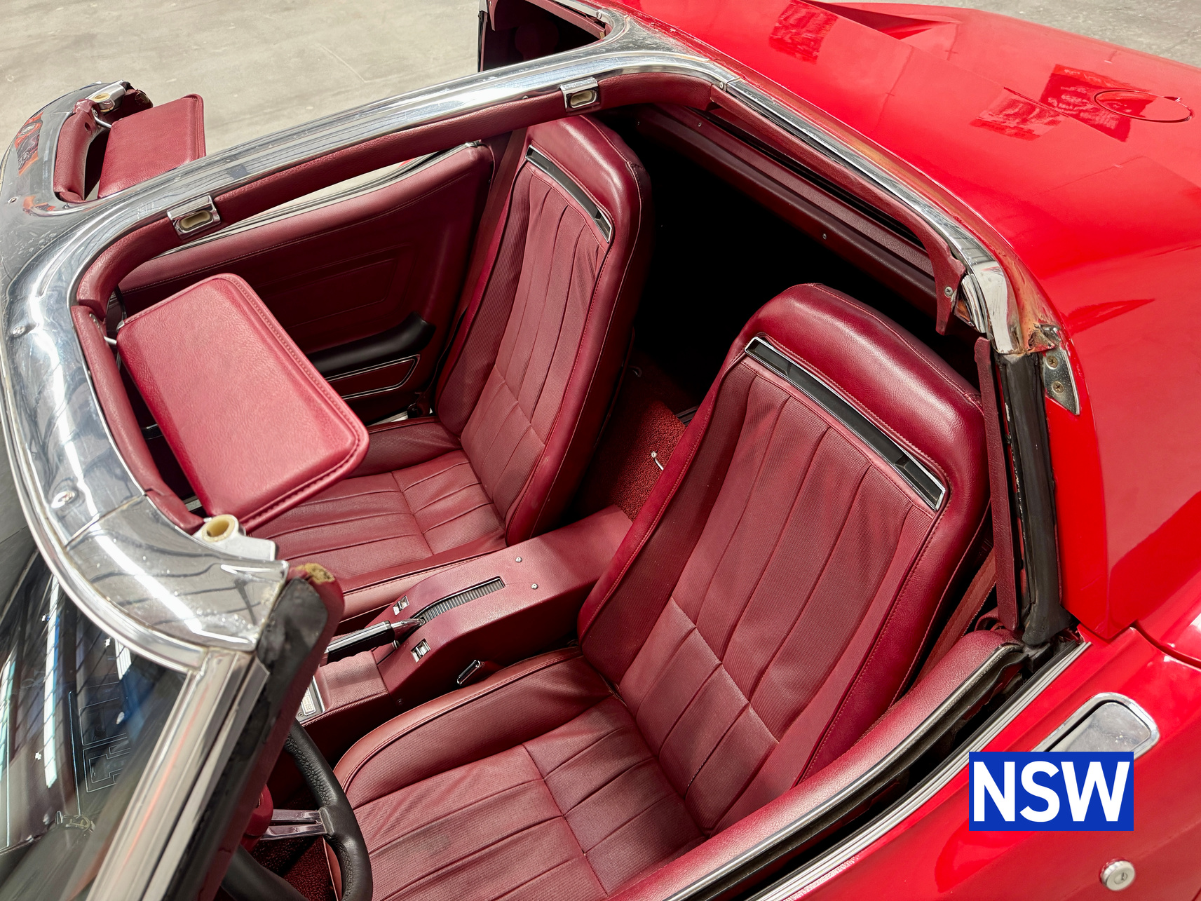 Striking red corvette with matching trim powered by 350 V8. Neat and tidy example with custom side exhaust, new front bushes, master cylinder replaced, transmission serviced, and matching factory engine.