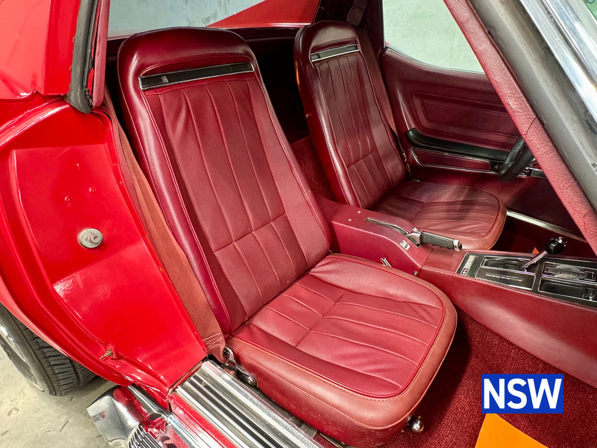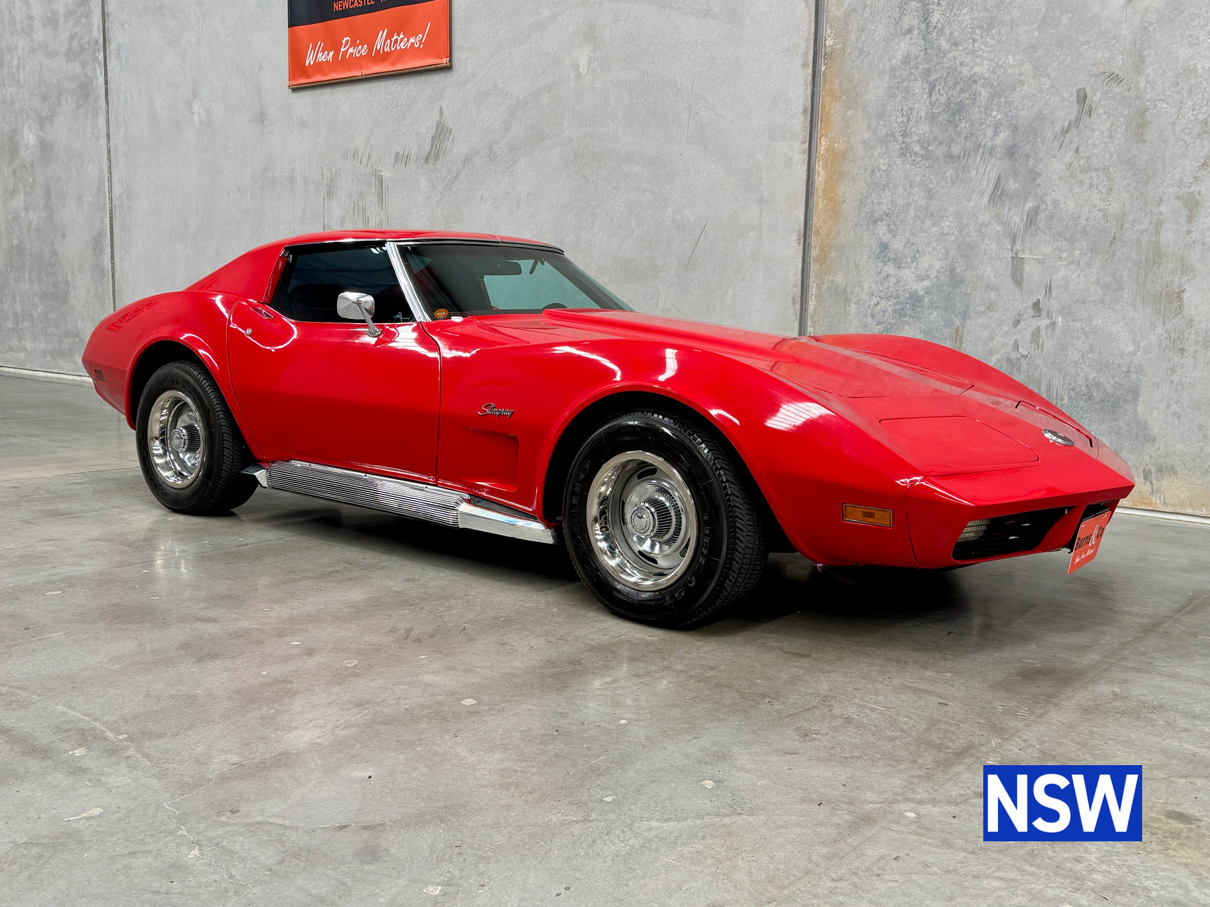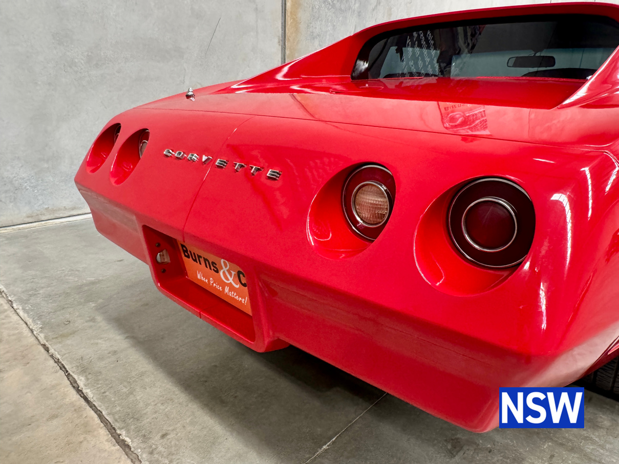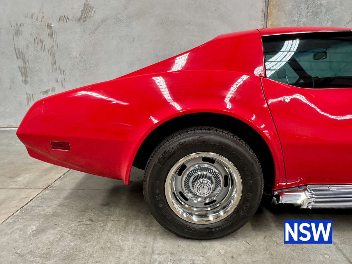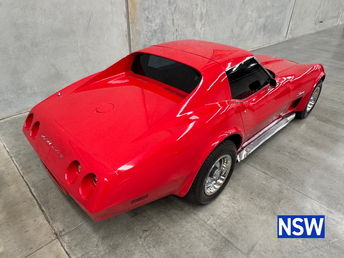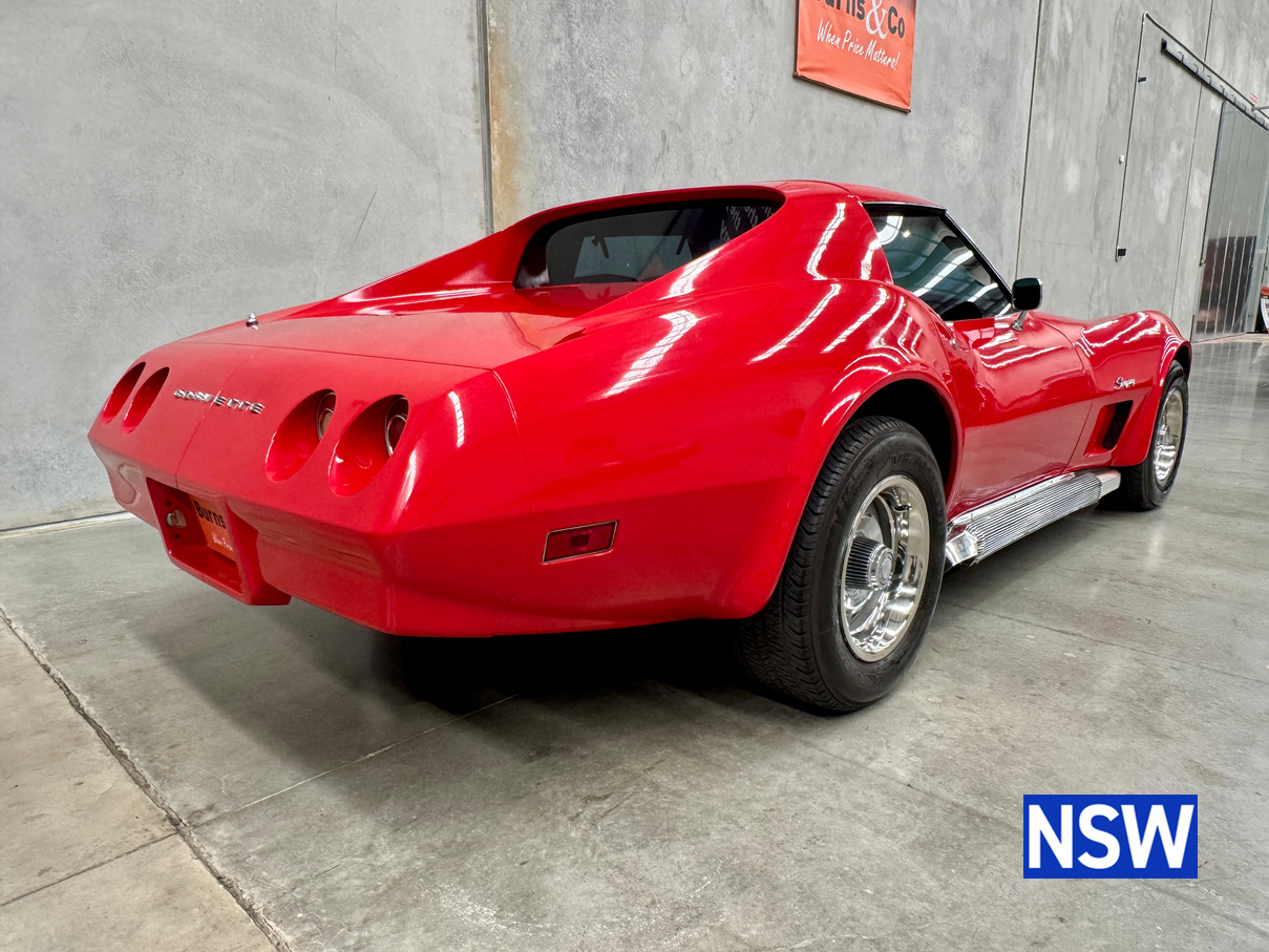 Striking red corvette with matching trim powered by 350 V8. Neat and tidy example with custom side exhaust, new front bushes, master cylinder replaced, transmission serviced, and matching factory engine.