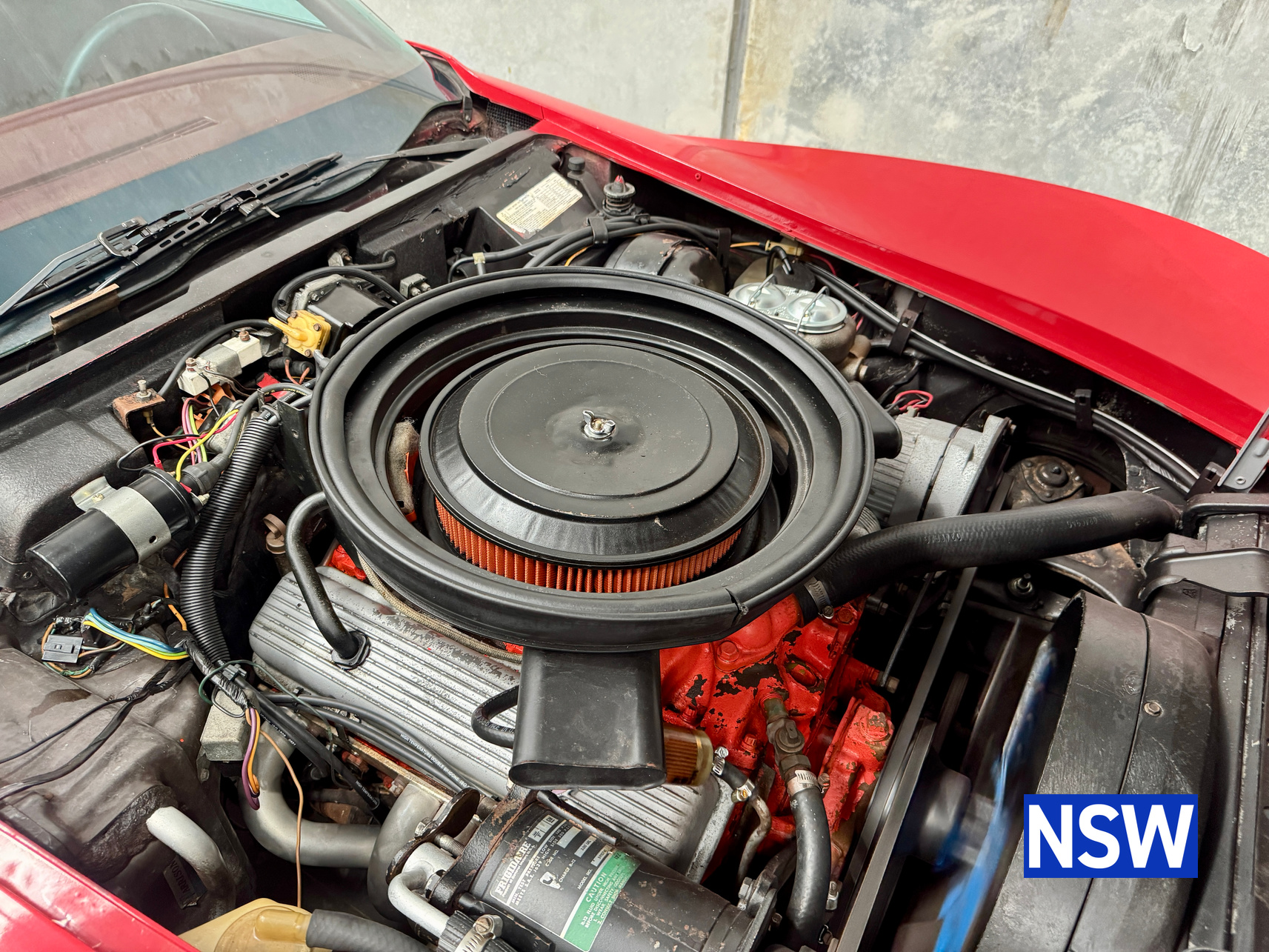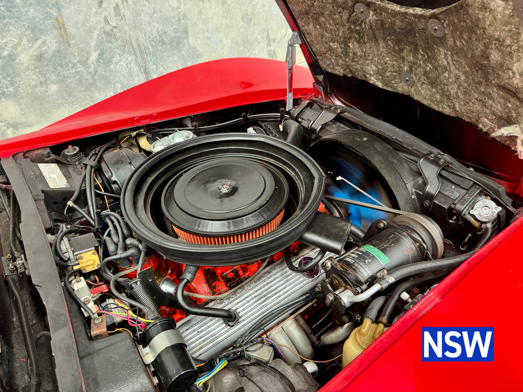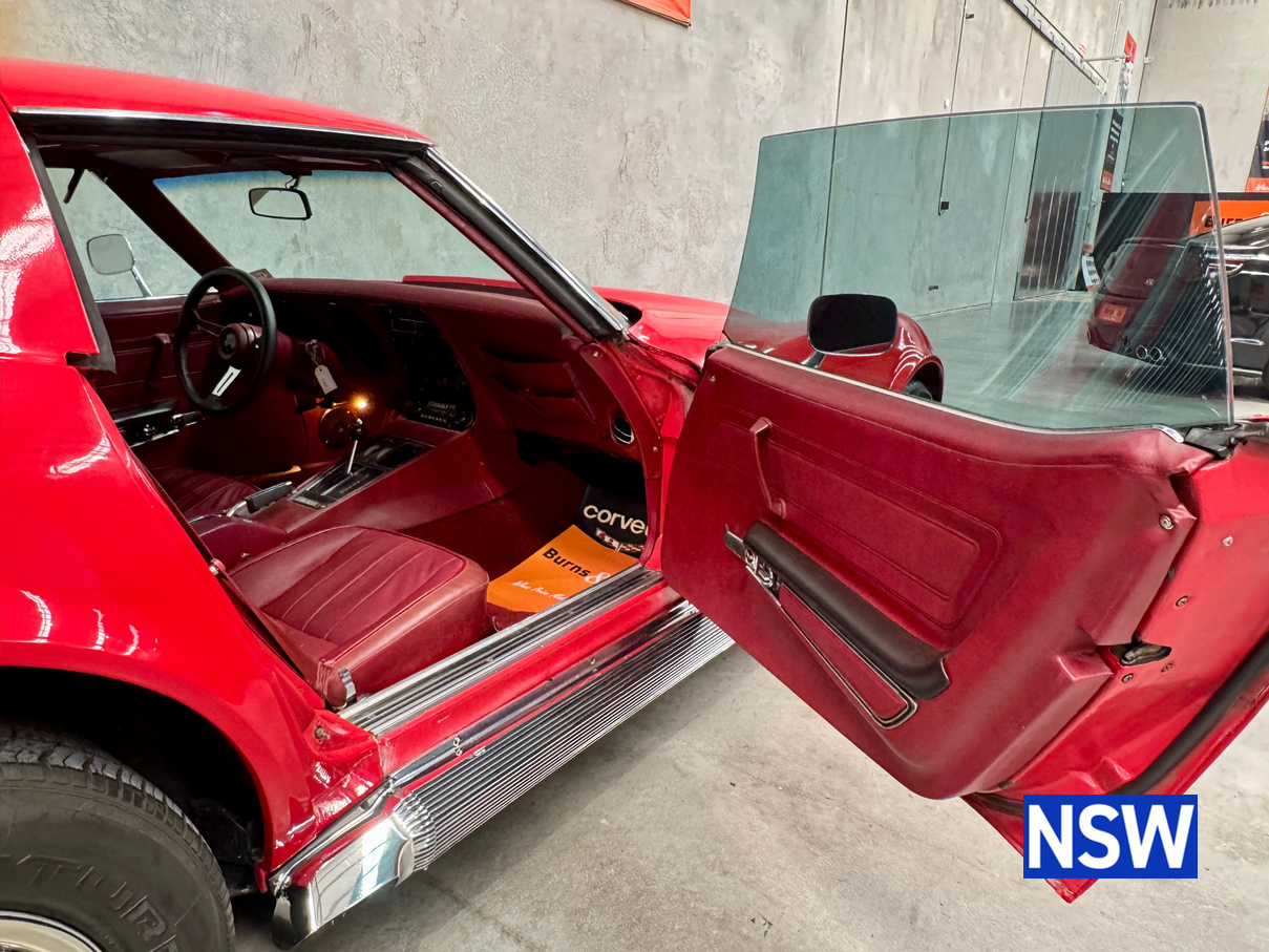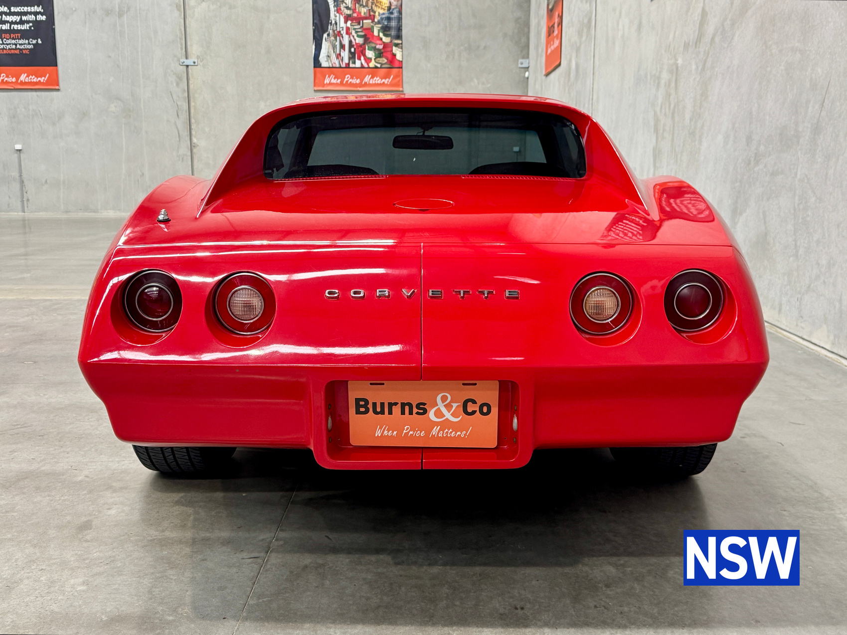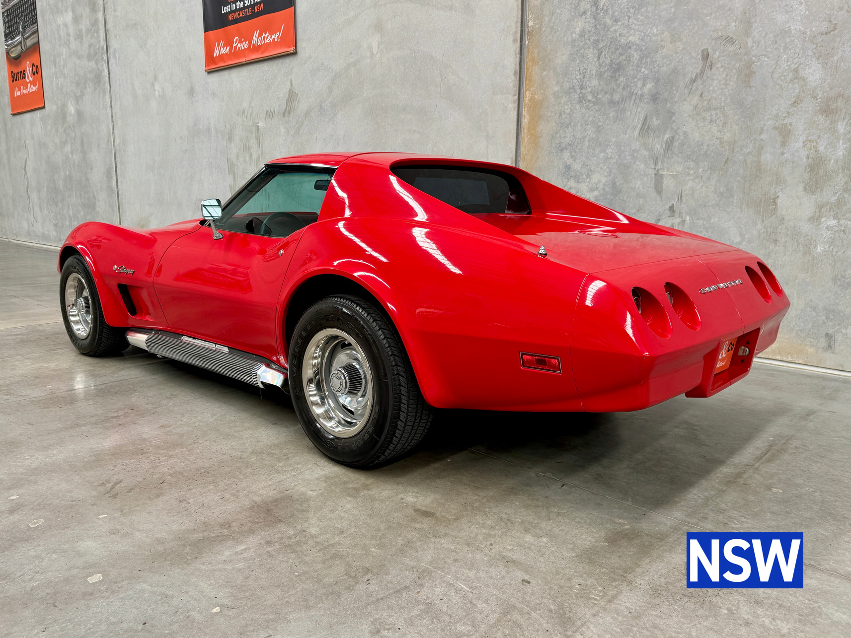 Striking red corvette with matching trim powered by 350 V8. Neat and tidy example with custom side exhaust, new front bushes, master cylinder replaced, transmission serviced, and matching factory engine.