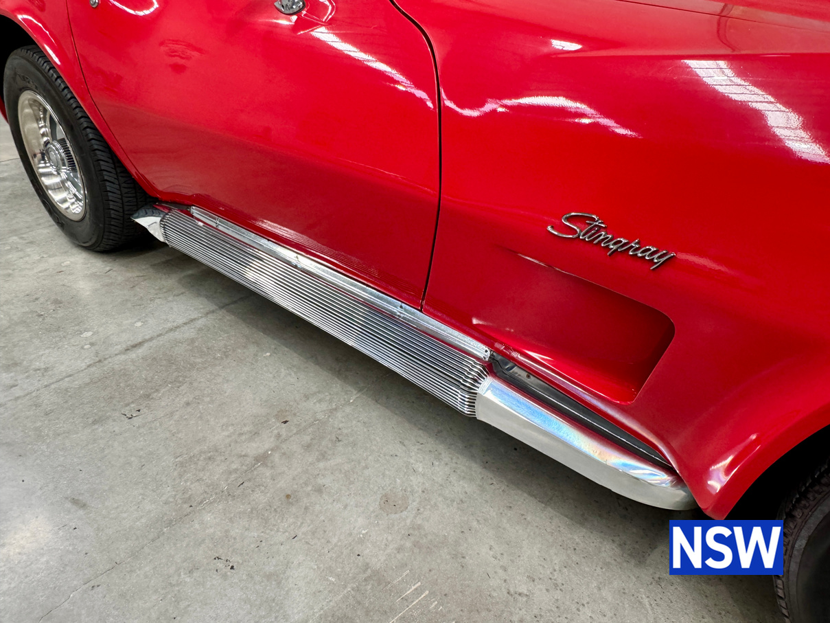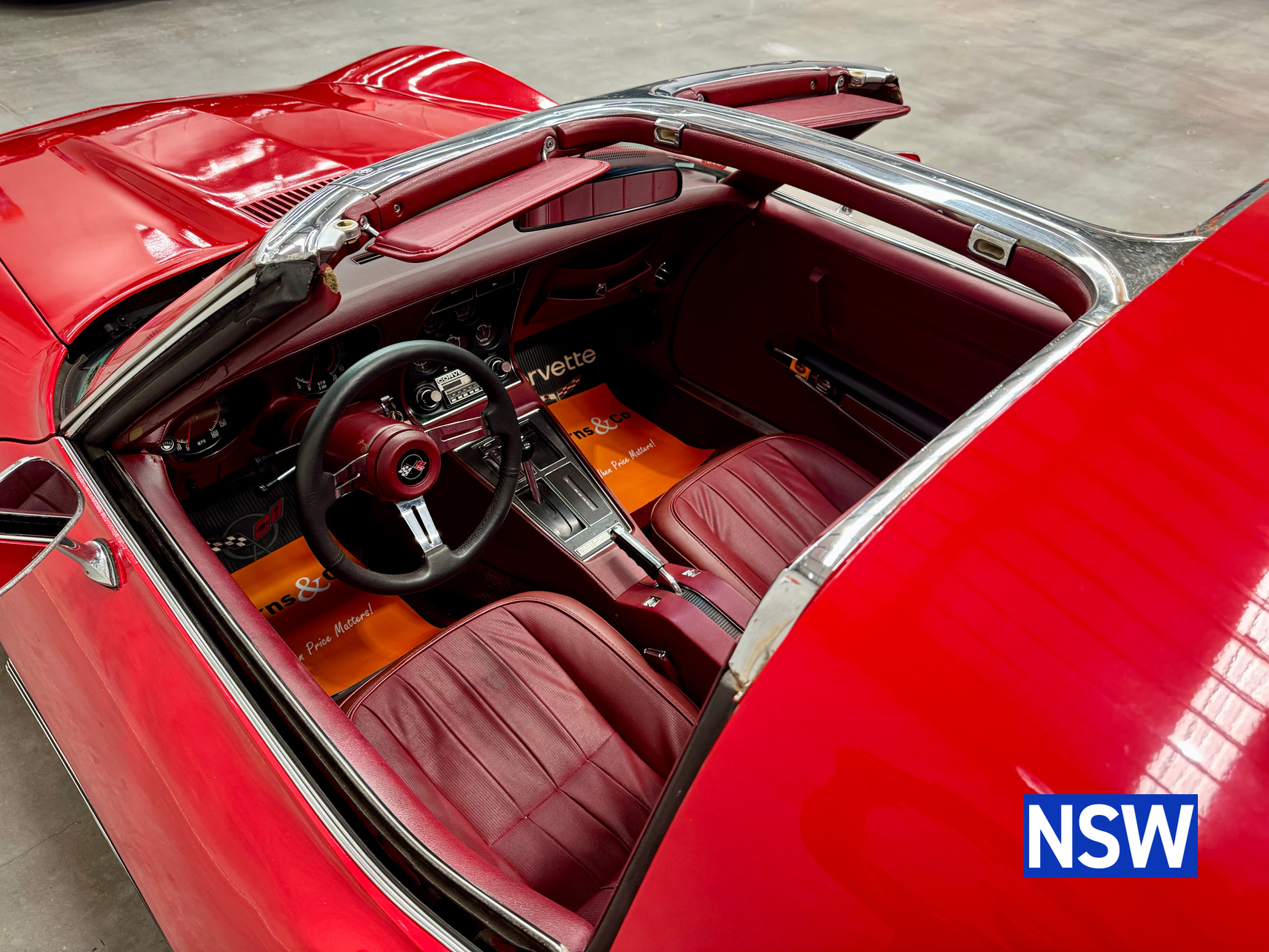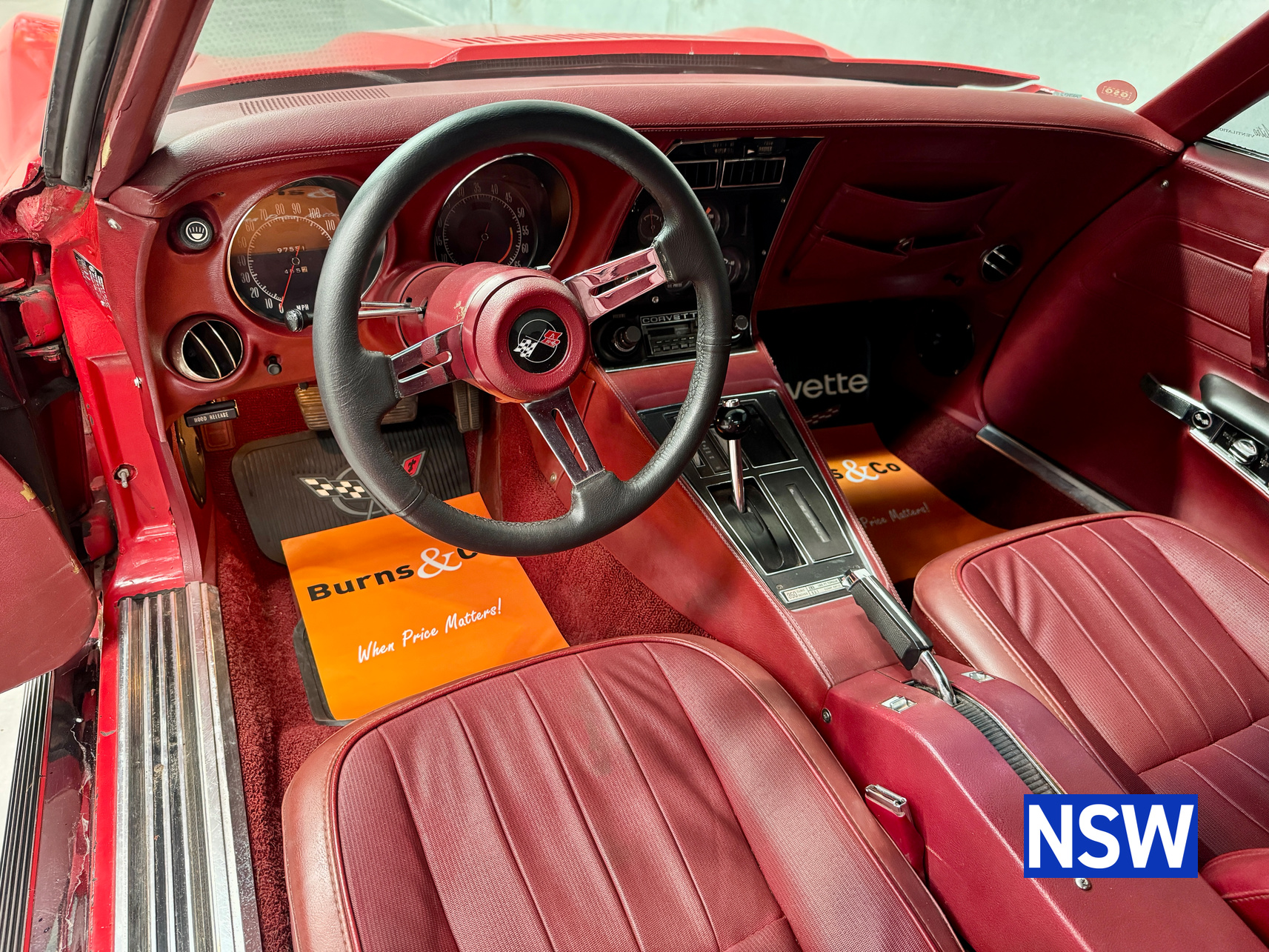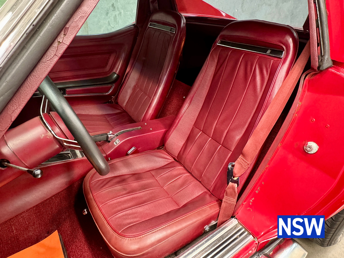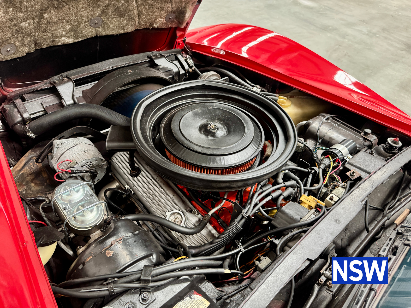 Striking red corvette with matching trim powered by 350 V8. Neat and tidy example with custom side exhaust, new front bushes, master cylinder replaced, transmission serviced, and matching factory engine.