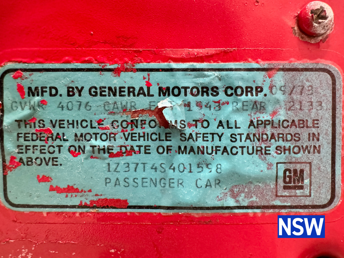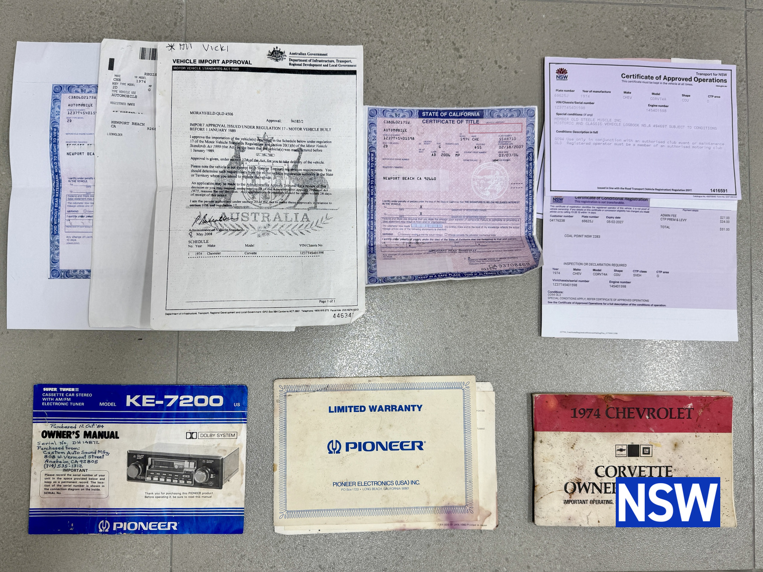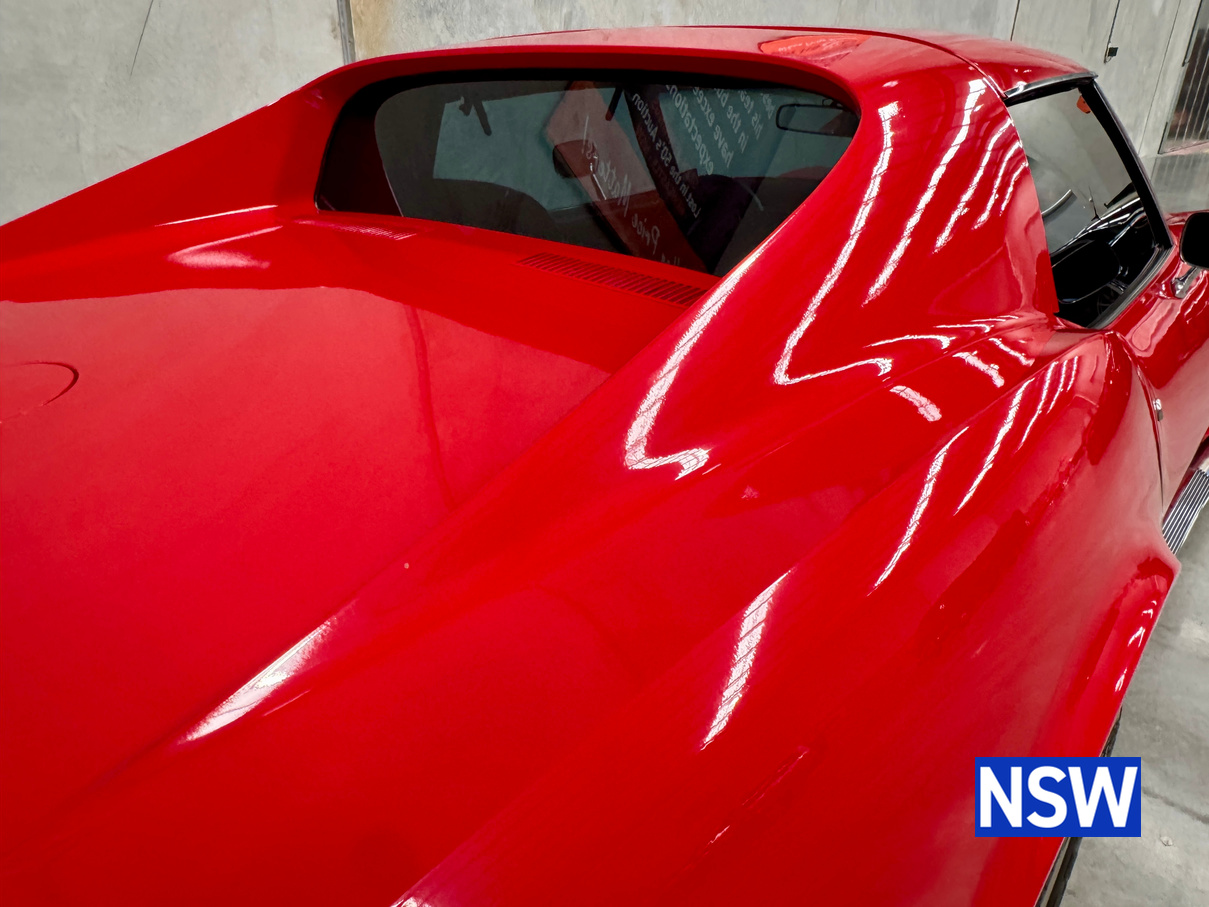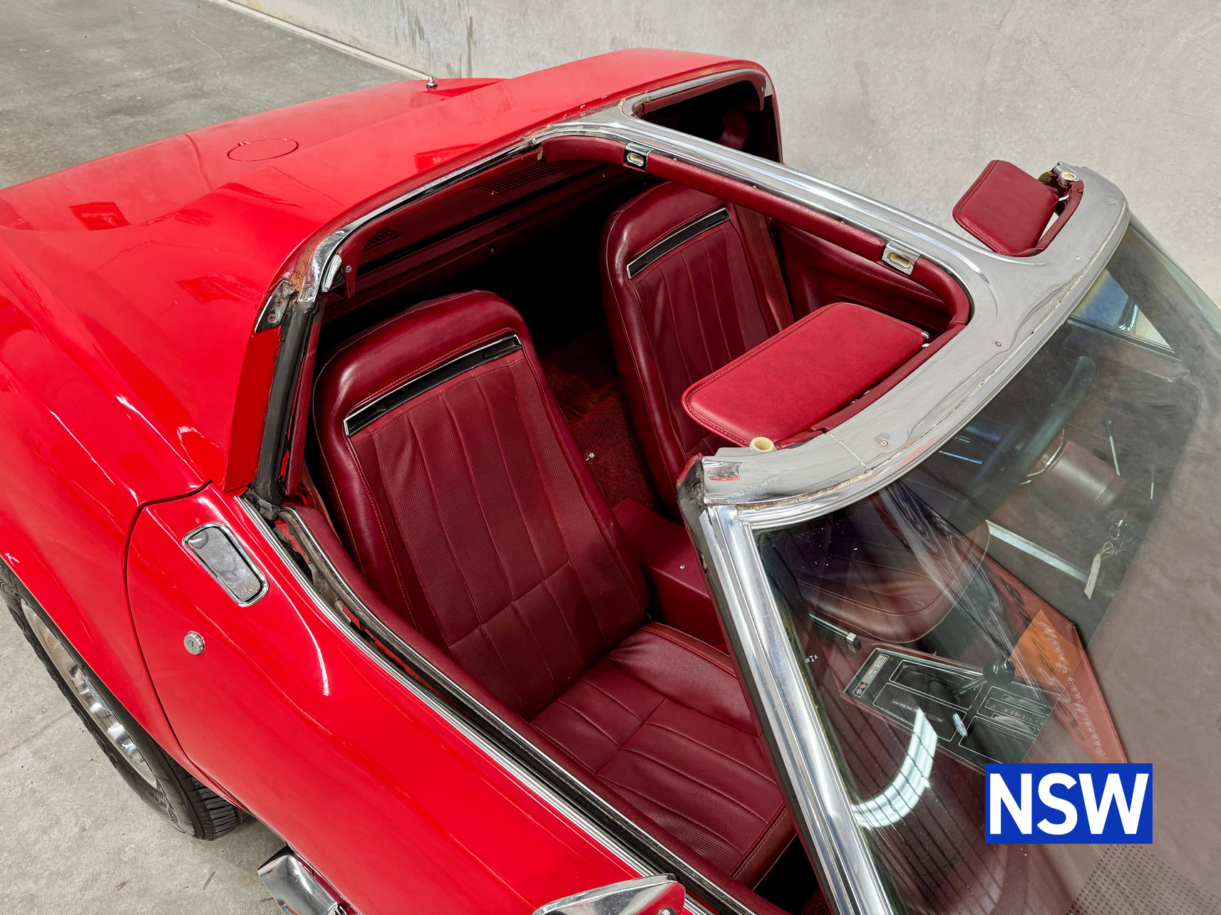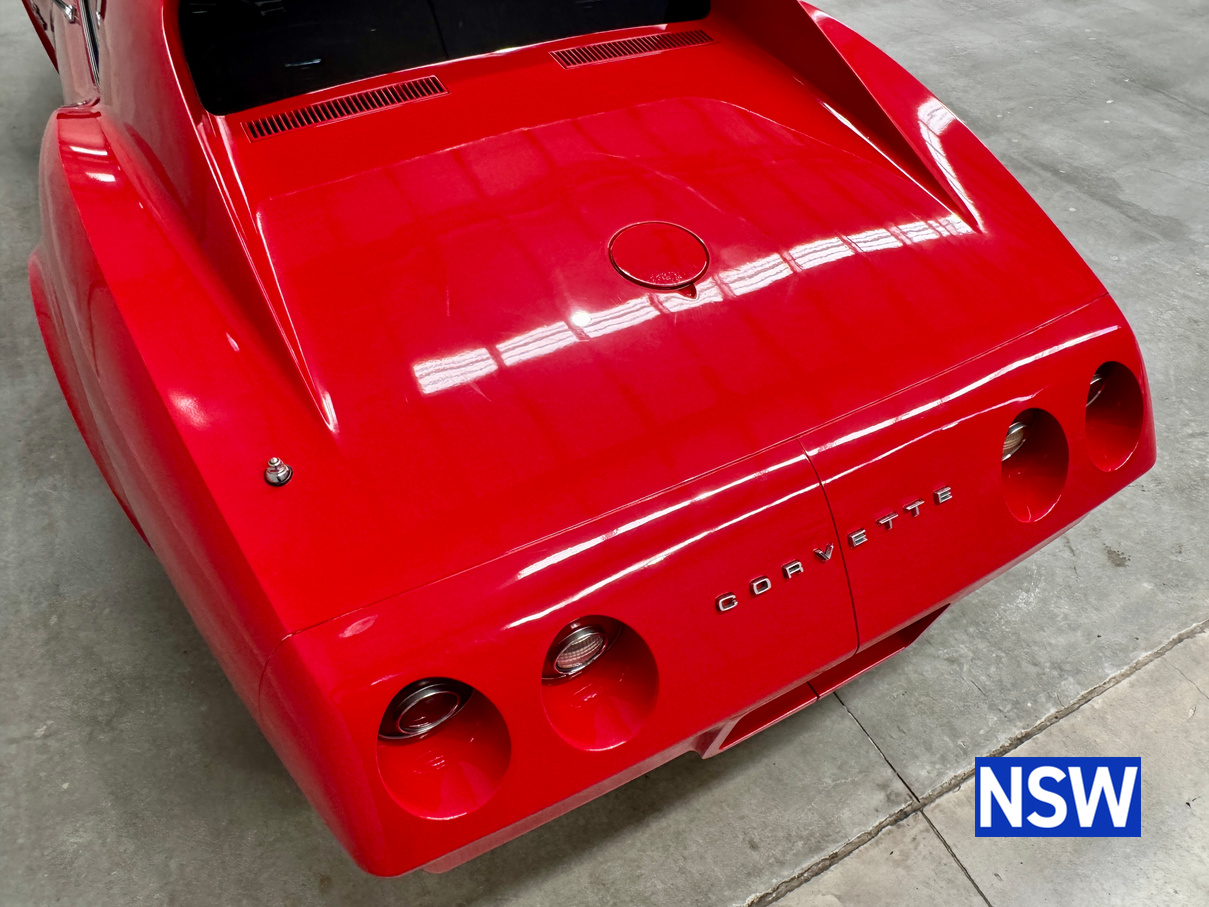 Striking red corvette with matching trim powered by 350 V8. Neat and tidy example with custom side exhaust, new front bushes, master cylinder replaced, transmission serviced, and matching factory engine.