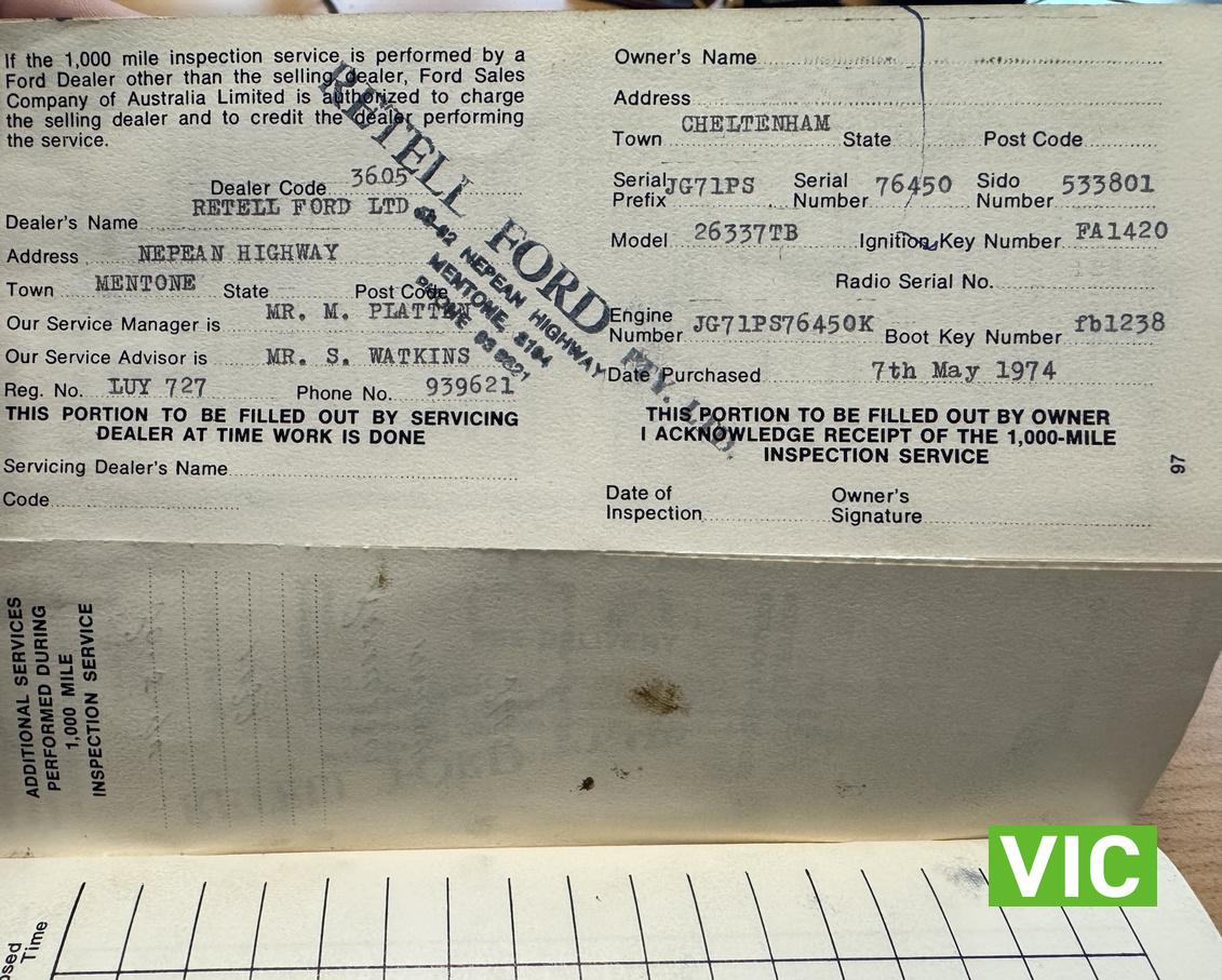 Comes with original owners book, originally sold from Retell Ford Mentone in May of 1974.