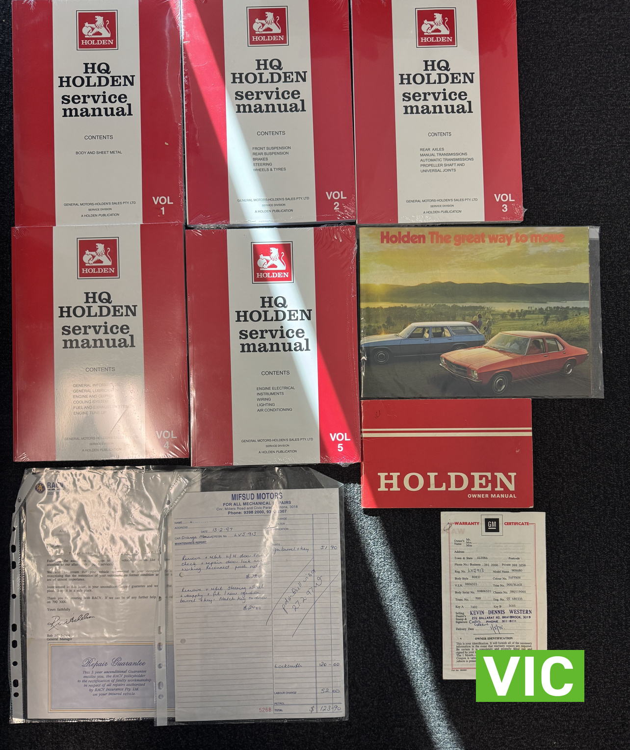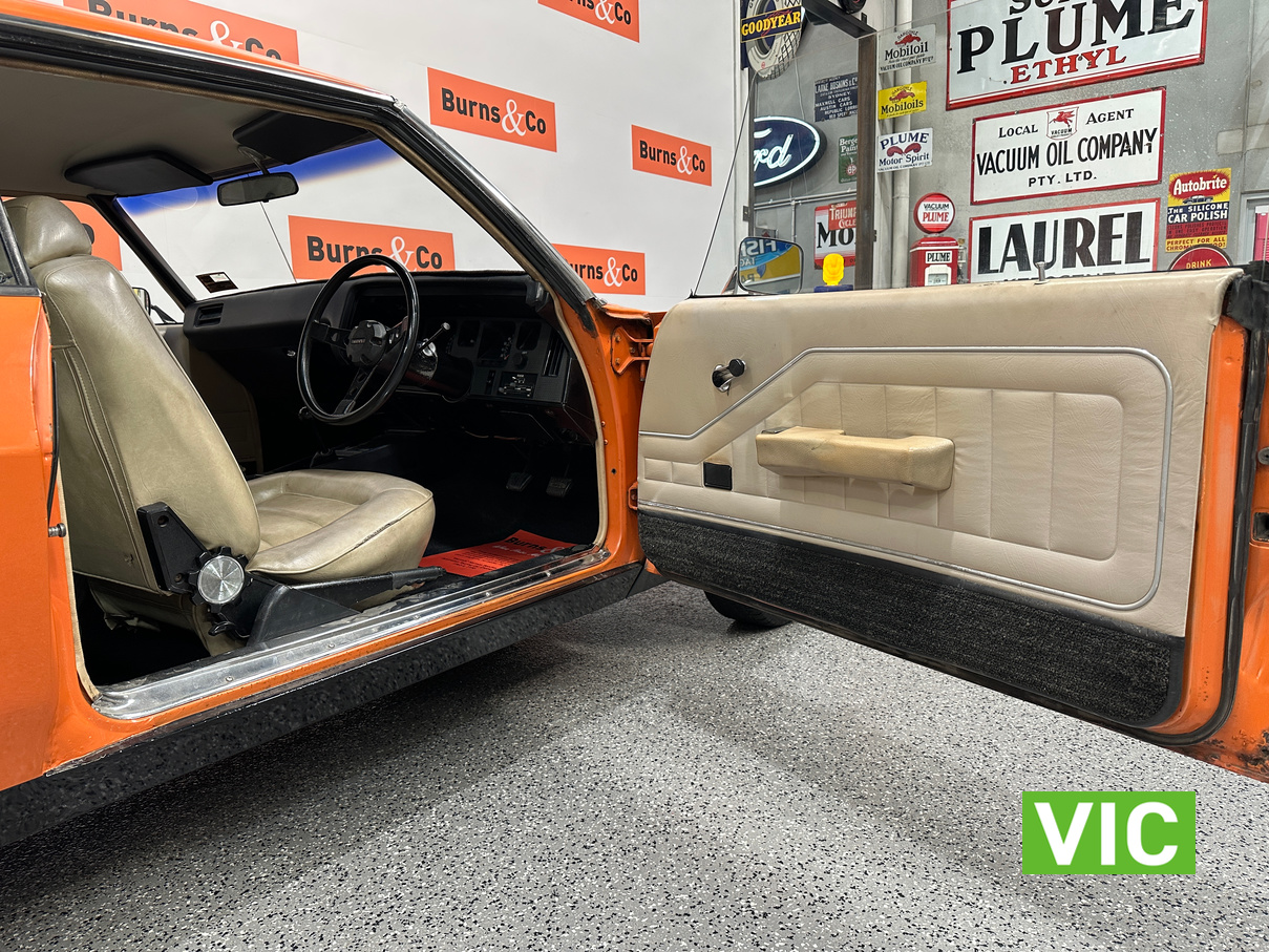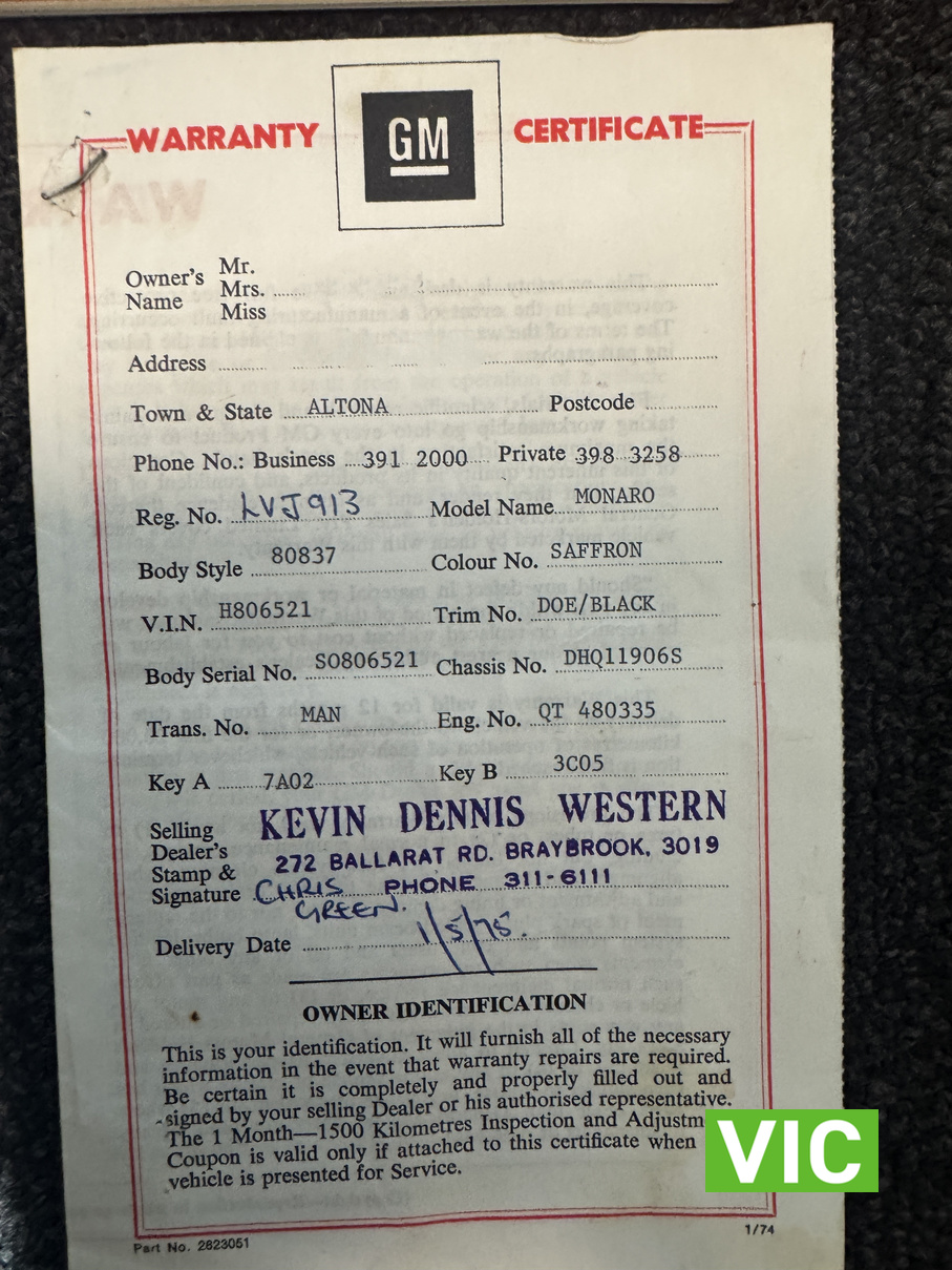 Purchased new on 1-5-1975 from Kevin Dennis Motor’s in Sunshine, Victoria remaining the same family until 2021! Purchased by Mr R Morris of Altona who had originally ordered a 4 door Monaro 308 manual in gun metal grey, however due to a workers strike at the GMH Plant the dealer informed him the new car delivery would be behind schedule and there was going to be a price increase upon arrival. The Dealer offered Mr Morris any Monaros that he had in stock which included a HQ Monaro 350 and this 308 GTS Manual. Fast forward 50+ years and this HQ 308 GTS is a survivor car that has a terrific pedigree and plenty of provenance to go with it. Still complete with the original key, airchief radio, some handbooks and warranty cards including brand new service manuals. It doesn’t get much better that a Saffron GTS Monaro.