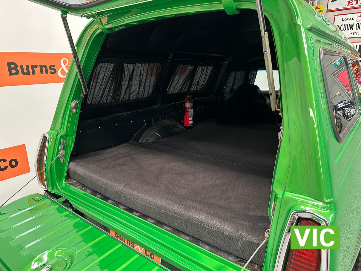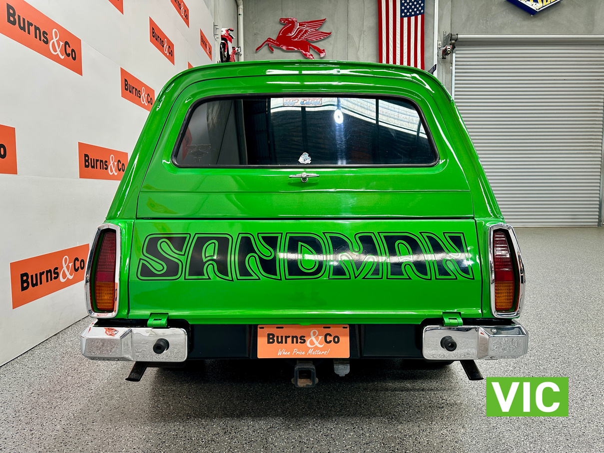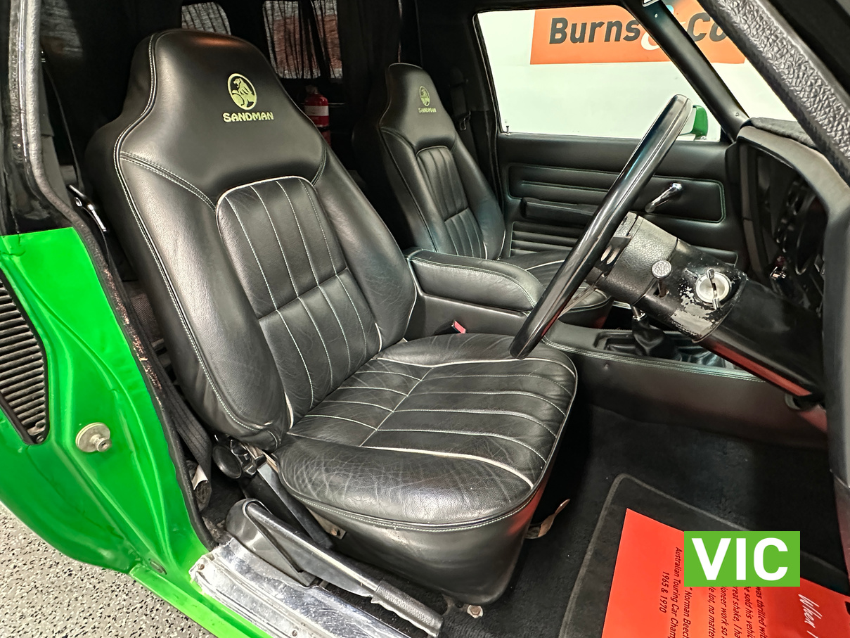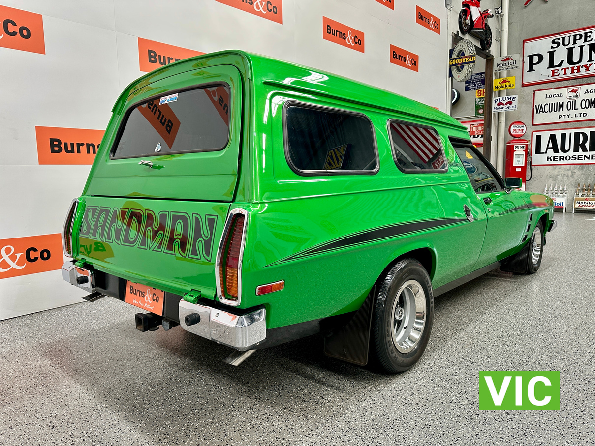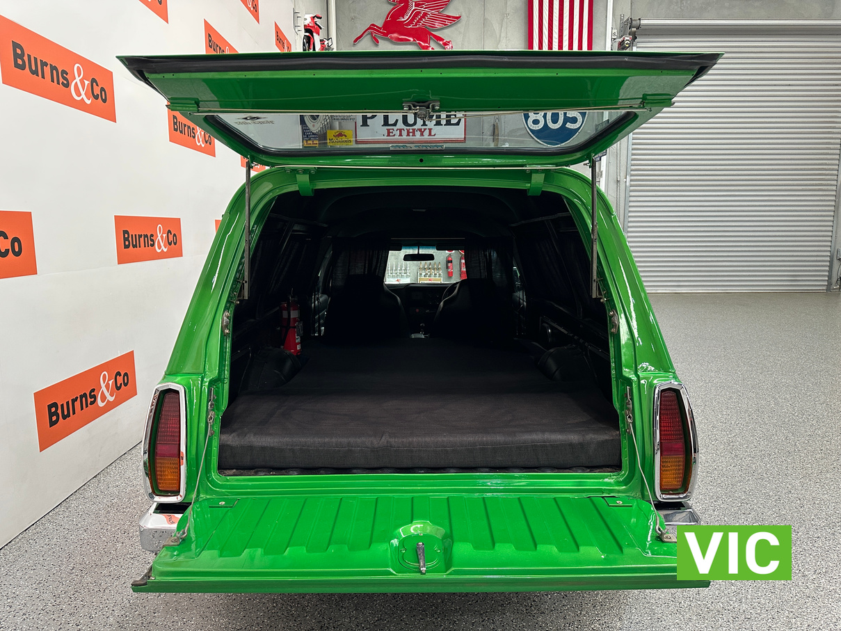 Genuine HJ Sandman Panel Van! Built at Brisbane’s Acacia Ridge plant on December 5, 1975. Sold new by Dustings of Burwood Holden VIC. This is a factory Jamaica Lime with Gazelle trim 253 4.2L V8 four-speed manual car. It is a genuine XX7 plated example confirming it is a Sandman. Fitted with a 3.08 Salisbury diff, Dual-headlight front end and Sandman GTS wheels (widened rear). The body has been fully refinished in a vibrant metallic green, offering a modern interpretation of its original colour scheme.