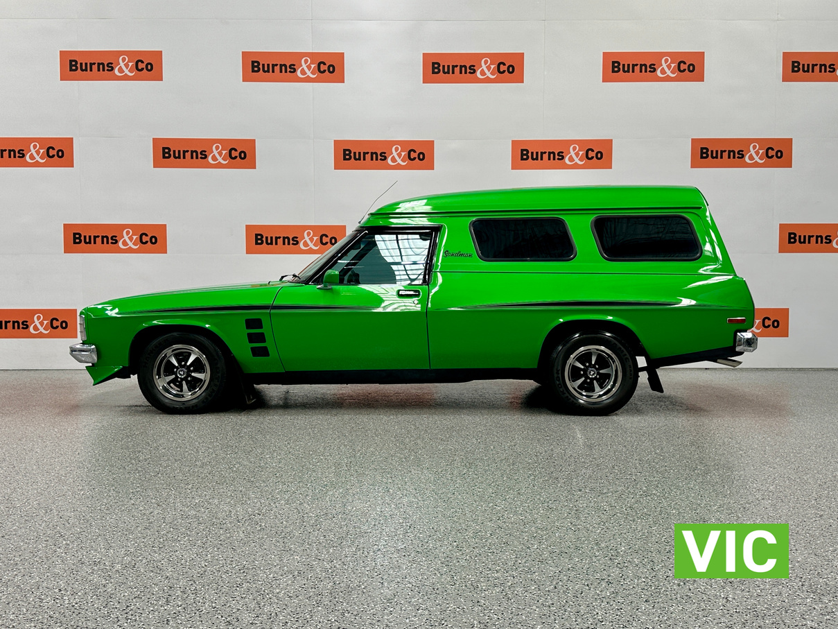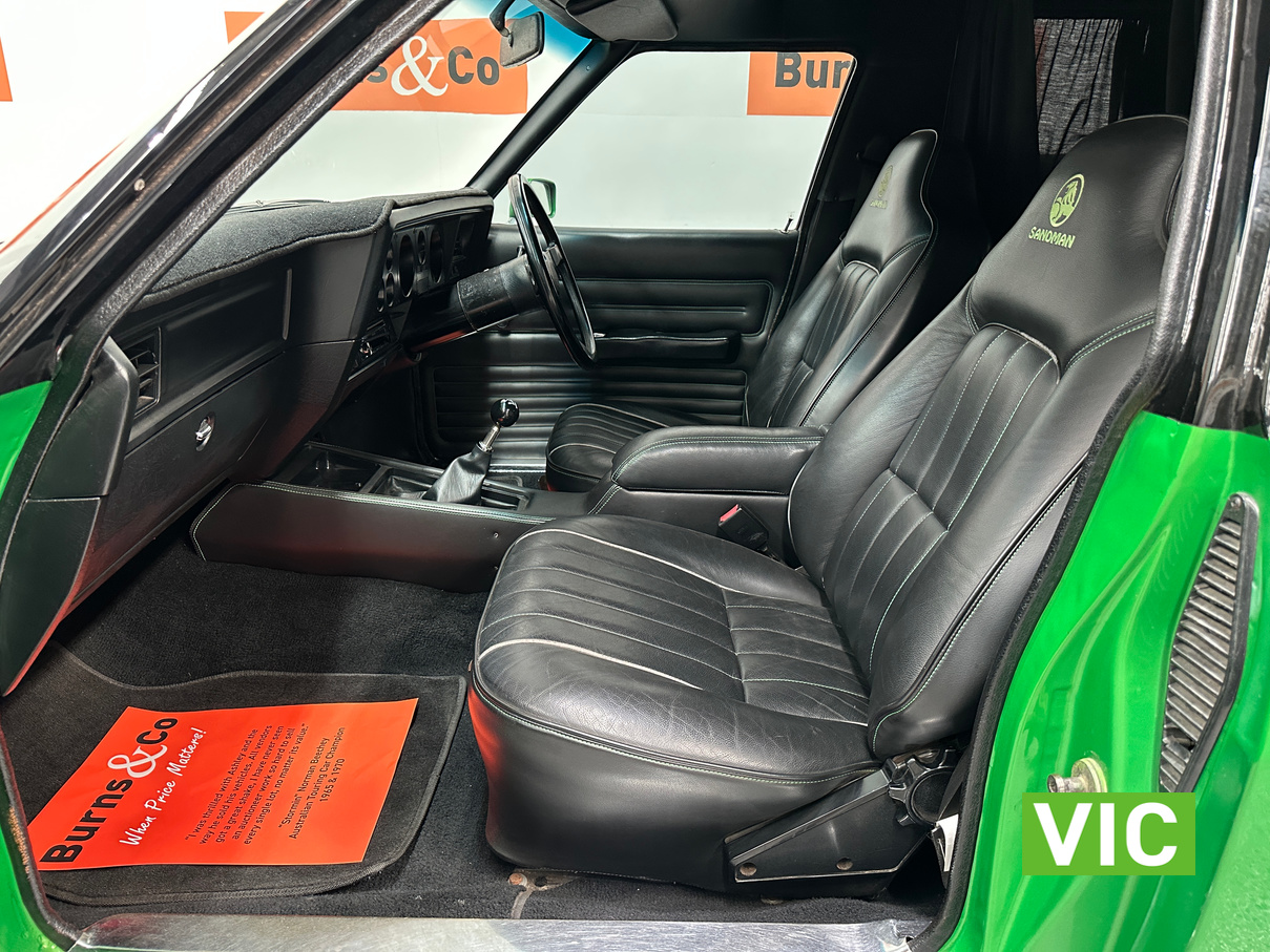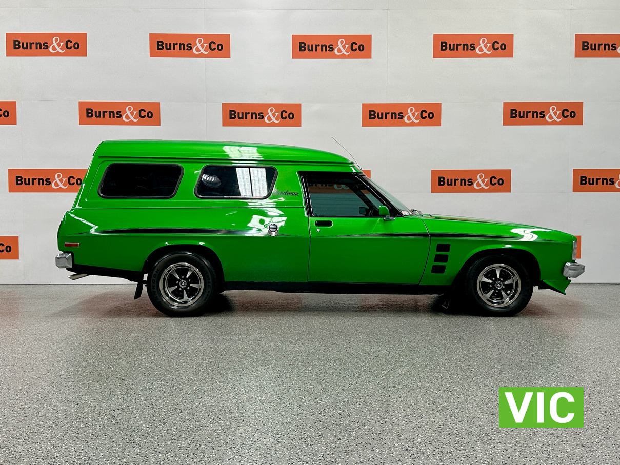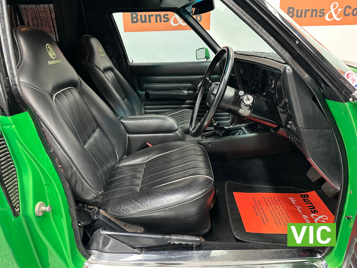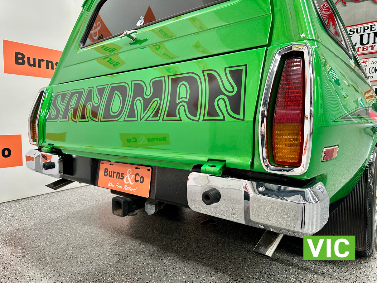 Genuine HJ Sandman Panel Van! Built at Brisbane’s Acacia Ridge plant on December 5, 1975. Sold new by Dustings of Burwood Holden VIC. This is a factory Jamaica Lime with Gazelle trim 253 4.2L V8 four-speed manual car. It is a genuine XX7 plated example confirming it is a Sandman. Fitted with a 3.08 Salisbury diff, Dual-headlight front end and Sandman GTS wheels (widened rear). The body has been fully refinished in a vibrant metallic green, offering a modern interpretation of its original colour scheme.