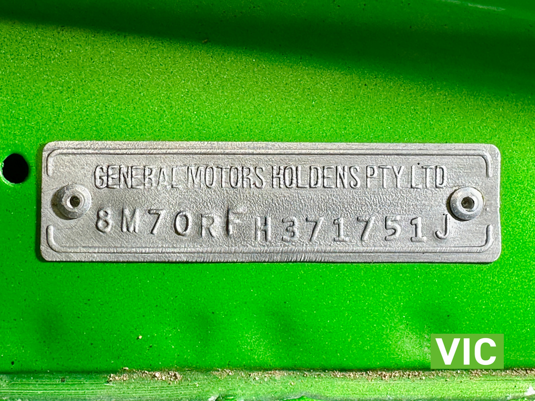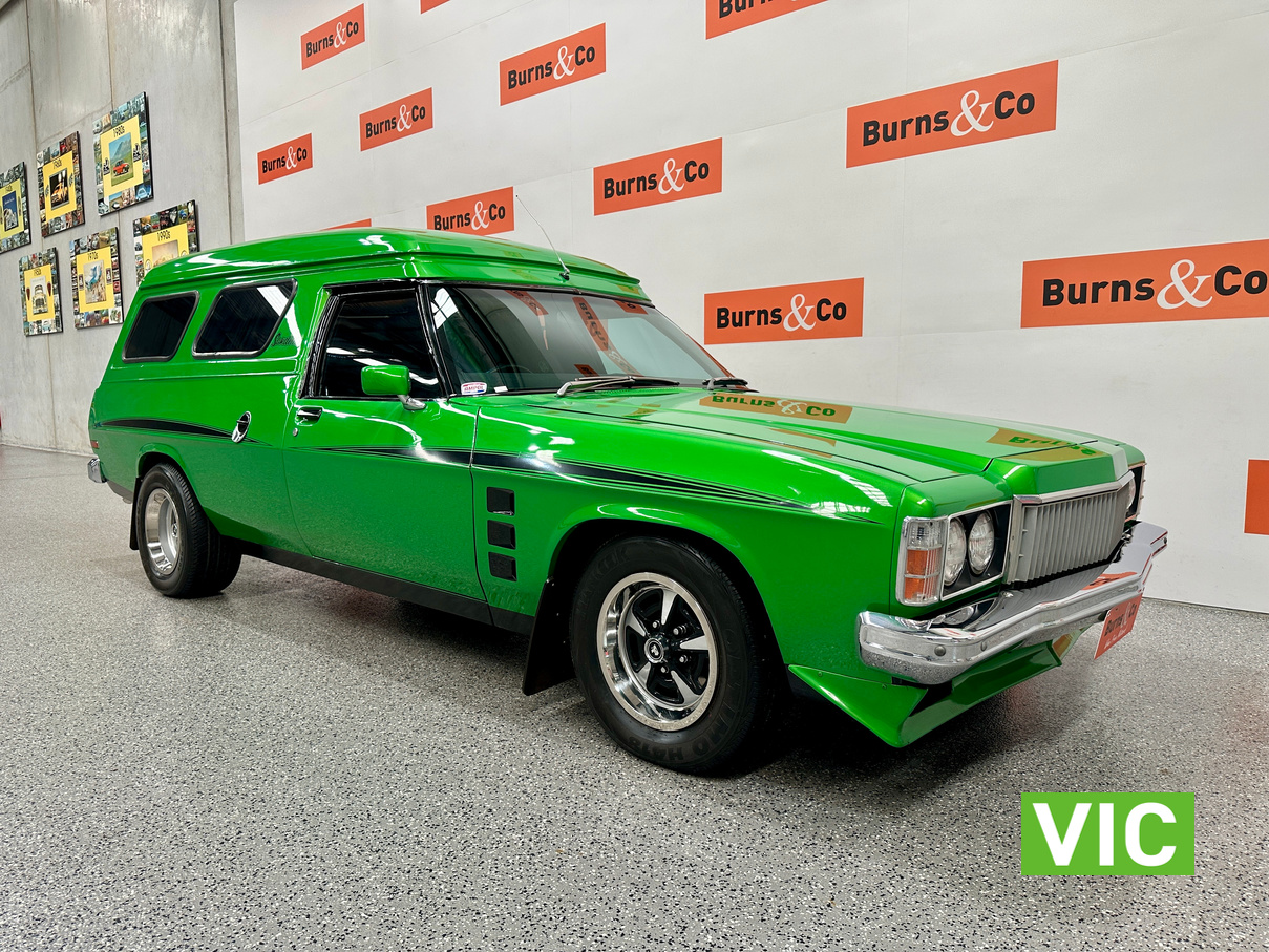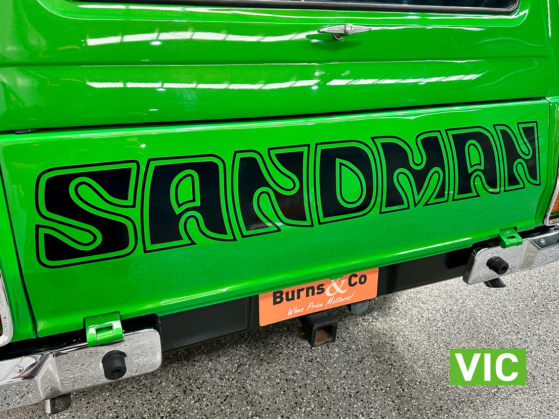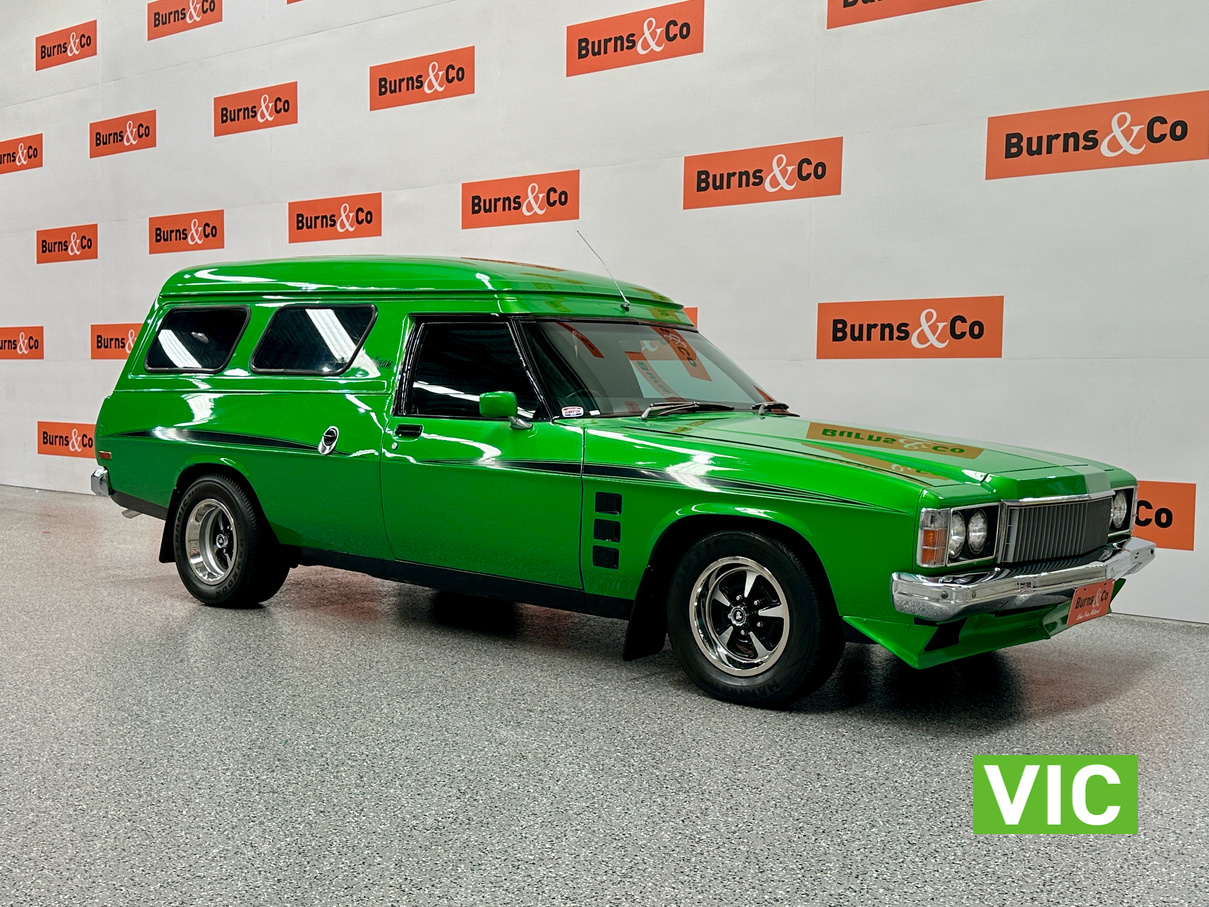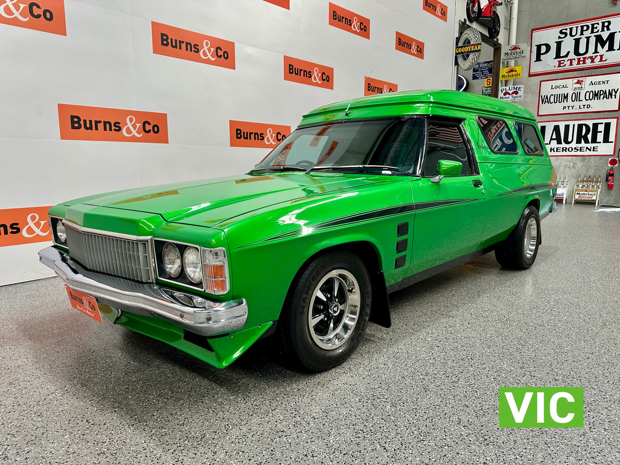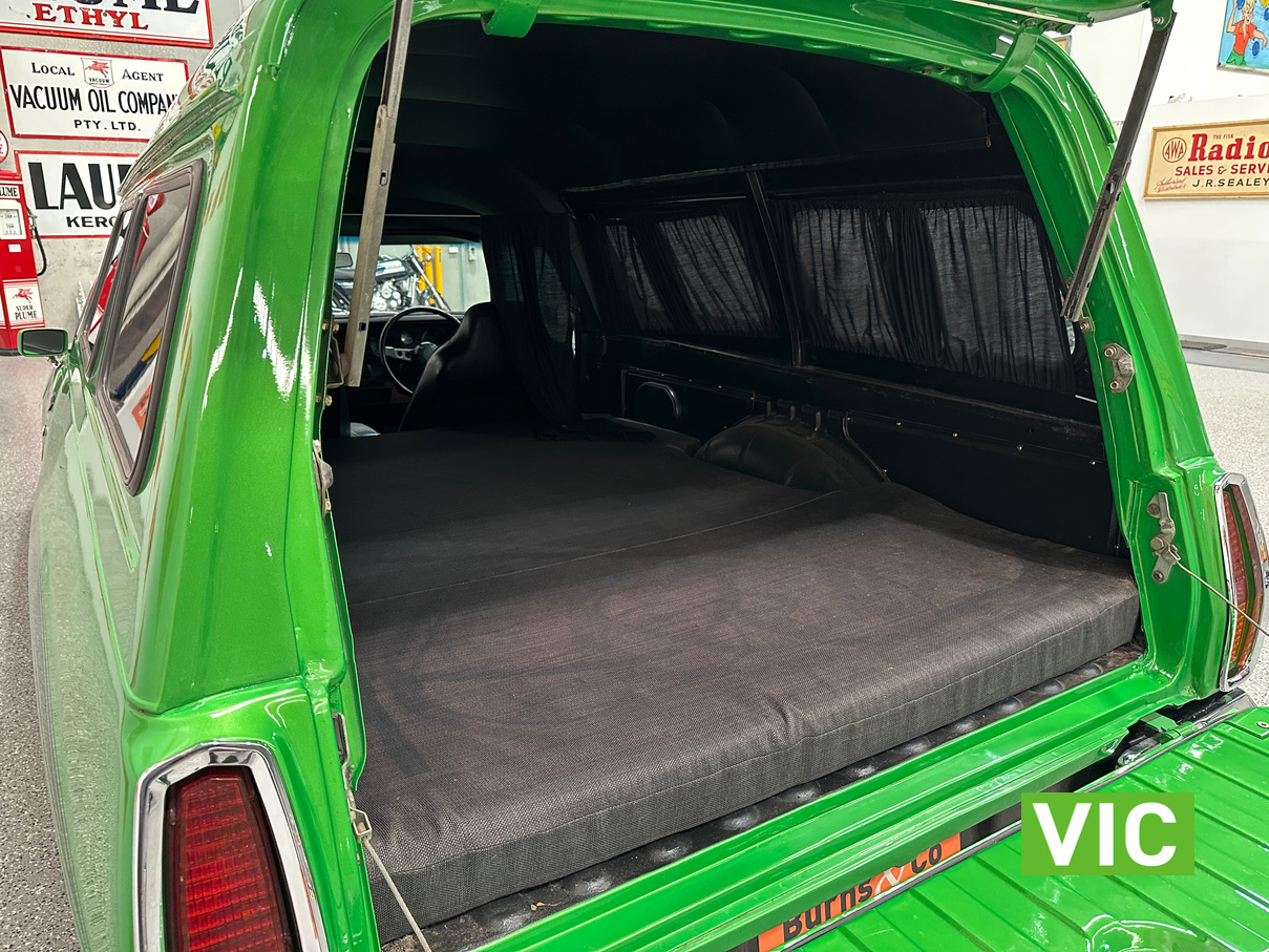 Genuine HJ Sandman Panel Van! Built at Brisbane’s Acacia Ridge plant on December 5, 1975. Sold new by Dustings of Burwood Holden VIC. This is a factory Jamaica Lime with Gazelle trim 253 4.2L V8 four-speed manual car. It is a genuine XX7 plated example confirming it is a Sandman. Fitted with a 3.08 Salisbury diff, Dual-headlight front end and Sandman GTS wheels (widened rear). The body has been fully refinished in a vibrant metallic green, offering a modern interpretation of its original colour scheme.
