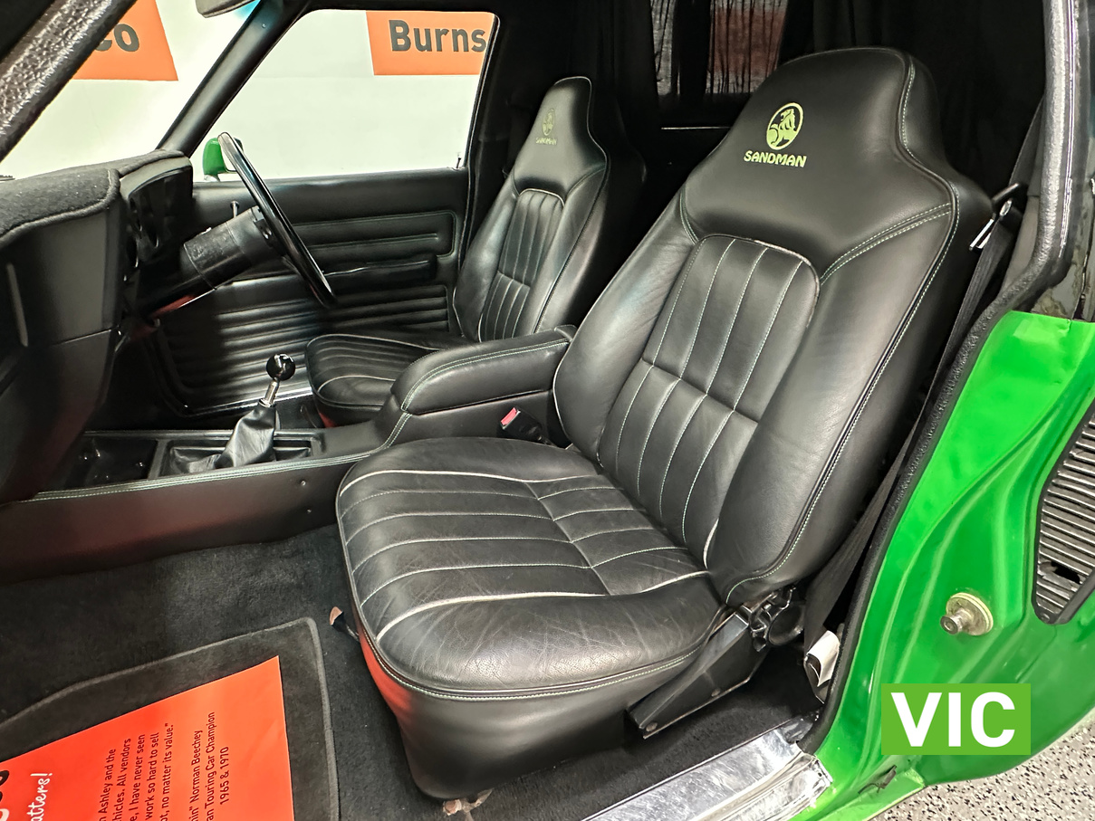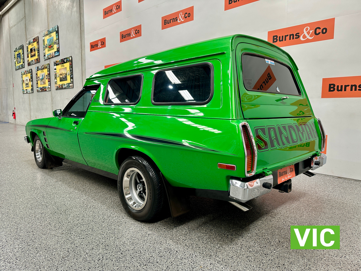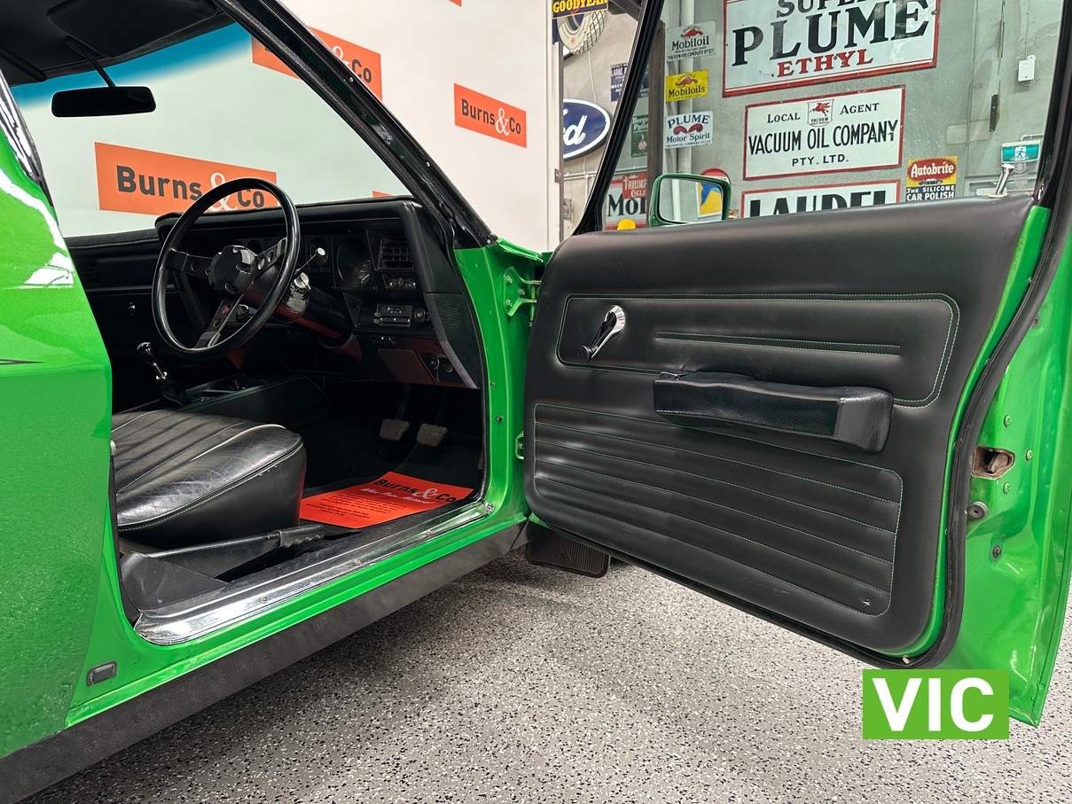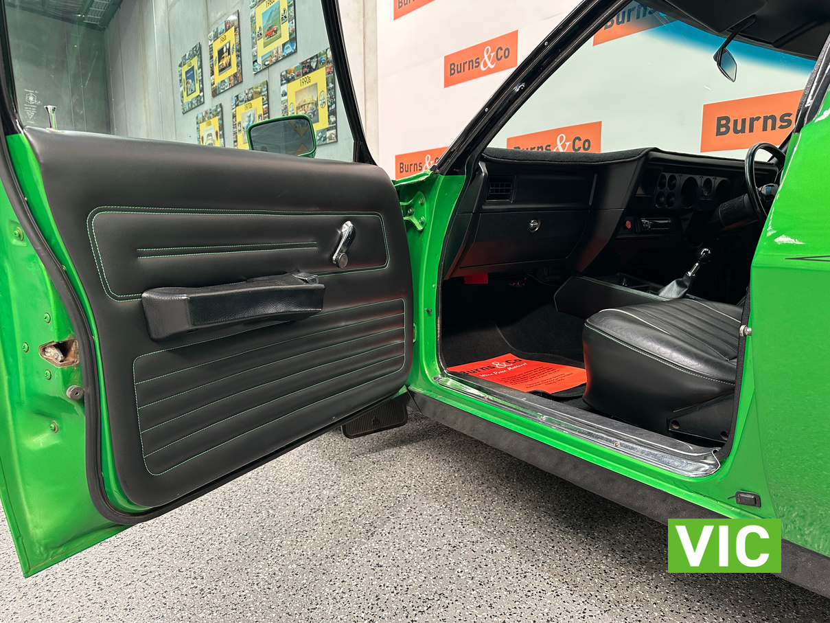 The interior has been retrimmed in black with green stitching with the front bucket seats featuring embroidered Sandman logos with Holden logos on the headrests. Also fitted with the original GTS spec dash and console while being fitted with power steering to make the drive more enjoyable. Under the bonnet sits the 253 V8 that has been upgraded with a mild camshaft, Holley carburettor, and MSD ignition system. The engine is paired with a four-speed manual transmission, now fitted with a new selector and clutch actuator. All suspension components have been replaced including new springs, shock absorbers, and an upgraded sway bar, while all the brakes have been replaced. This is a quality build that is sure to impress.