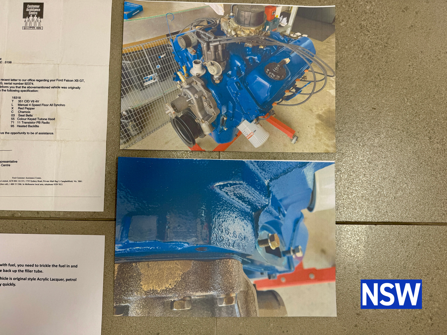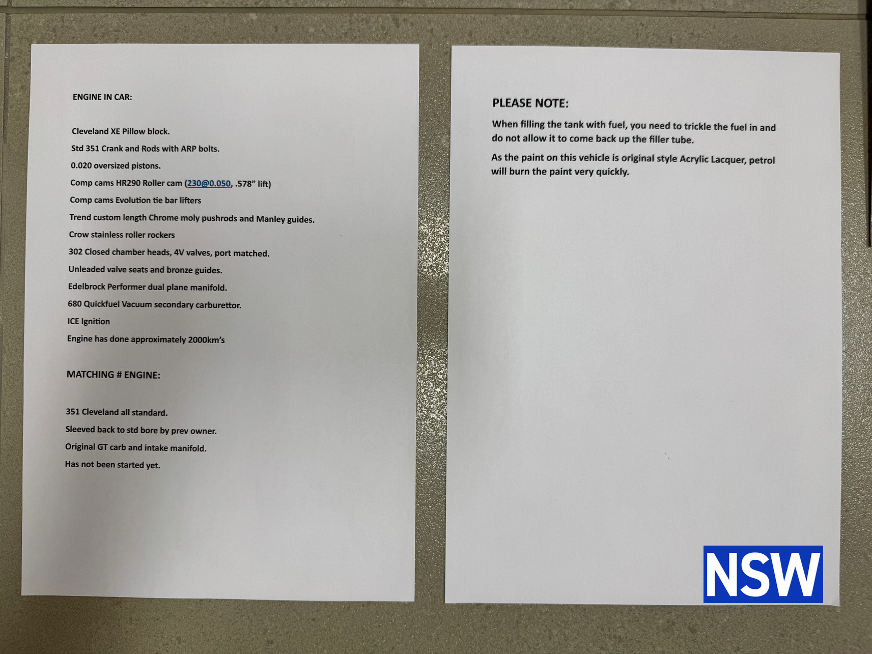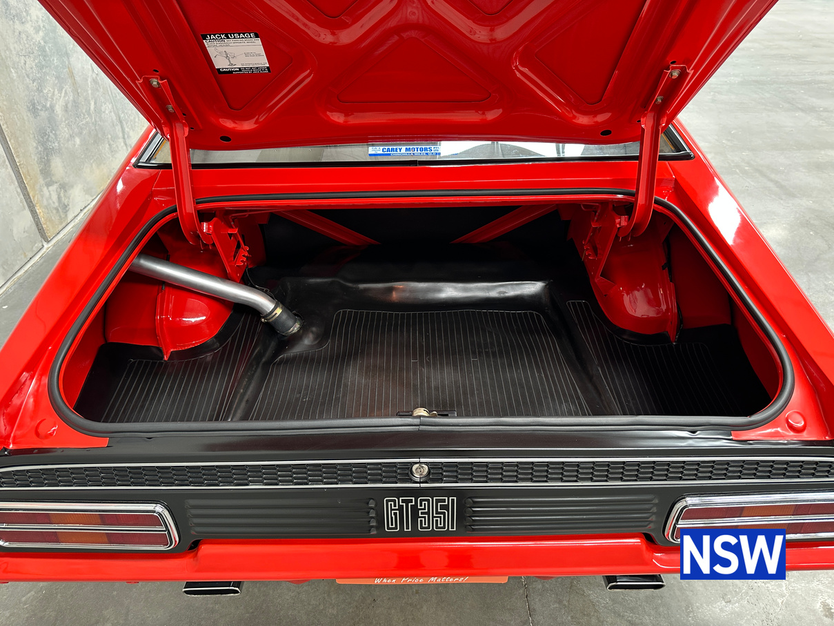 The original matching numbers 351 Cleveland is all standard. Fully rebuilt, sleeved back to standard bore by previous owner, original GT carb and intake manifold and has not been started yet. Original engine is on a stand and the vendor will work with buyer to get it to them and is happy to deliver personally to Qld buyer.