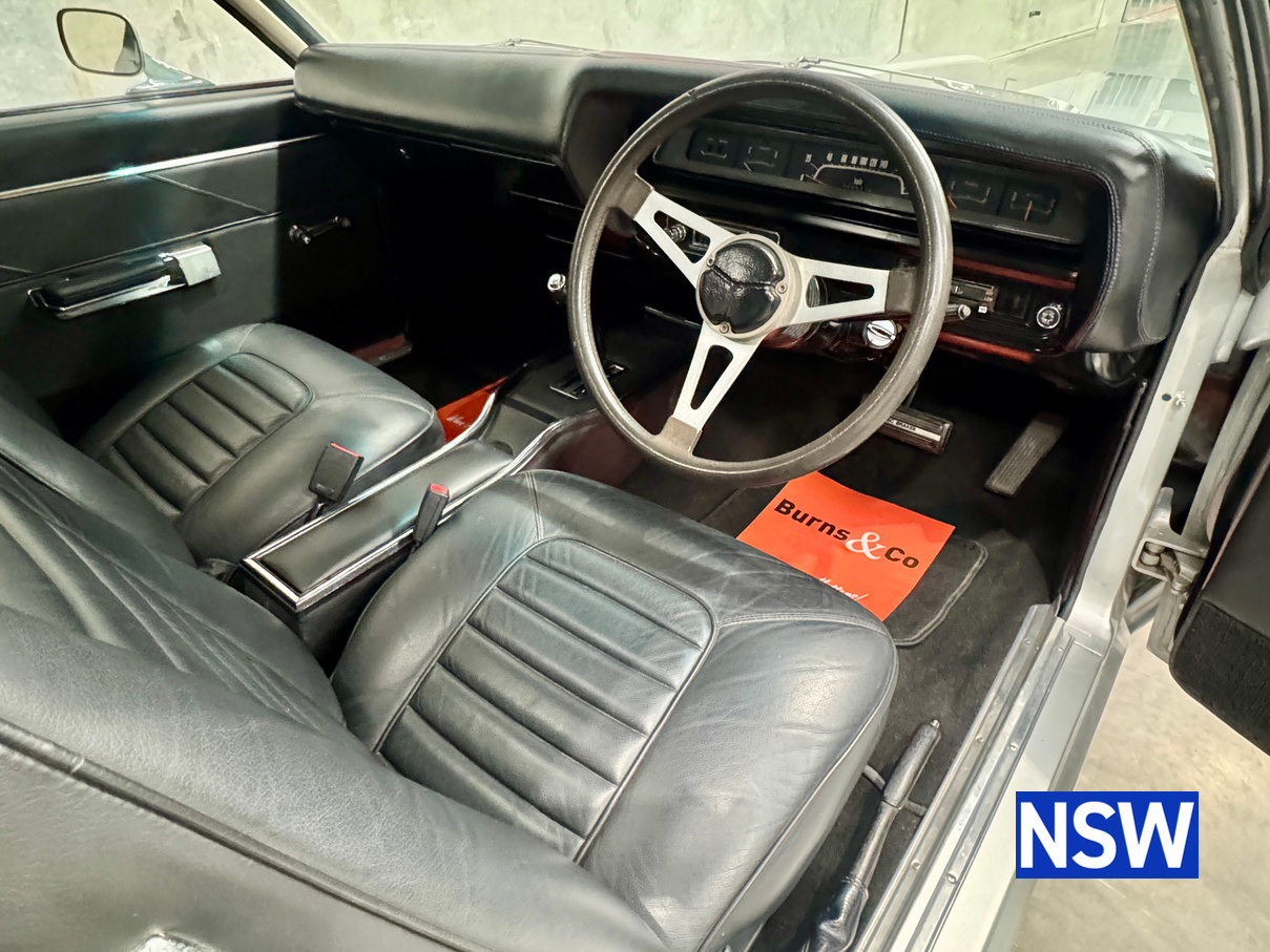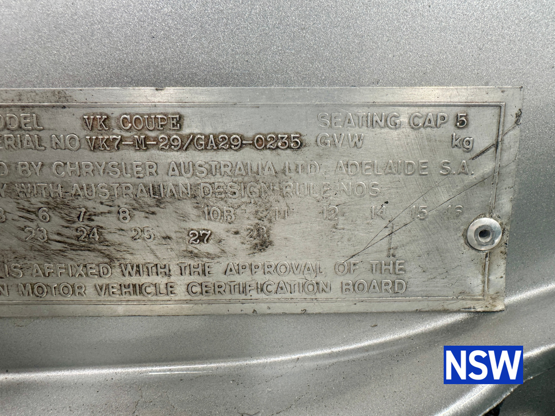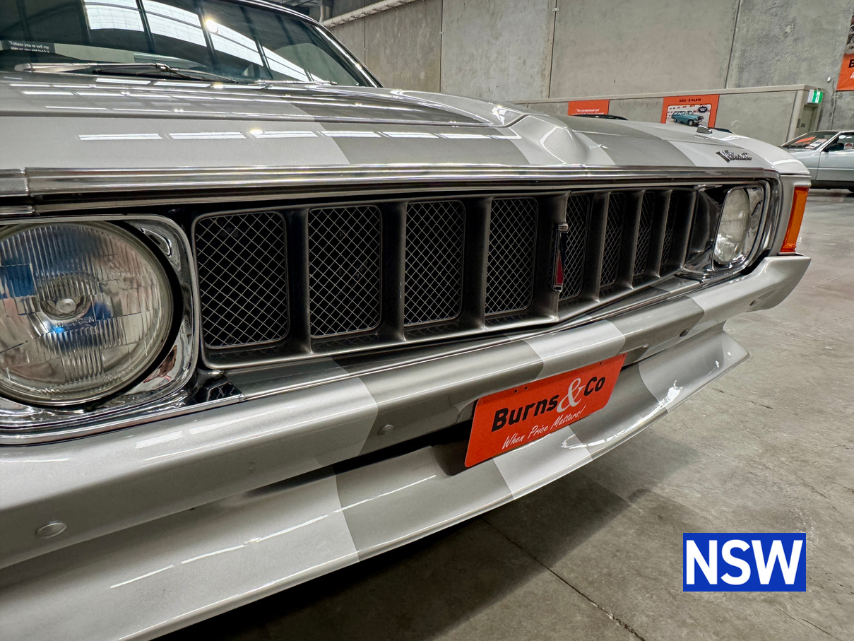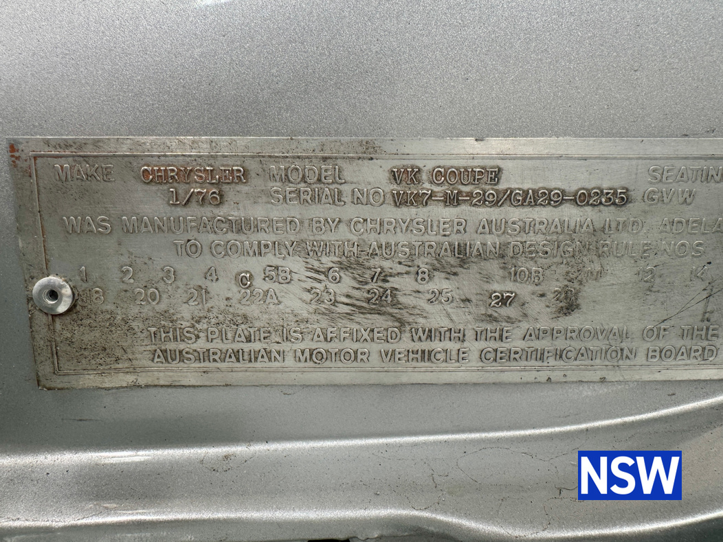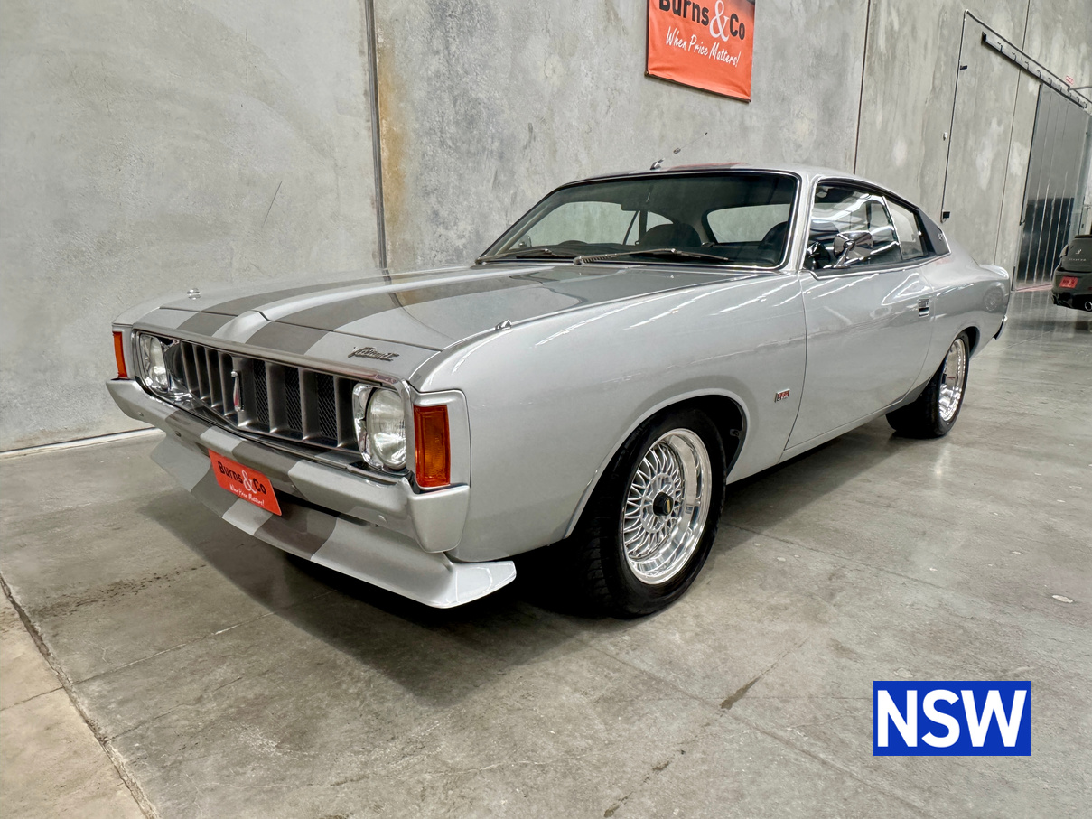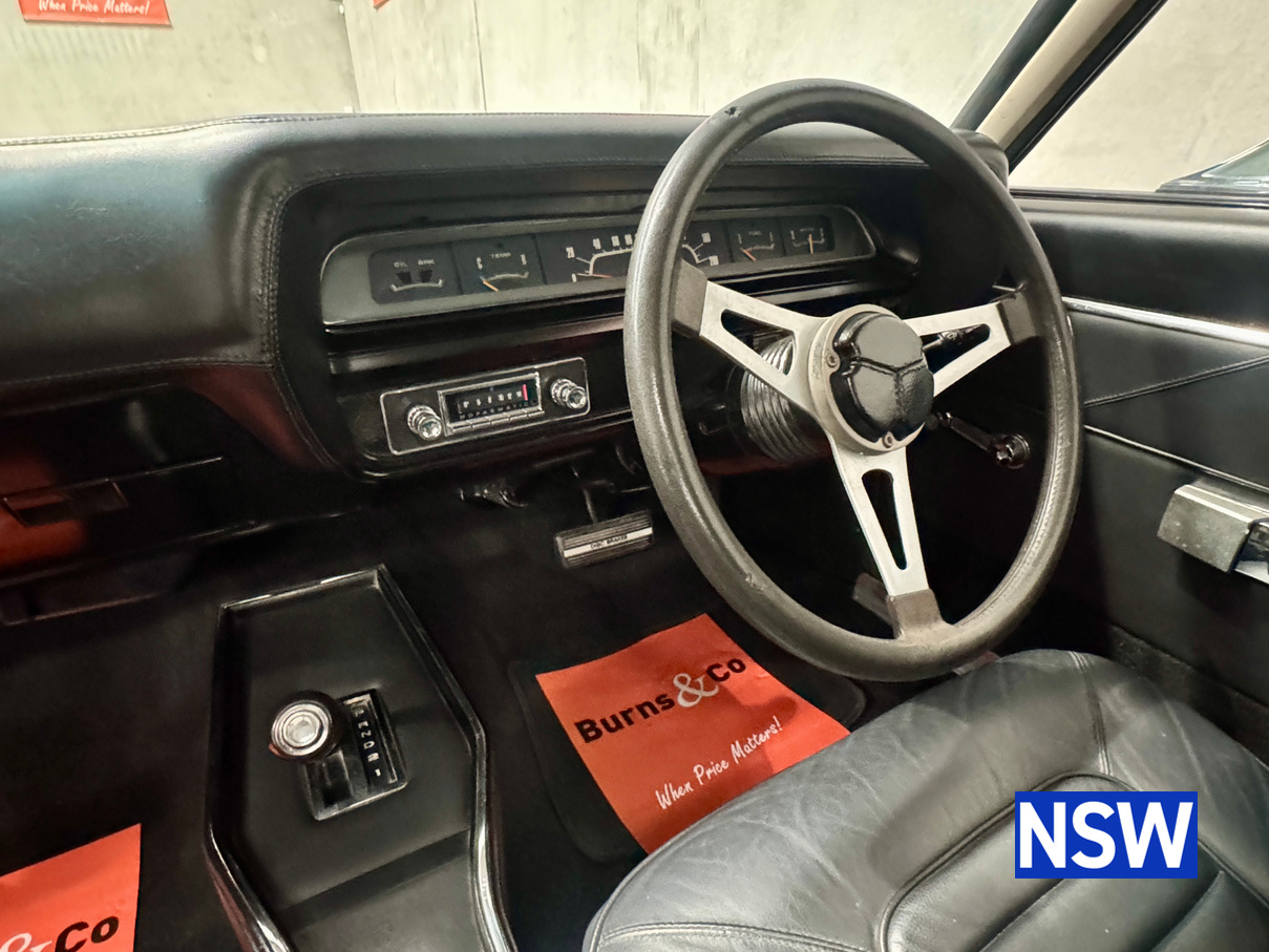 Very well presented 1976 VK Charger, underwent an extensive restoration over 7 years ago by well respected Newcastle body shop Dave’s paint and Panel. No expense spared in the build, its currently running a 360 V8 fitted with a cam and is paired to a 770 transmission. On the inside, it has been fully retrimmed in period black with the off-white roof lining, comes with retro fitted A.C & power steering. This car was factory ordered with the following options, Styled Wheels, Radio, 265 Engine with 2 BBL-Carburetor, 4 Speed Manual Transmission with Floor Gearshift, A/C and Sports Stripe.