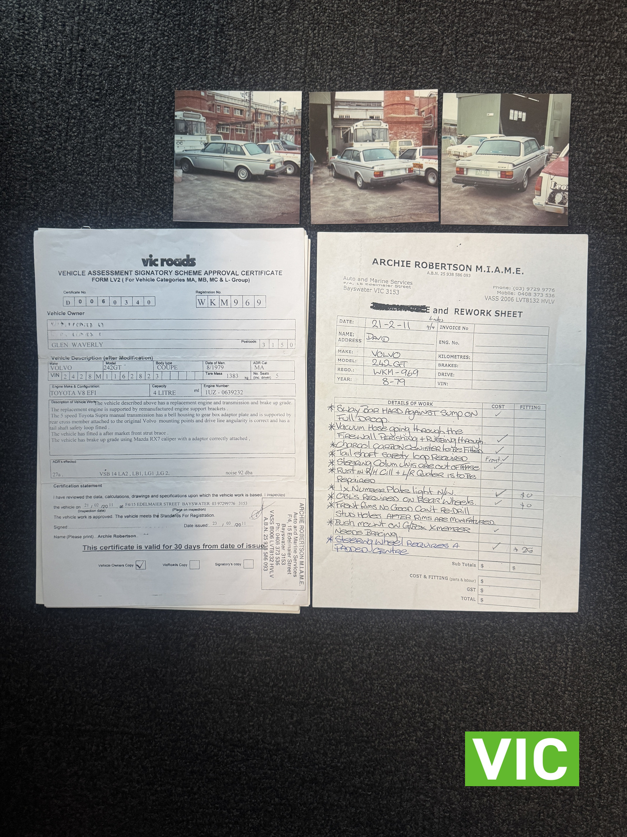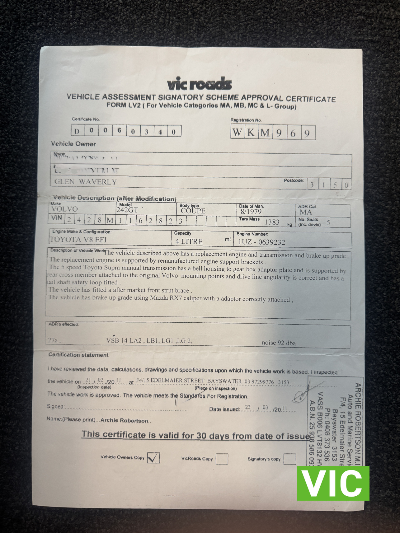 Immaculate and impeccably well built! 8/1979 Volvo 242 GT fitted with a Lexus 1UZ V8 engine paired to a Supra 5 Speed gear box, FULLY ENGINEERED with VASS certificate ready to go!