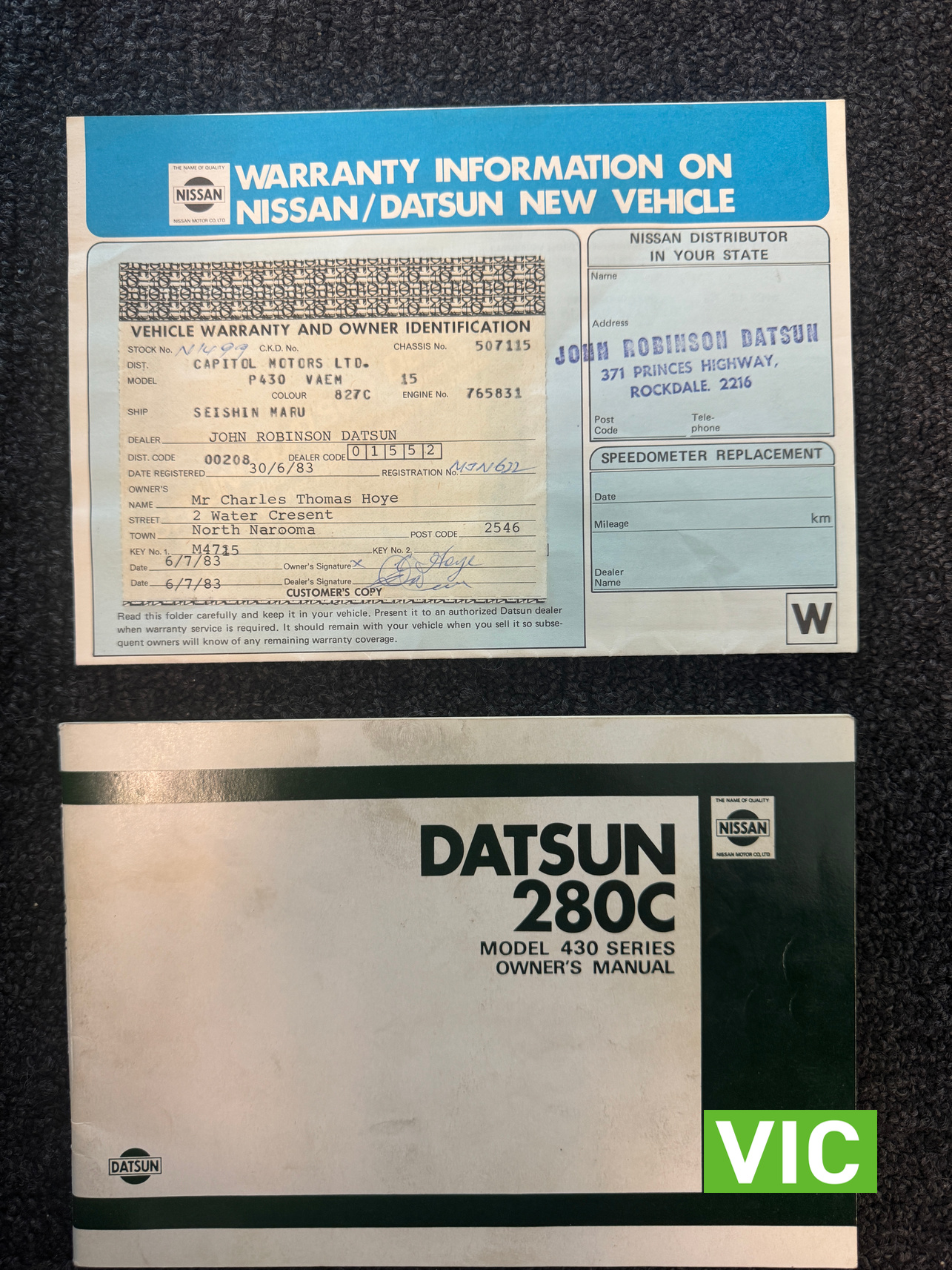 A gentleman’s cruiser! A very well looked after and preserved example of a 1970s Japanese luxury cruiser. When condition means everything to your this is the car to be looking at, the interior is exceptional as is the exterior. Purchased new by Mr Charles Hoye of Narooma NSW from John Robinson Datsun on the 30/6/1983. The vehicle is complete with the original owner’s manual, warranty information card and Datsun wallet. This is a fantastic opportunity to secure a flagship Datsun model that are few and far between especially in this condition. Inspections will not disappoint.