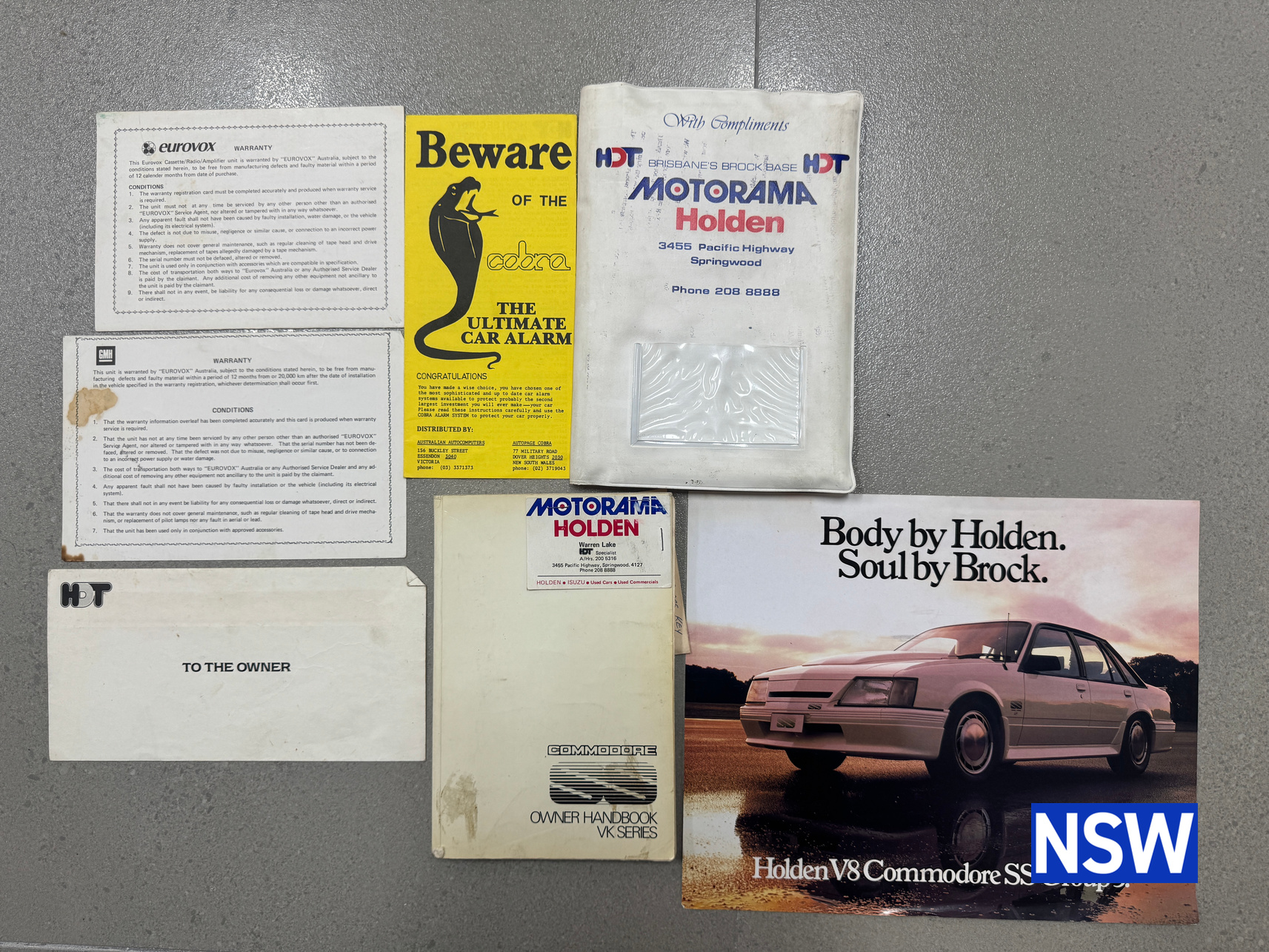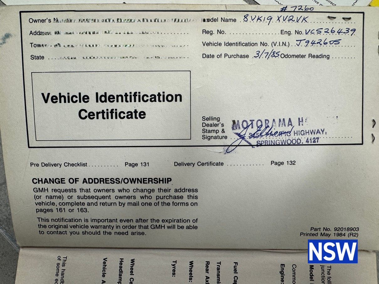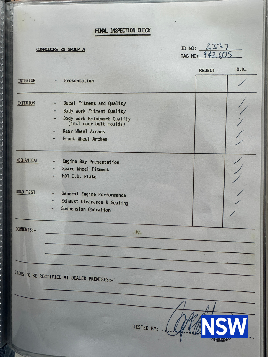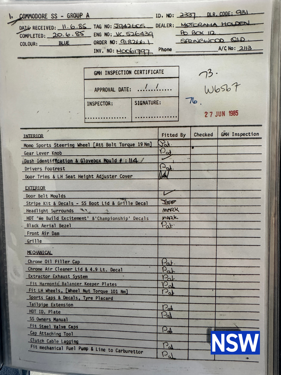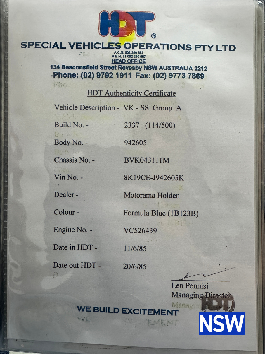 Always a favorite amongst the Holden fraternity, this is a genuine matching numbers VK Group A SS build number 114/500. Sold new by Motorama Holden Brisbane to a Mr G. H. Shoobridge on the 3/7/1985 the original owner’s manual verifying it is a matching numbers example is supplied with the car as is the HDT compendium, Motorama Holden wallet and HDT envelope addressed to ‘The Owner’.