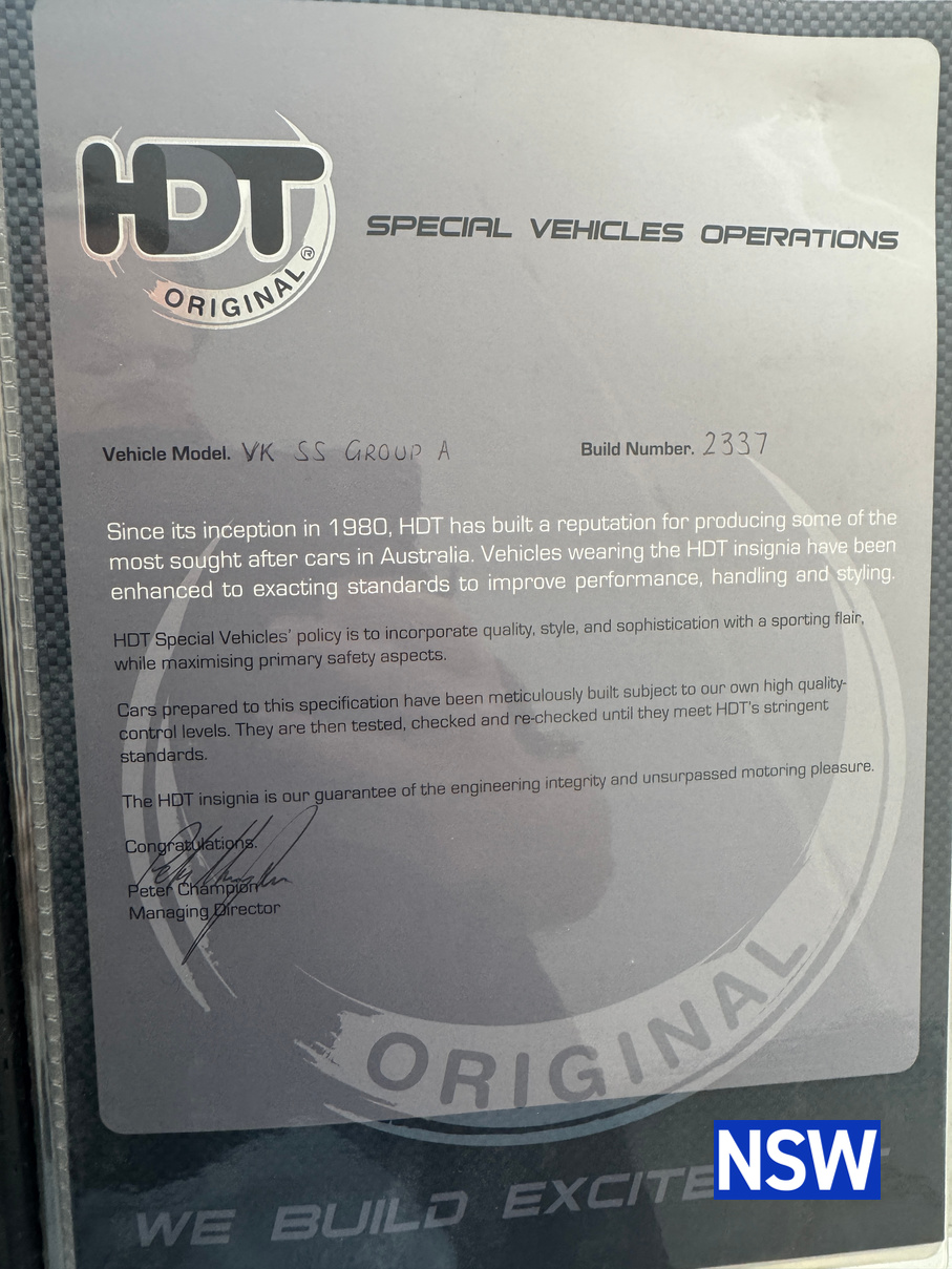 With a current ownership of over 9 years this car has been very well cared for, Inside and out this Group A is a top shelf example, the last genuine VK Group A Burns and Co had the privilege of selling attracted extraordinary attention and was highly sort after at auction. This example should prove no different as the quality and pedigree provided with the car is top notch. Vendor advises the vehicle has notes of being engineered by Ian Tate earlier in its life. Inspections will not disappoint.