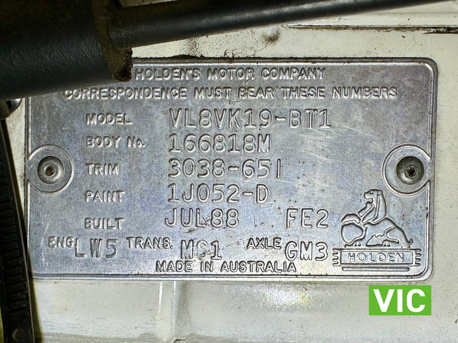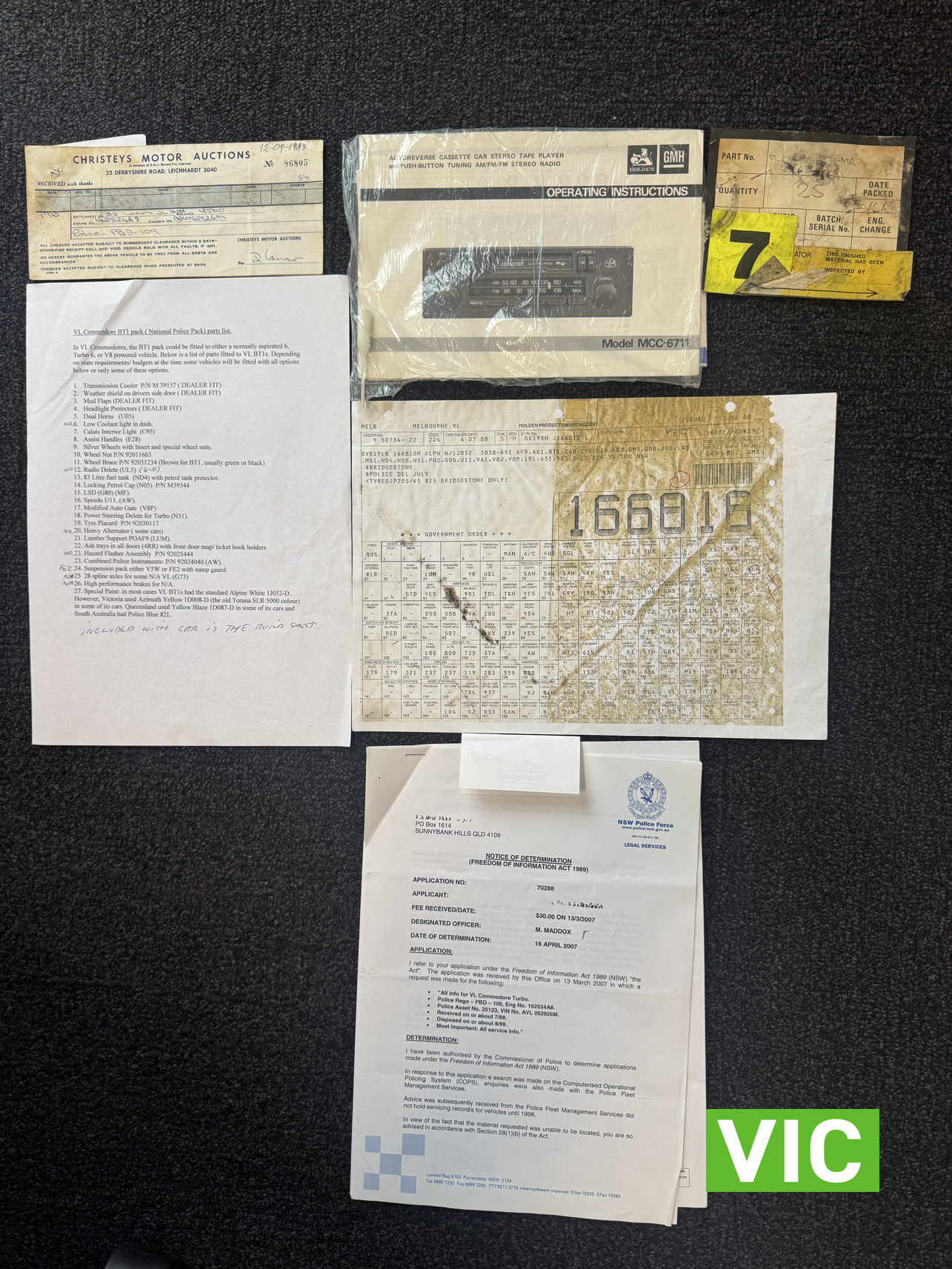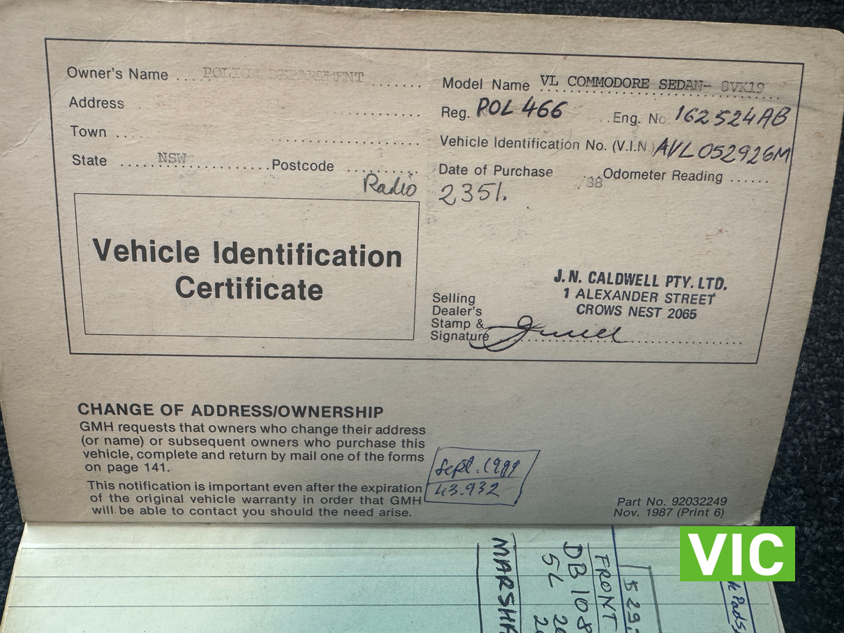This is a collector’s dream, one of the last VL Commodores of the line in July 1988, this one was put into service in August 1988 and was stationed at Queanbeyan until it was retired from the fleet in August 1989. It was sold through Christies Auctions in Leichhardt to its long term owner Mr J Sarles who owned the vehicle up until 2007. Mr Sarles kept a comprehensive paperwork file on the vehicle which included the receipt from when he purchased the vehicle from the auction house, all maintenance receipts, NSW Police report on the vehicle outlining exact dates and details of its service. The original owner’s manual is also supplied with the vehicle. The car was subsequently sold in 2007 to Mr P Taylor who lovingly cared for the car for many years and collected as much information about the car and its history as possible. The car is a VL Turbo that hasn’t been messed with, still fitted with the original ignition leads, sandalwood interior and even containing some of the original police fit out. This is definitely one for the collectors and will not disappoint for the enthusiast wanting an unmolested example.