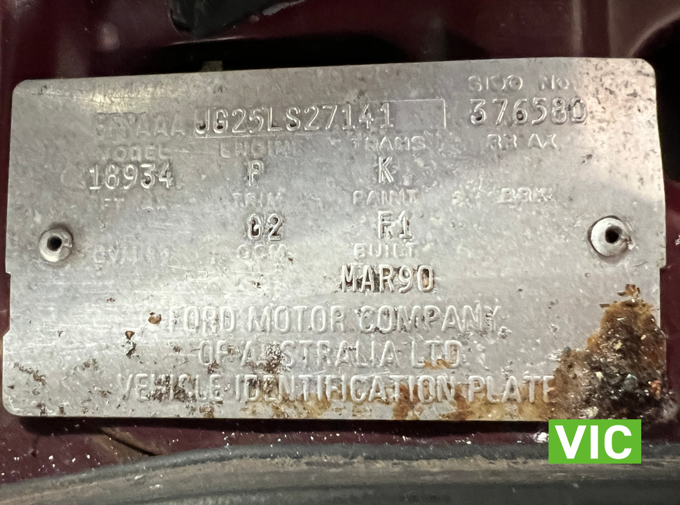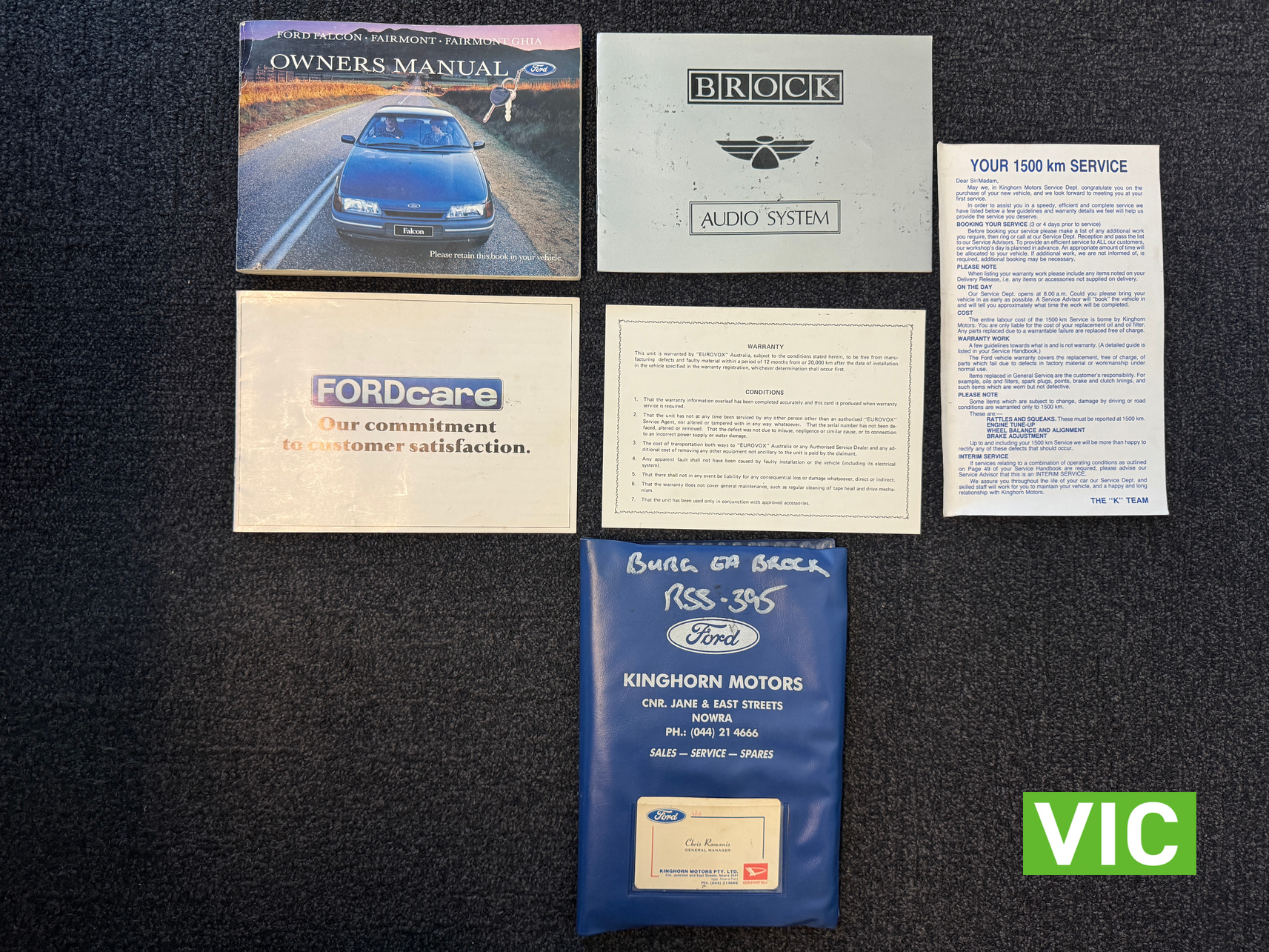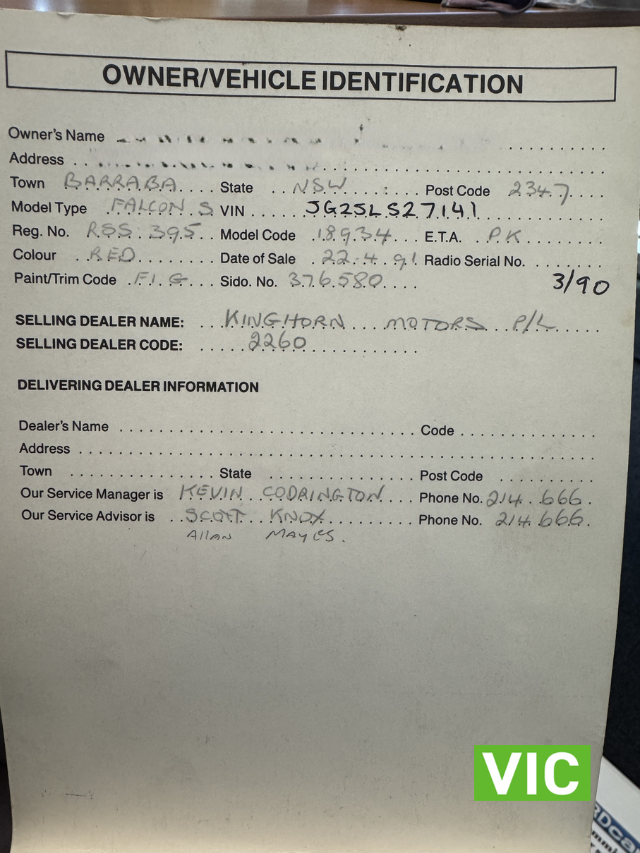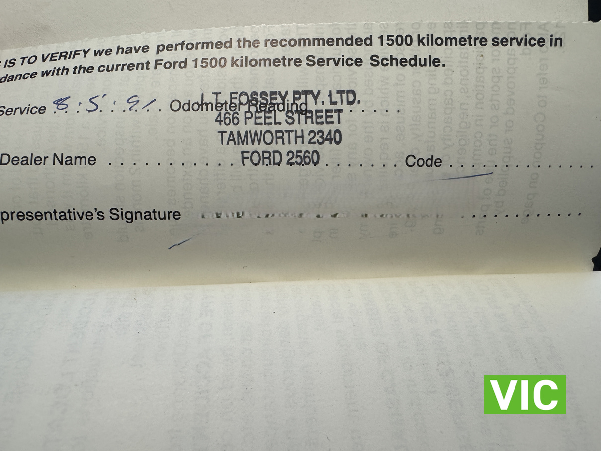 This one is a 3/1990 Falcon S trim, fitted with the multi point fuel injected 3.9 Litre 6 Cylinder engine, paired to a 5 speed gearbox. Complete with the owner’s manual and wallet, it indicates that it was sold new by Kinghorn Motors Ford in Nowra NSW to Mr Mark Wentworth Hodgson of Barraba NSW.