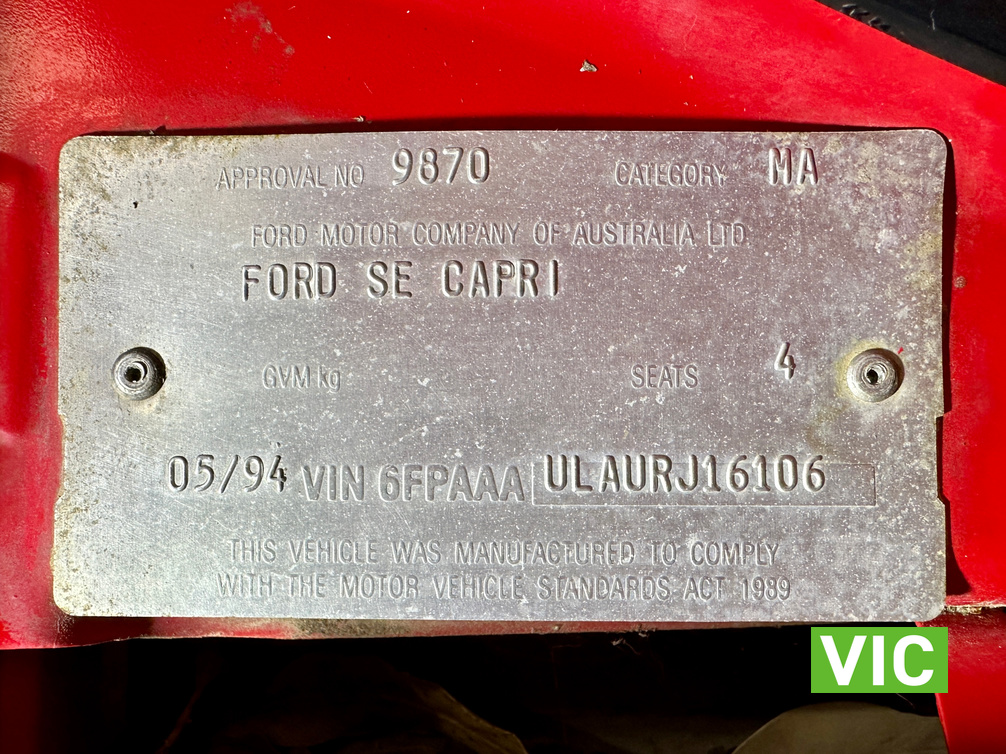 Sold new by Jeff Wignall Ford of Mornington on the 9/8/1994 and owned by the vendor for over 8 years. Being built in the 10/94 it is the last month and year of manufacturing for the Capri.