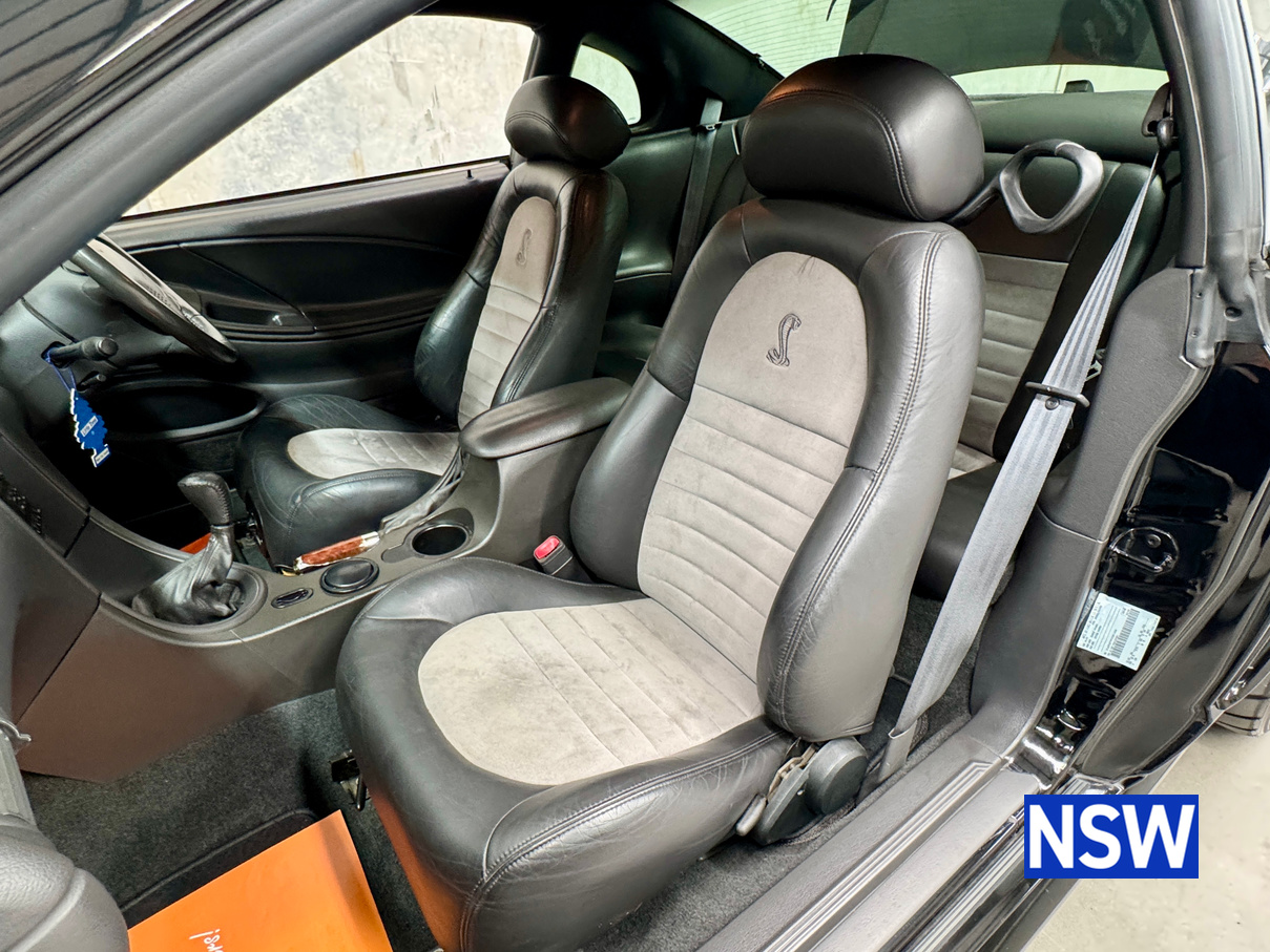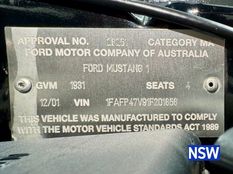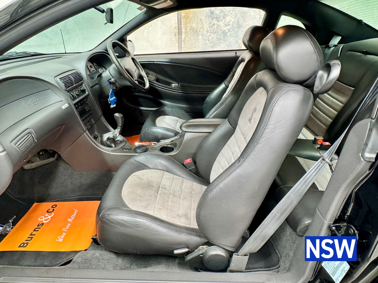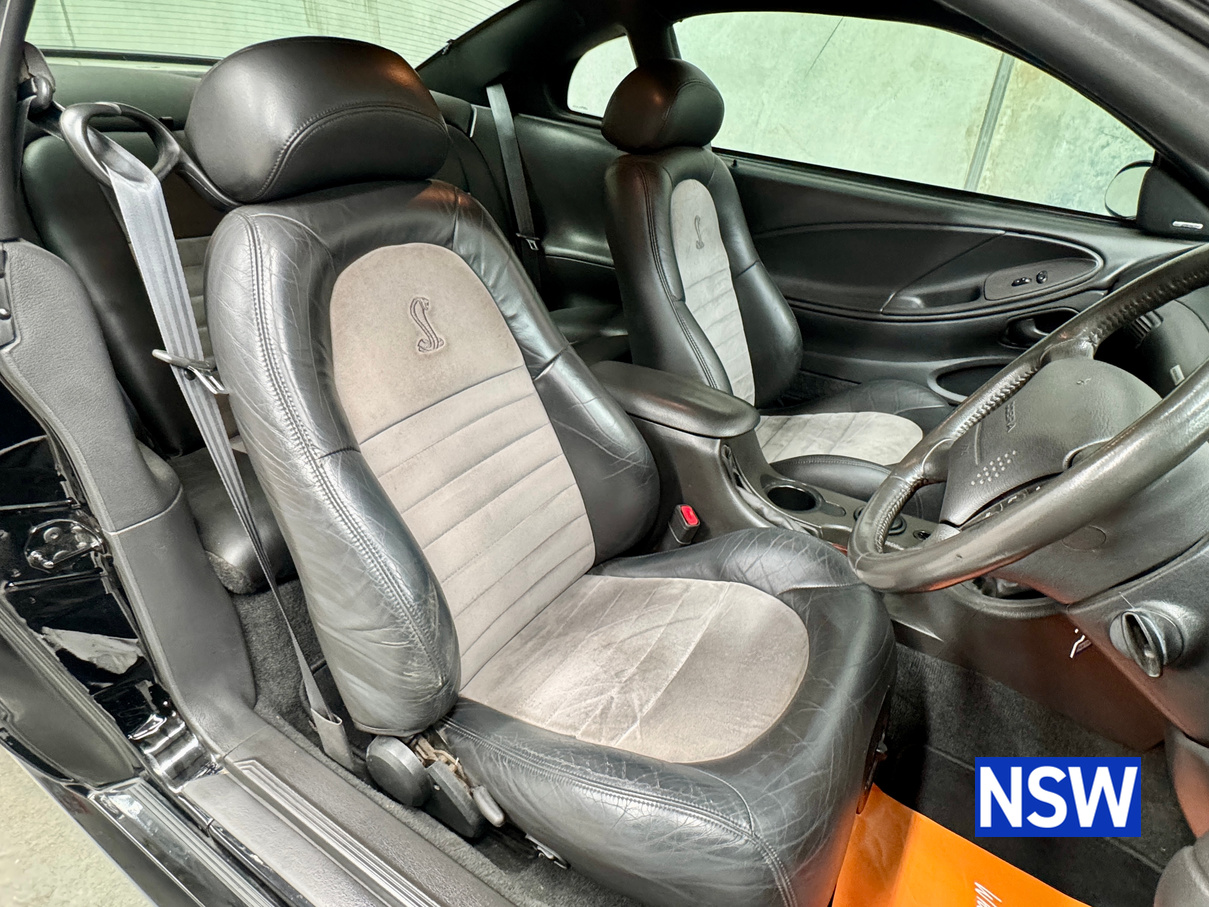 These SVT Mustangs were imported from the USA by Ford Australia and converted to RHD by Tickford Engineering in 2001 to combat the sales of the new CV8 Monaro of the time. This is one of approx 300 imported and 1 of 6 in this colour combination. Driven as a daily driver up until 2008 and then stored for 8 years. Then put back on the road and enjoyed as a weekend car and taken to car shows and motoring events. Fitted with Mustang Bullitt style wheels (18×9 front / 18×10 back), Cold Air Induction System (CJ Pony Parts USA), Hi Flow Cats & Mufflers with dual actuators, 4.1 Diff Gears, P-ISC Procharger Supercharger, Haltech Elite 2500, Bigger Fuel Injectors, Hi Volume Fuel & Booster Pump, Mechanical Restoration, New Fuel Tank and Lines, New Front Diff Bushes, New RHR Wheel Bearing Assembly, New Rear Brake Rotors and New Rear Knuckle Ball Joints.
