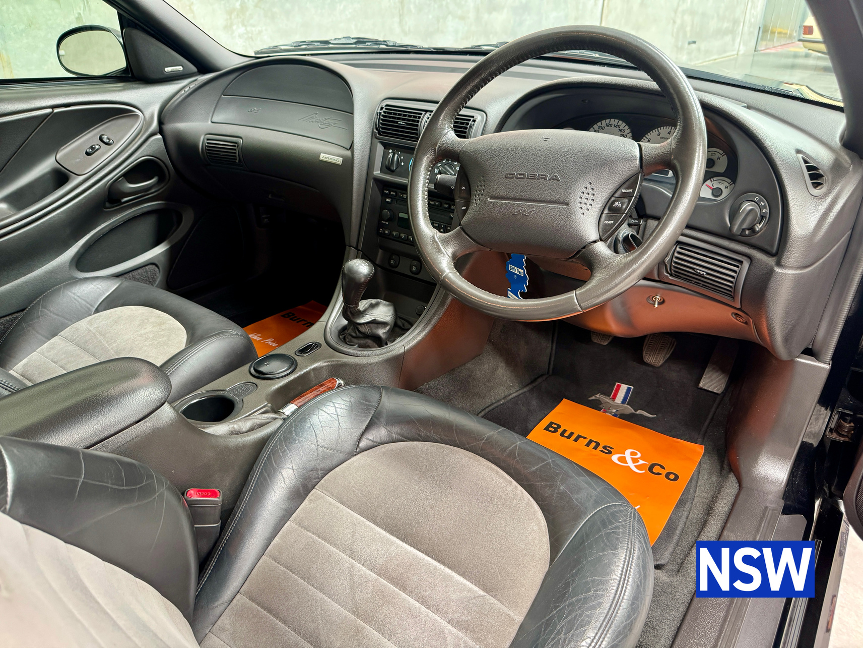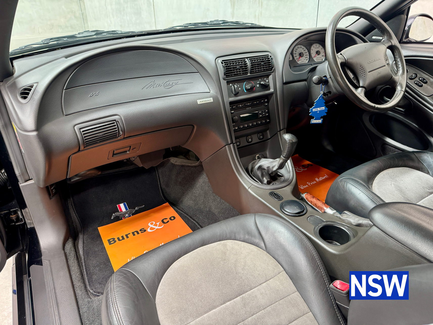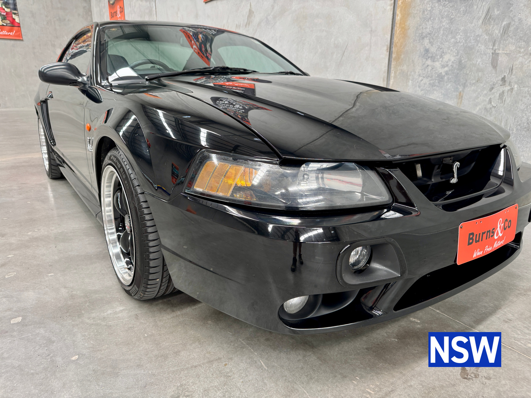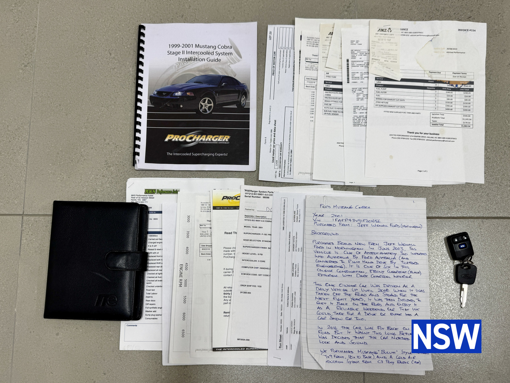 These SVT Mustangs were imported from the USA by Ford Australia and converted to RHD by Tickford Engineering in 2001 to combat the sales of the new CV8 Monaro of the time. This is one of approx 300 imported and 1 of 6 in this colour combination. Driven as a daily driver up until 2008 and then stored for 8 years. Then put back on the road and enjoyed as a weekend car and taken to car shows and motoring events. Fitted with Mustang Bullitt style wheels (18×9 front / 18×10 back), Cold Air Induction System (CJ Pony Parts USA), Hi Flow Cats & Mufflers with dual actuators, 4.1 Diff Gears, P-ISC Procharger Supercharger, Haltech Elite 2500, Bigger Fuel Injectors, Hi Volume Fuel & Booster Pump, Mechanical Restoration, New Fuel Tank and Lines, New Front Diff Bushes, New RHR Wheel Bearing Assembly, New Rear Brake Rotors and New Rear Knuckle Ball Joints.