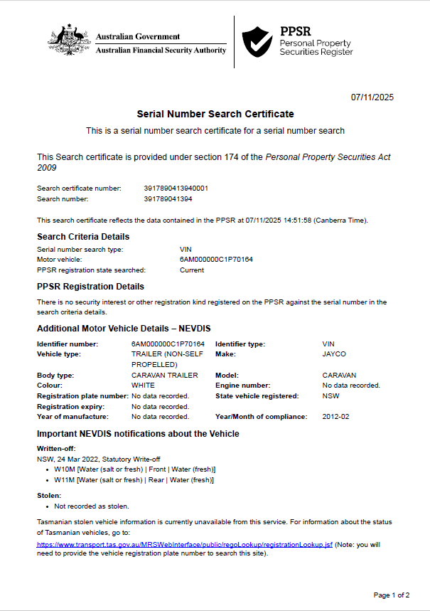 Jayco Sterling Caravan. Statutory write off due to flood damage. Approximate dimensions are 7.9M (26ft) total length, 6.7M (22ft) cabin length, 2.1M (7’6ft) width, 3M10ft height with an internal height of 1.9M (6’6ft).