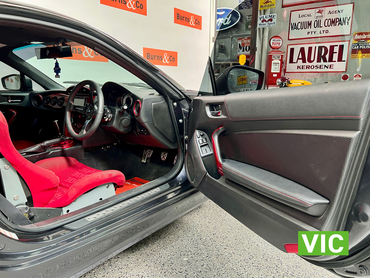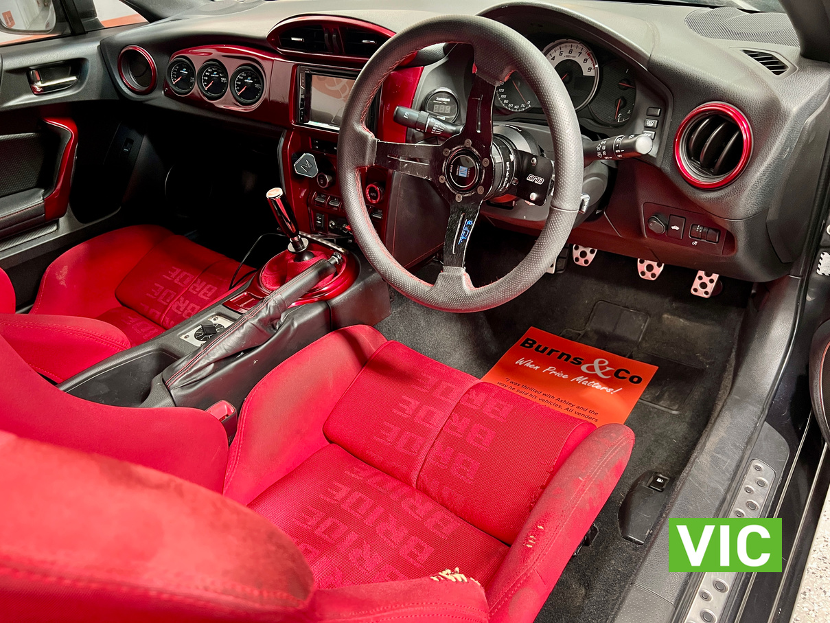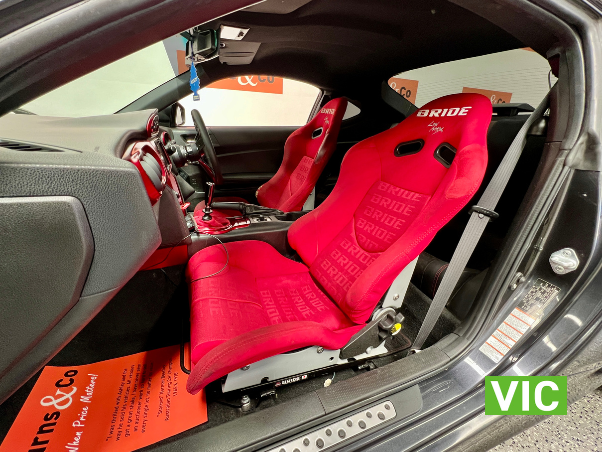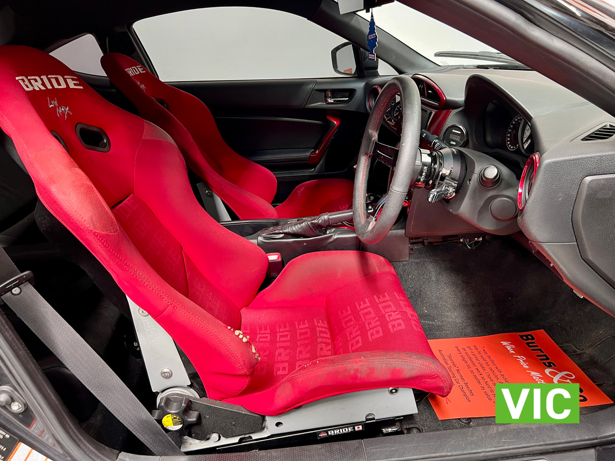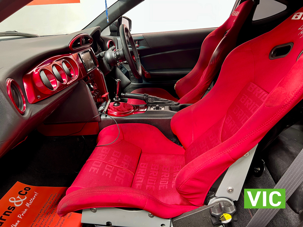 Vendor advises the following work has been completed, Fitted with a widebody V2 from Carbon Plus in Clayton, The body has been fully repainted in the factory Toyota colour of 61K tornado grey. Full ZSS lower control arms adjustable tie rod ends adjustable ZSS rear trailing arms, TEI 355mm drilled and slotted six pot front brakes and 284 mm four pot rear Brakes, full HKS turbo kit, the works injectors fuel pump, standalone emtron ECU nine point, rotary dial with four port solenoid, boost controller Custom 62 mm boost oil, pressure water temp gauges on 3-D printed dial to turn off and on as well as under glow kit and LED they running lights. Also fitted with full front and rear air BFT Air Bag Suspension with 5 gallon tank, twin V4 40 compresses in custom boot set up with $4000 custom stereo wireless CarPlay 12 inch box in Custom boot set up with varnished wood case. The exterior is fitted with Valenti front & rear LED headlights and tail lights with sequential LED $700 side indicator lights, genuine Ssr’s two piece semi forged 18 inch rims. All tuning done by Justin at Revzone performance and all work on the motor carried out by Justin registered and certified HKS representative. Vendor has advised that the vehicle has travelled 57,000 genuine kms, partial logbook history is also supplied with the car. The interior is fitted with Bride Lomax seats..