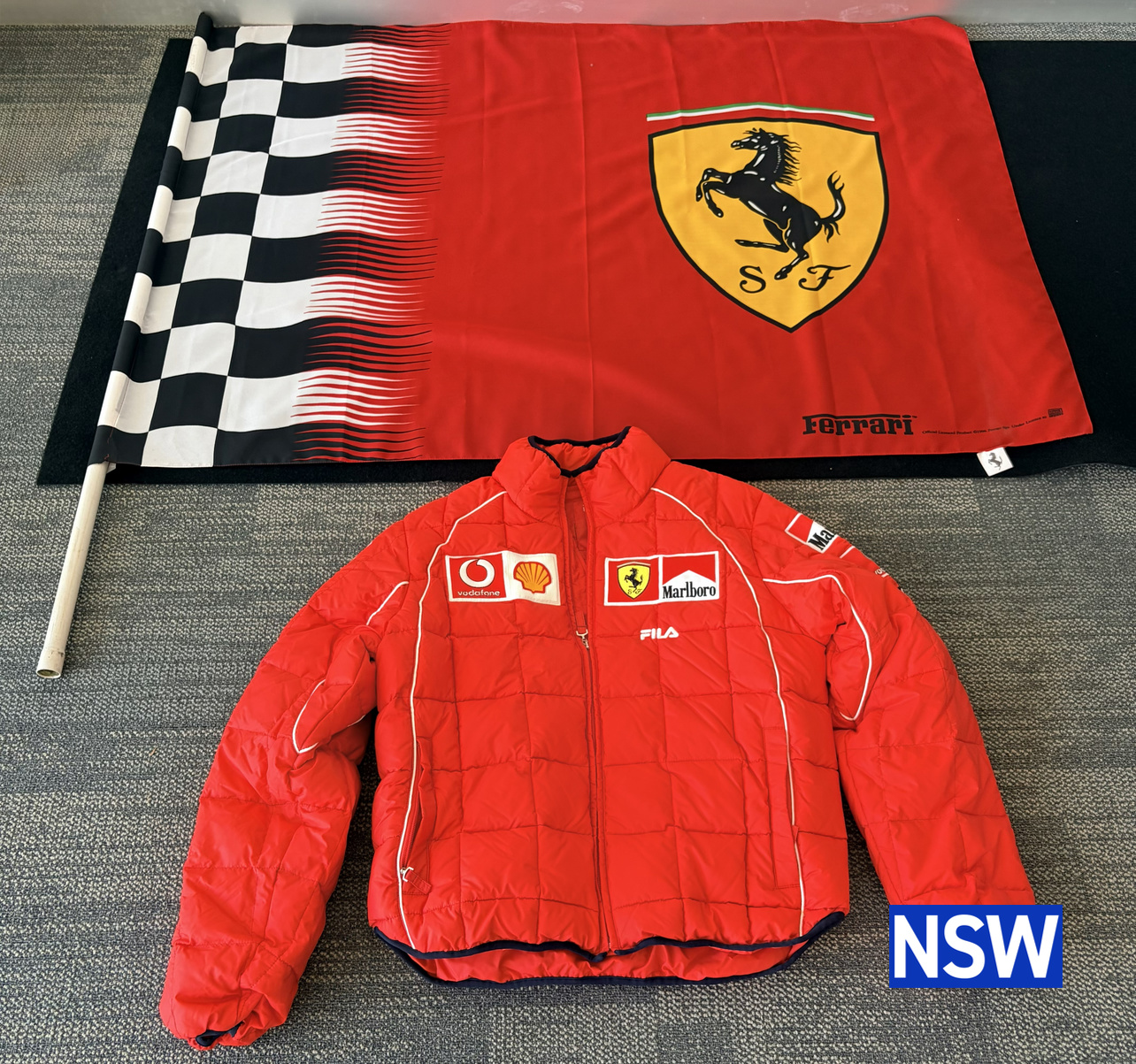 Ferrari-branded red jacket (Size M) with embroidered badges, paired with a matching Ferrari flag featuring the iconic prancing horse and checkered detail.