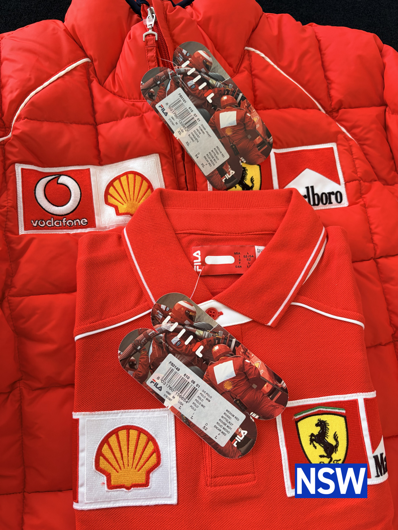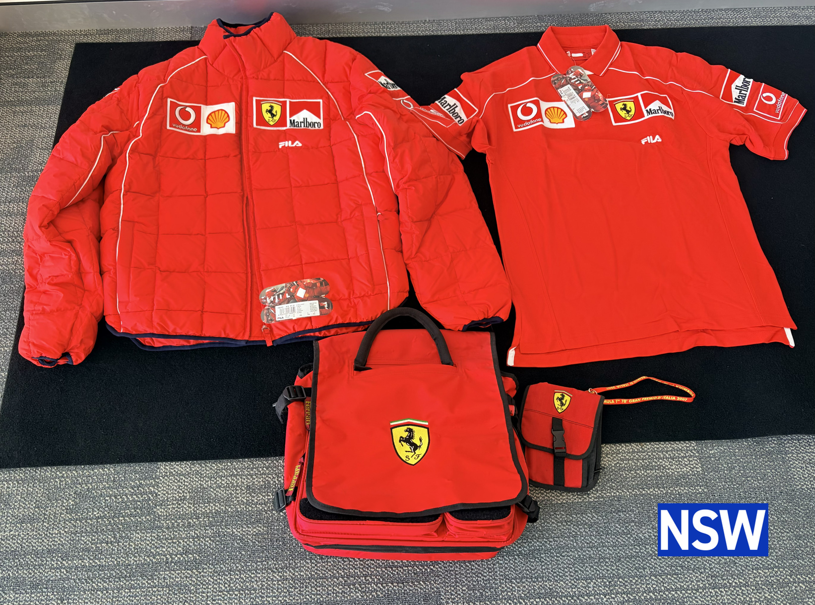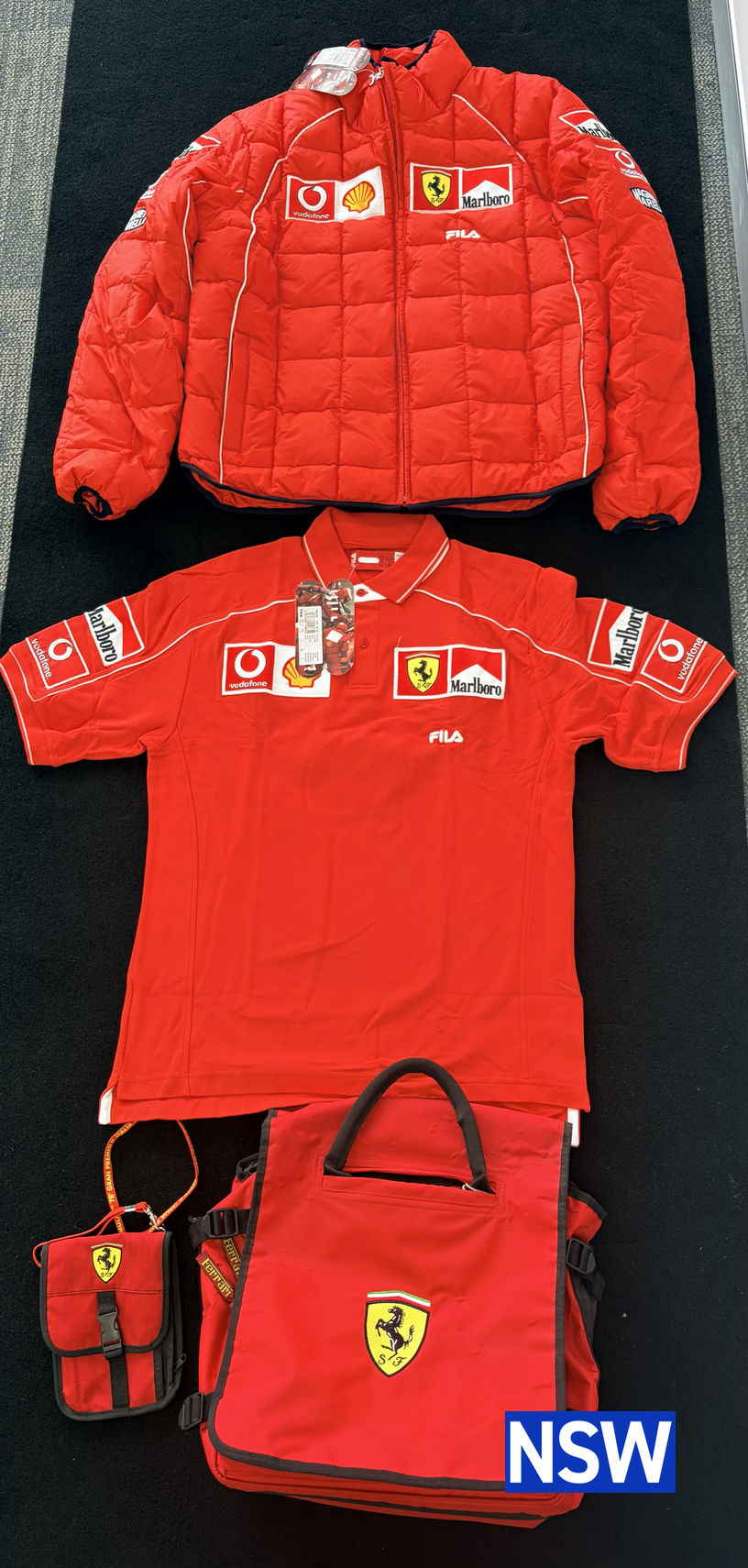 Ferrari-branded set comprising a red jacket, matching shirt and Ferrari bag, all featuring embroidered logos and motorsport styling.
